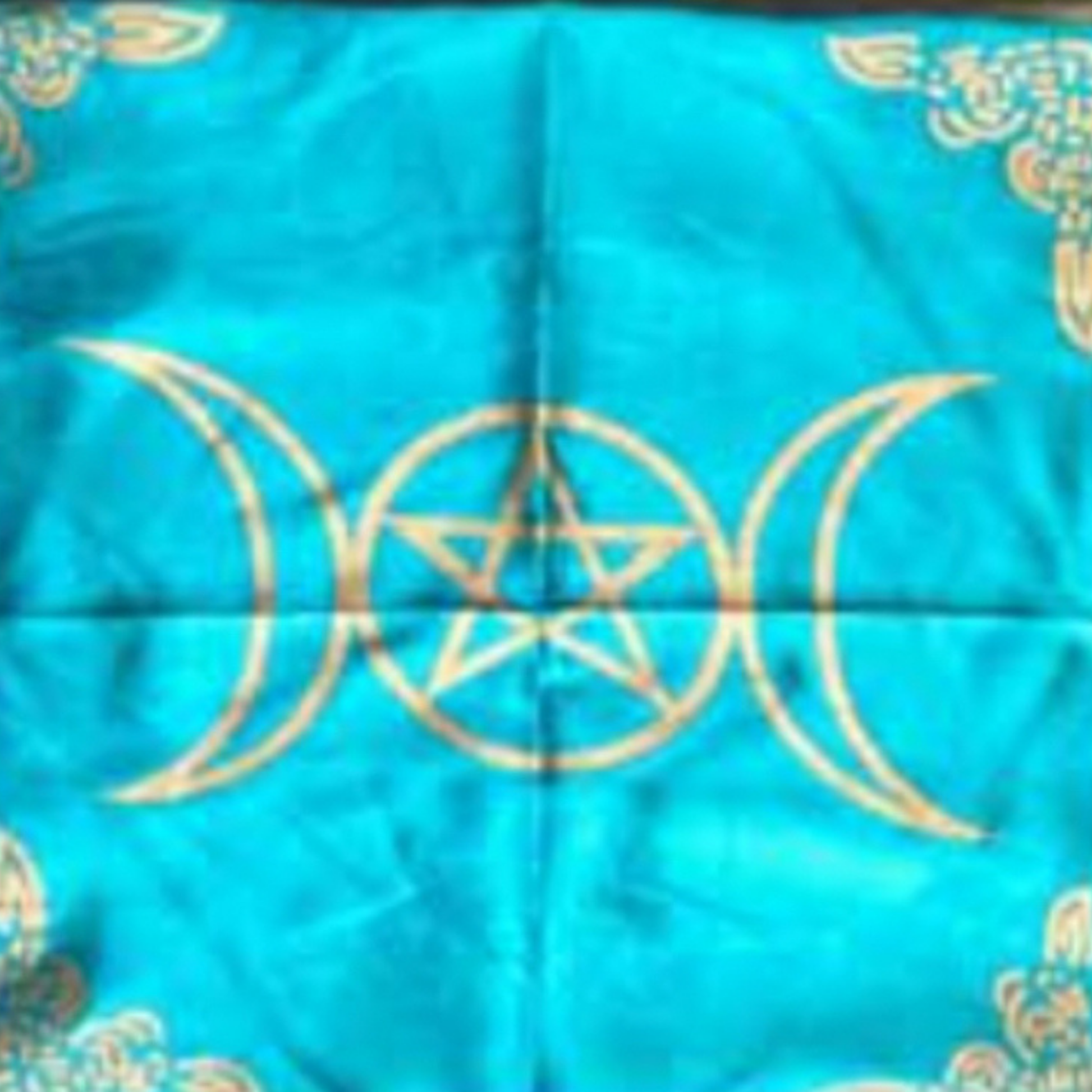 This gorgeous Triple moon altar cloth has a turquoise background with a shimmering gold design. These are excellent for altar, hung ornamentally or as a small scarf accent. These are also excellent for a tarot or divination cloth.