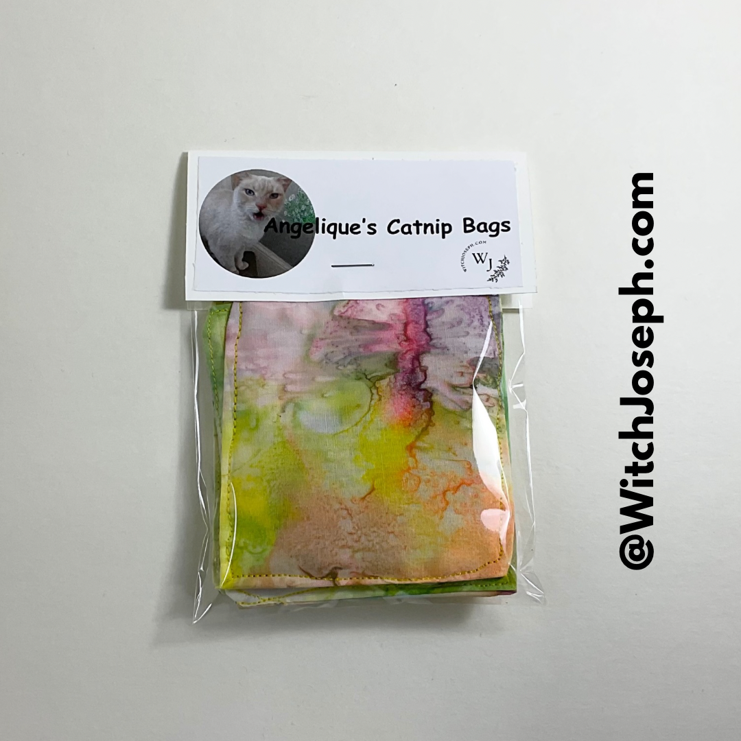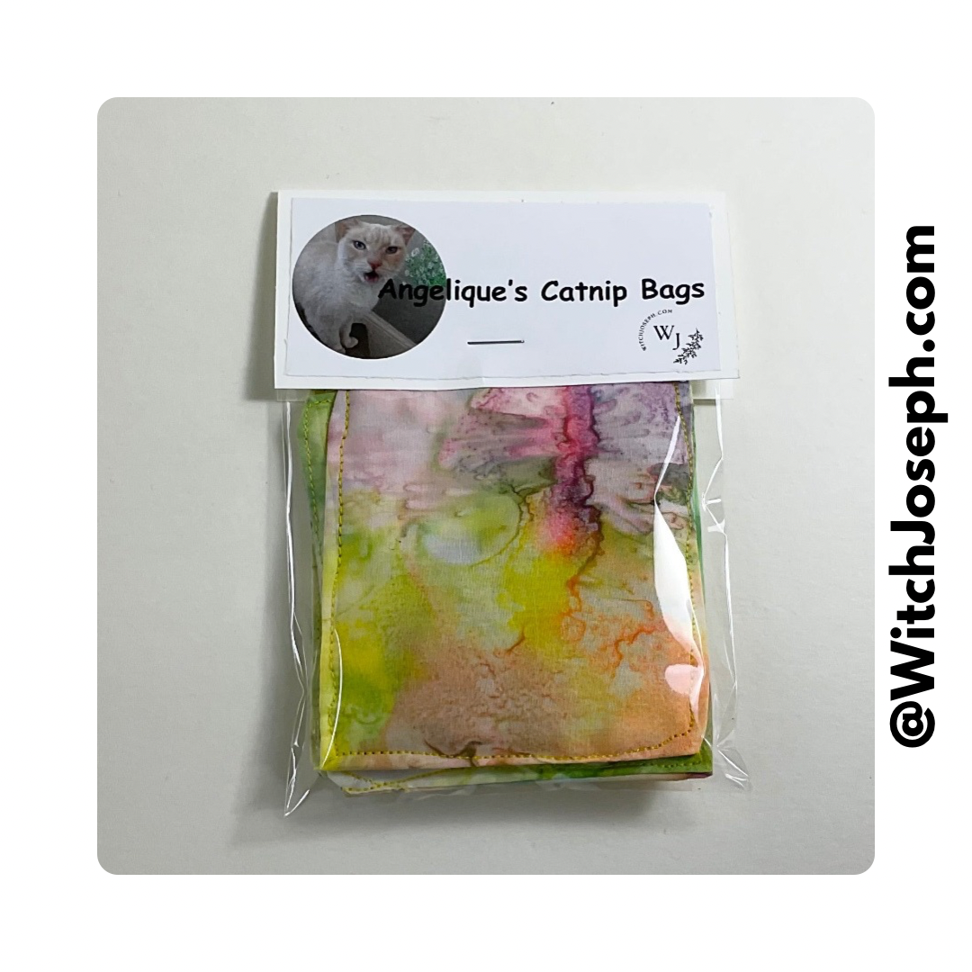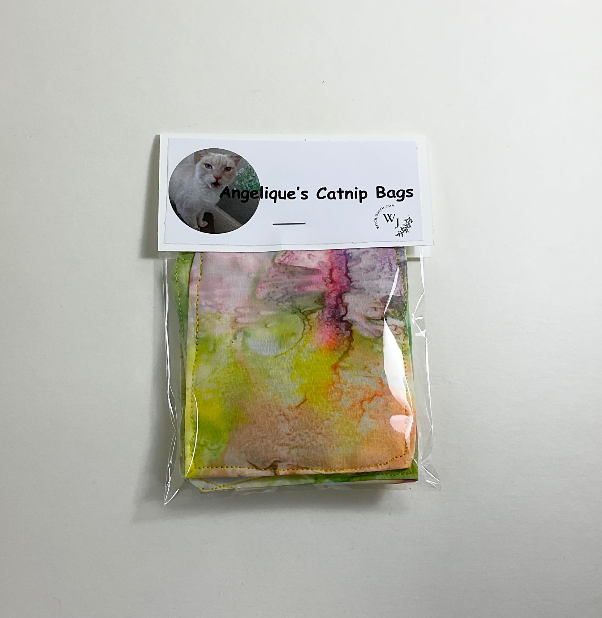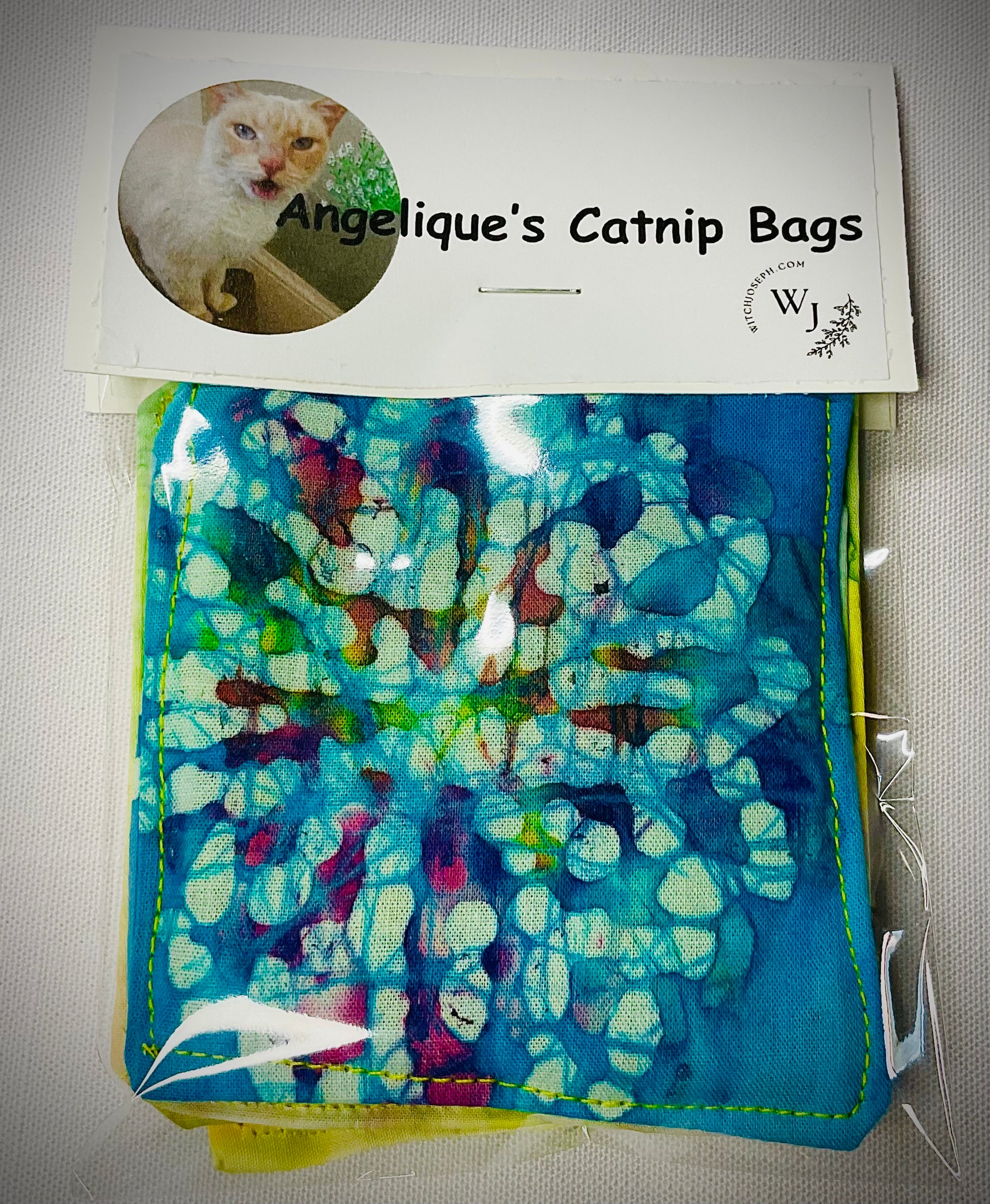 Each pack comes with four of Angelique’s catnip bags (approximately 2.5”x2.5”…some variation)…each containing approximately 1 tablespoon of “The Cat’s Meowee” premium grade certified organic catnip. Very fragrant…and Angelique tells me it’s quite potent. She goes wild for it and loves her catnip bags. She likes to chew them and fling them around with her sweet little paws and mouth…so these bags come cat inspected and Angelique approved.