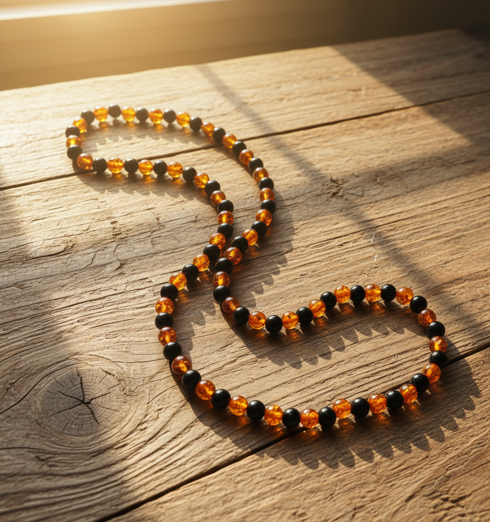 This necklace uses a lovely autumnal orange amber (cognac). Jet and Amber are believed to cultivate and channel high vibrational energies for magick and healing…both derived from the decomposed and fossilized remains of trees from millions of years ago (the Jet deposits were formed more than 150 million years ago.). Like Amber, Jet is known to produce an electrical charge when rubbed. It is said to correspond to the root chakra and is considered very grounding and protective and is believed to rid the energy field of negative energies. Baltic Amber dates to 44 million years ago and has been determined to be the fossilized resin from conifers of the Sciadopityaceae family. Amber is said to correspond to the solar plexus and is believed to circulate the healing warmth of the Light into the energy field of the wearer. Together Jet and Amber are believed to amplify ones energies in a healing manner and to assist in manifestation and the protection of the wearer..which has made this a favorite combination among Witches, Magicians and other metaphysical practitioners. This necklace is approximately 26 inches in length, no clasp…this an excellent choice for Pagan or Witch practitioners and ideal for ritual and ceremonial use…and will be a beloved addition to one’s magickal talismanic pieces. Made during Samhaintide, October 2025.