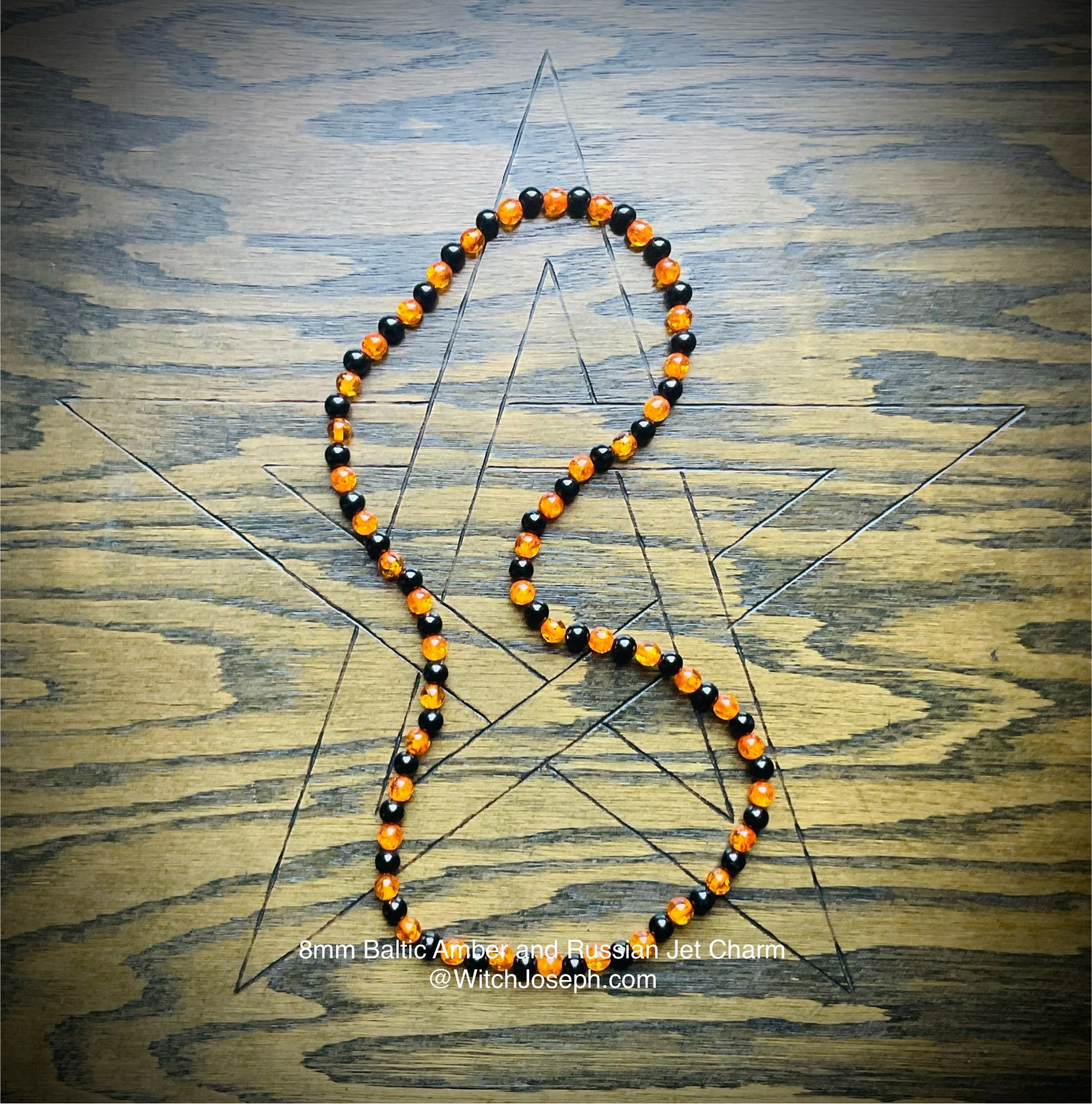 Amber and Jet have been worn by Witches and other magickal people for millennia…This necklace has been designed and created by Witch Joseph using 8mm Russian Jet beads and 8mm authentic Baltic Amber beads. (There is always some variation in the sizes and shapes of beads made from magick materia such as Amber…which is part of its beauty.)