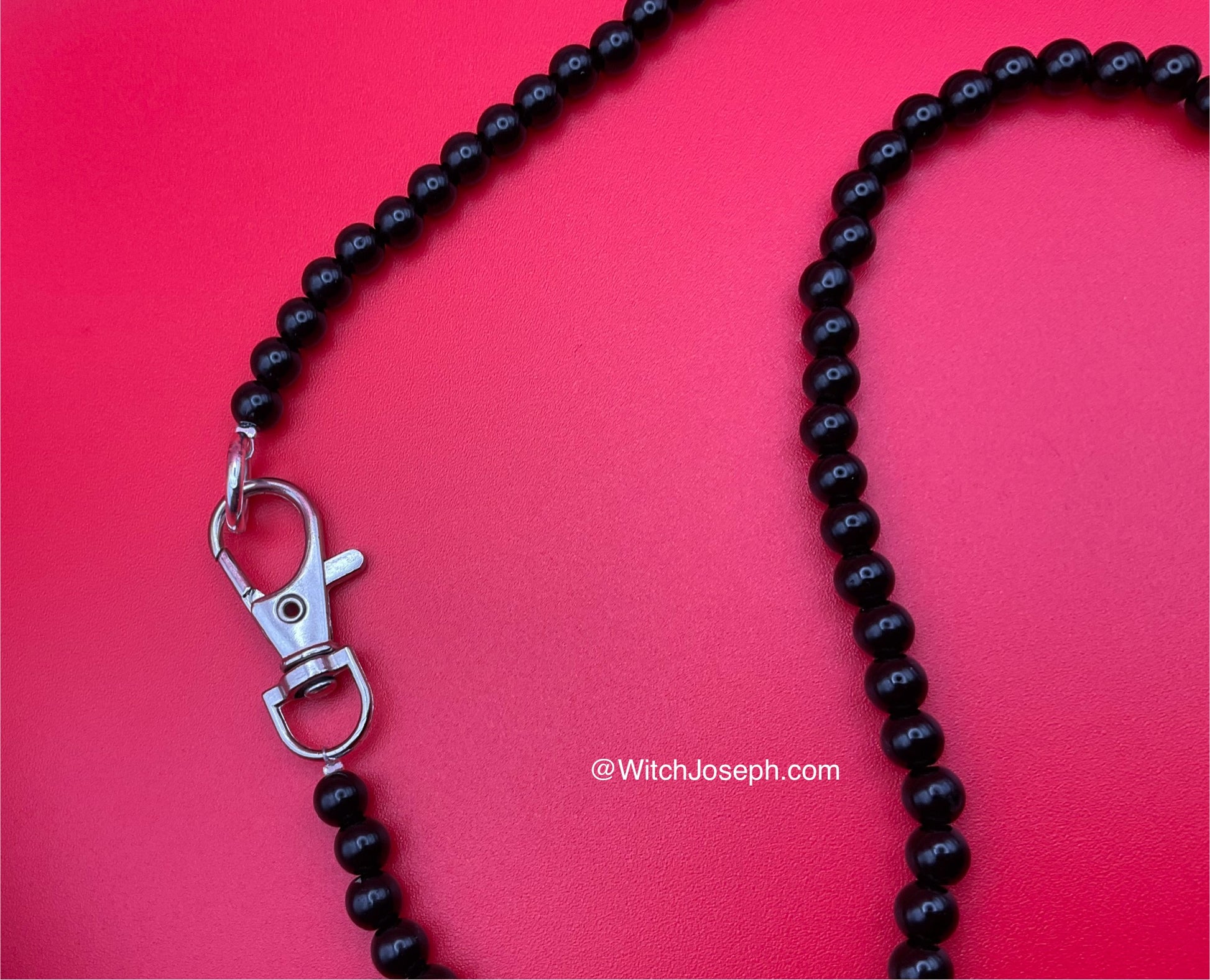 Crafted with 6mm black glass beads for a sleek and protective energy, and finished with a durable steel lobster clasp, this necklace carries both presence and strength. Its approximately 22” length makes it versatile for ritual wear, ceremonial adornment, or everyday expression of your path.