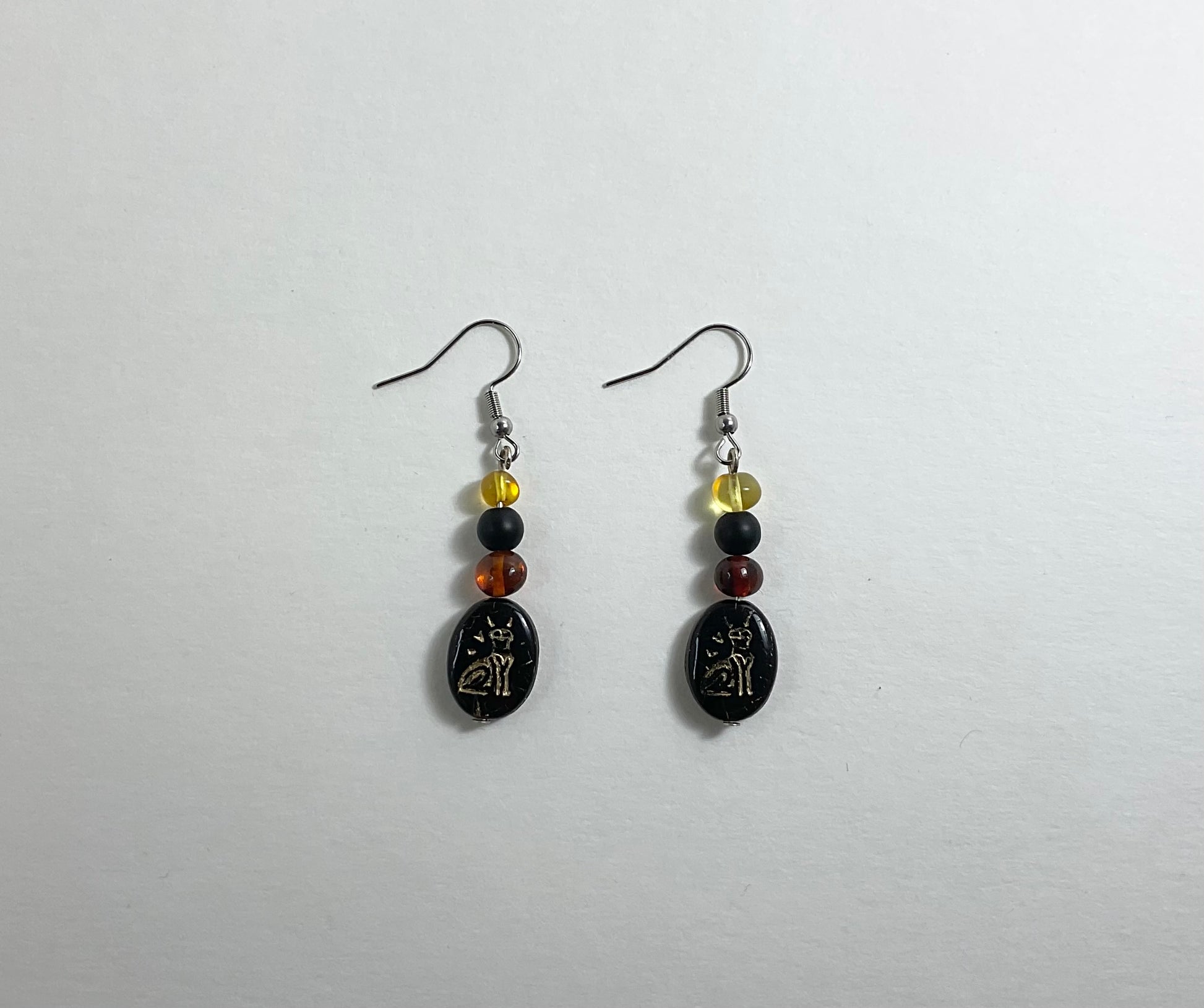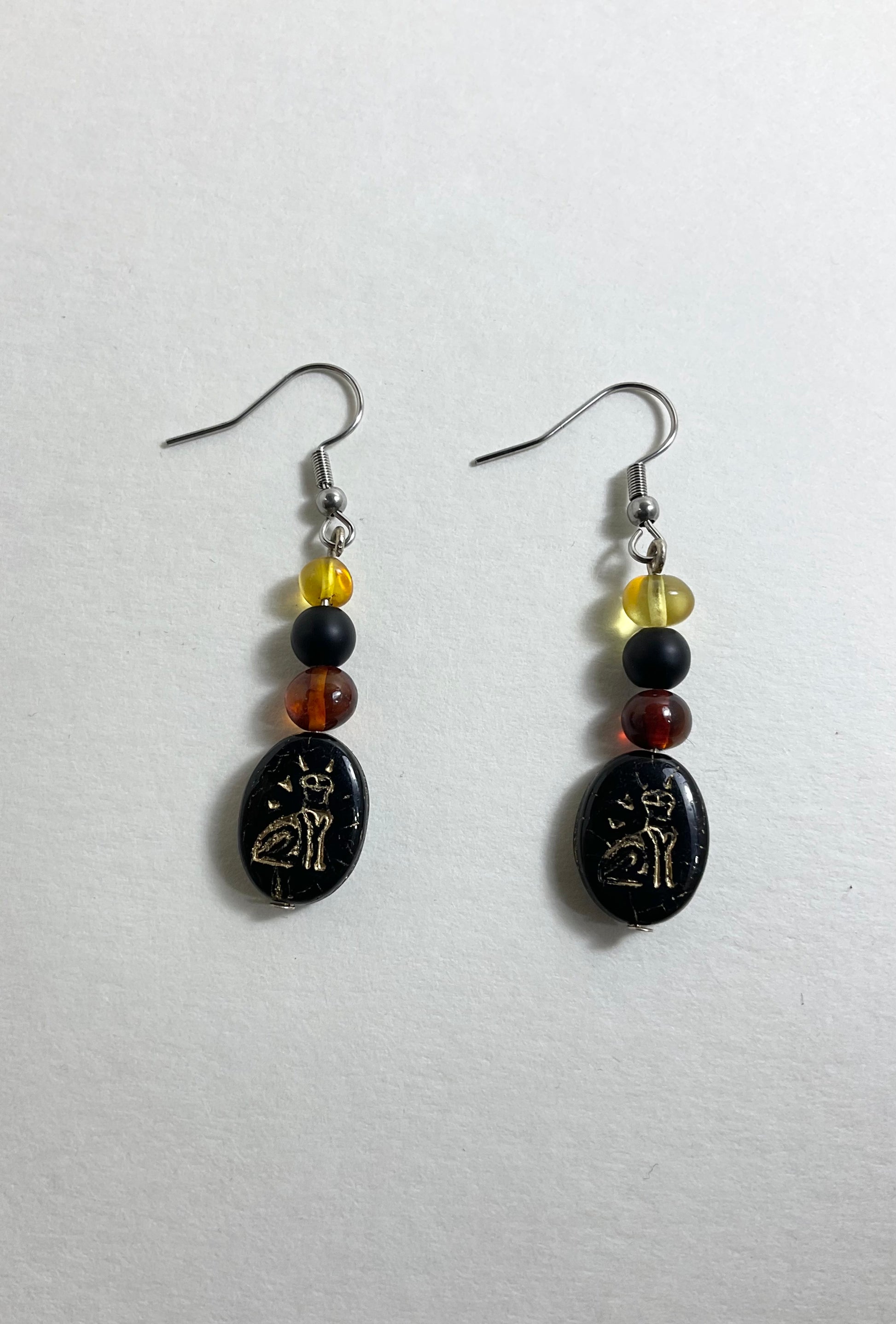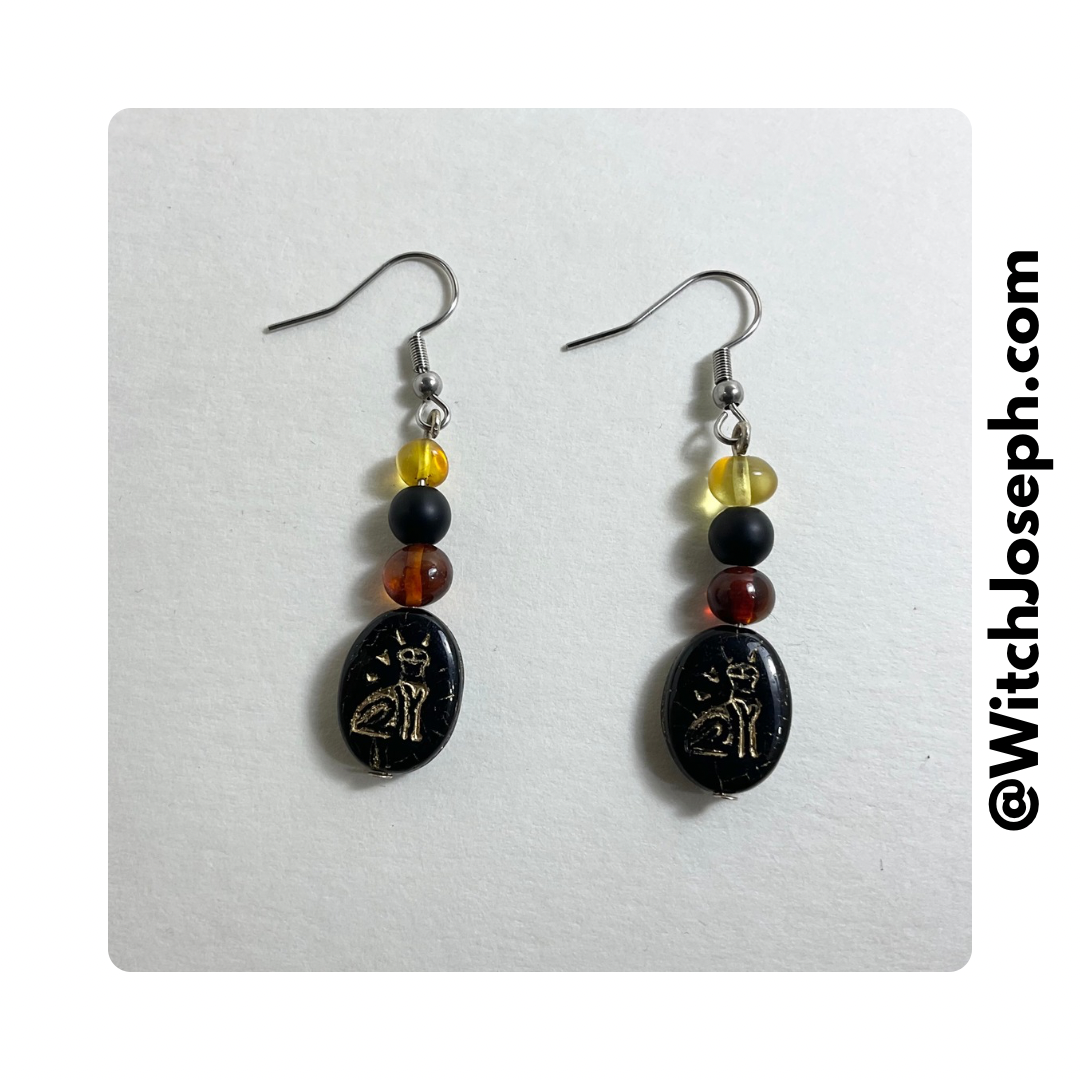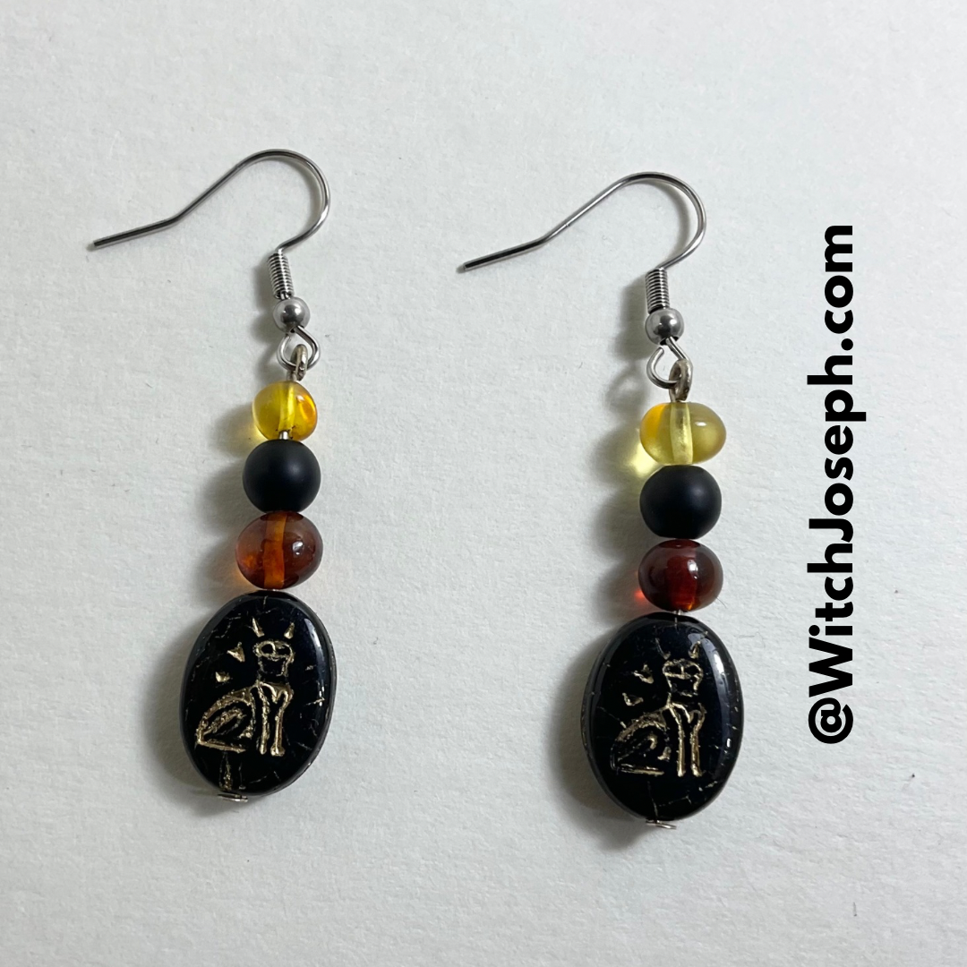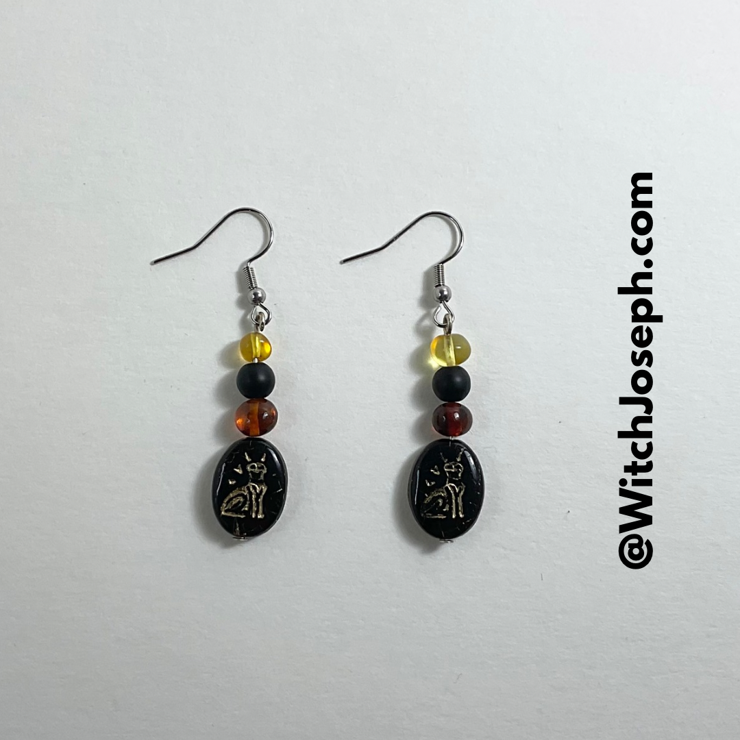 Focal Bast Cat Bead is Czech glass (.250”x.500”) with two 6mm Baltic amber (one light and one orange) beads and one 6mm Jet bead. Jet and Amber beads together are believed to have a subtle energetic benefit to them…on dangle fish hook earrings (stainless steel). Dua Bastet!