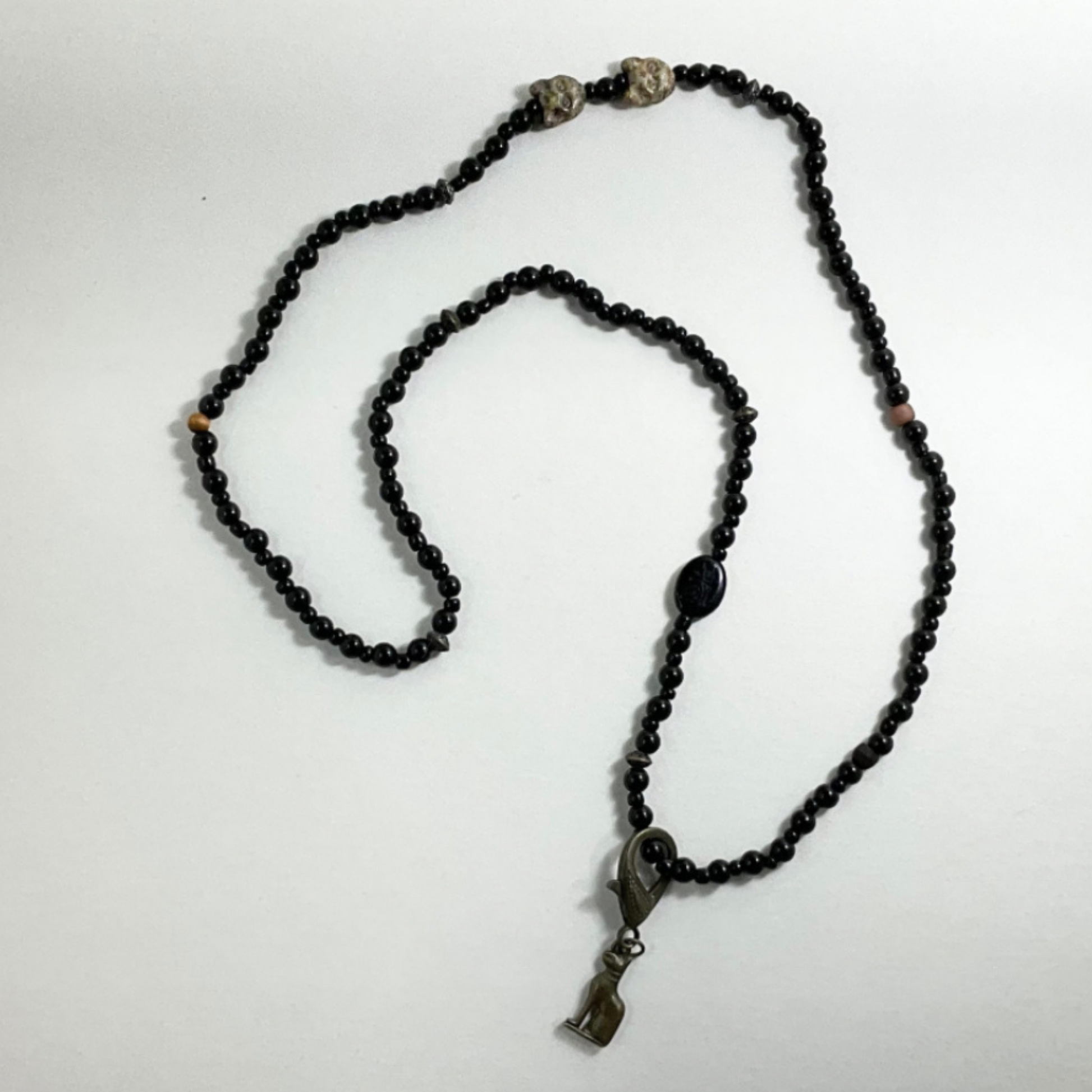 Bastet or Bast Goddess Necklace (approximately 30 inches…no clasp)…beautiful Bast Pendant on unique decorative lobster claw, detachable from necklace…with one hieroglyphic style Cat bead and decorative wooden bead accents…6mm black beads and black seed beads…also with two Czech Glass Cat head beads…all combined to give the feel of ancient Egypt.