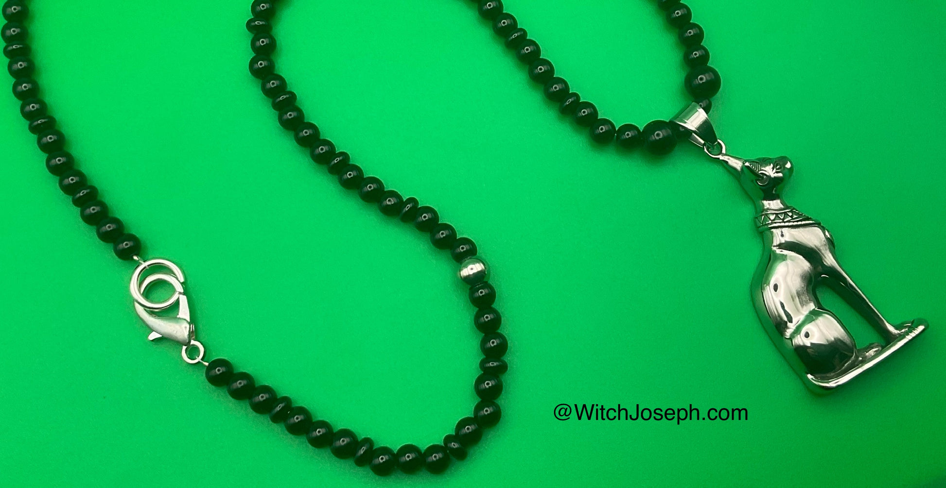 This powerful piece features a 2” x 1” stainless steel Bastet pendant, symbolizing intuition, independence, and divine guardianship. The pendant is strung on a 24-inch strand of black glass beads, accented with polished stainless steel beads for strength and elegance. Finished with a durable stainless steel lobster clasp, this talisman is both beautiful and lasting—perfect for daily wear or ritual adornment.