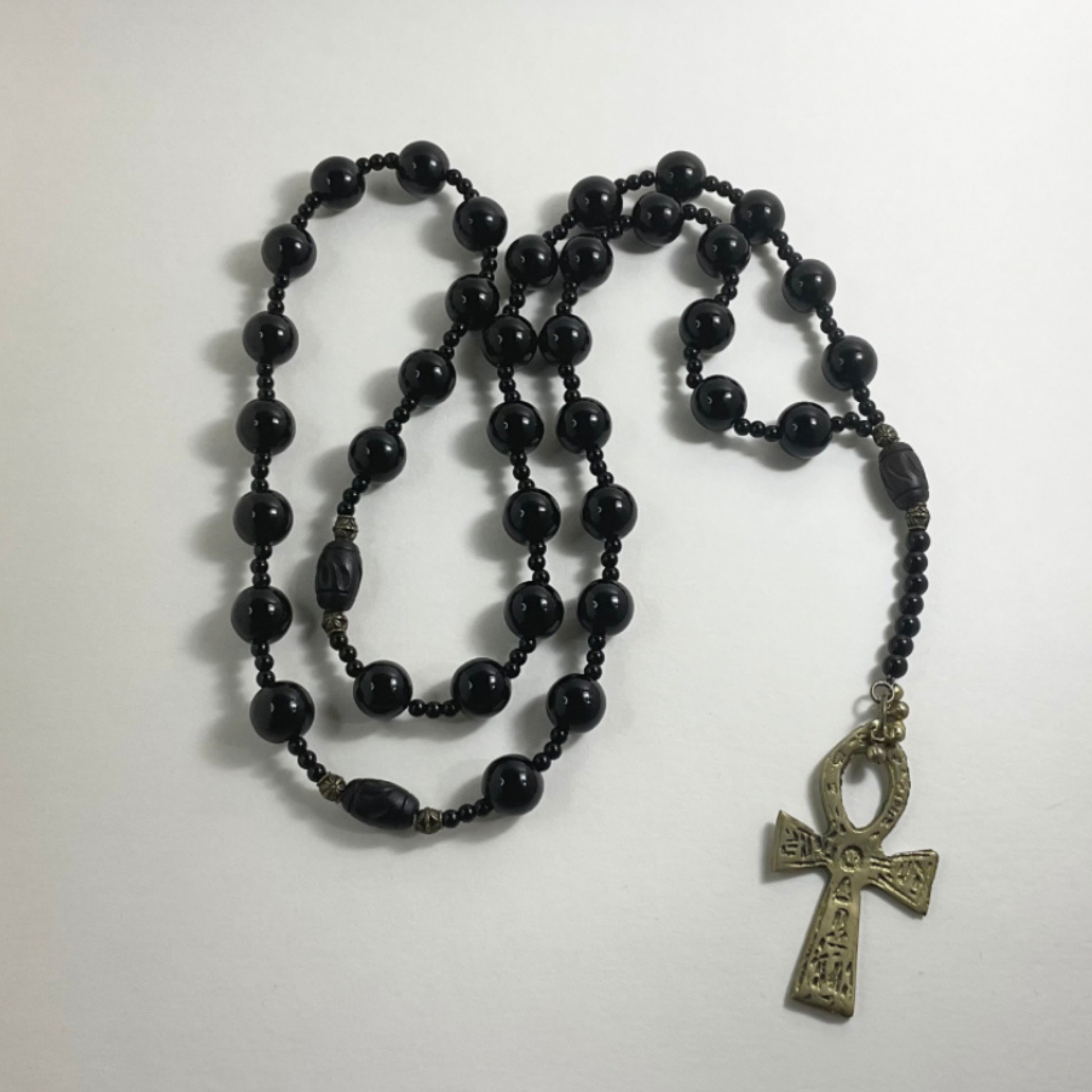 This Kemetic (Egyptian) Rosary has 3 sections with a total of 36 black glass beads (14mm) and 3mm/4mm glass beads in between…It is 36” long in the circlet and a 5.5” Pendant section with gold tone Ankh. The 3 sections are divided by 3 African style beads (one as the centerpiece and the two others equidistant in the circlet.