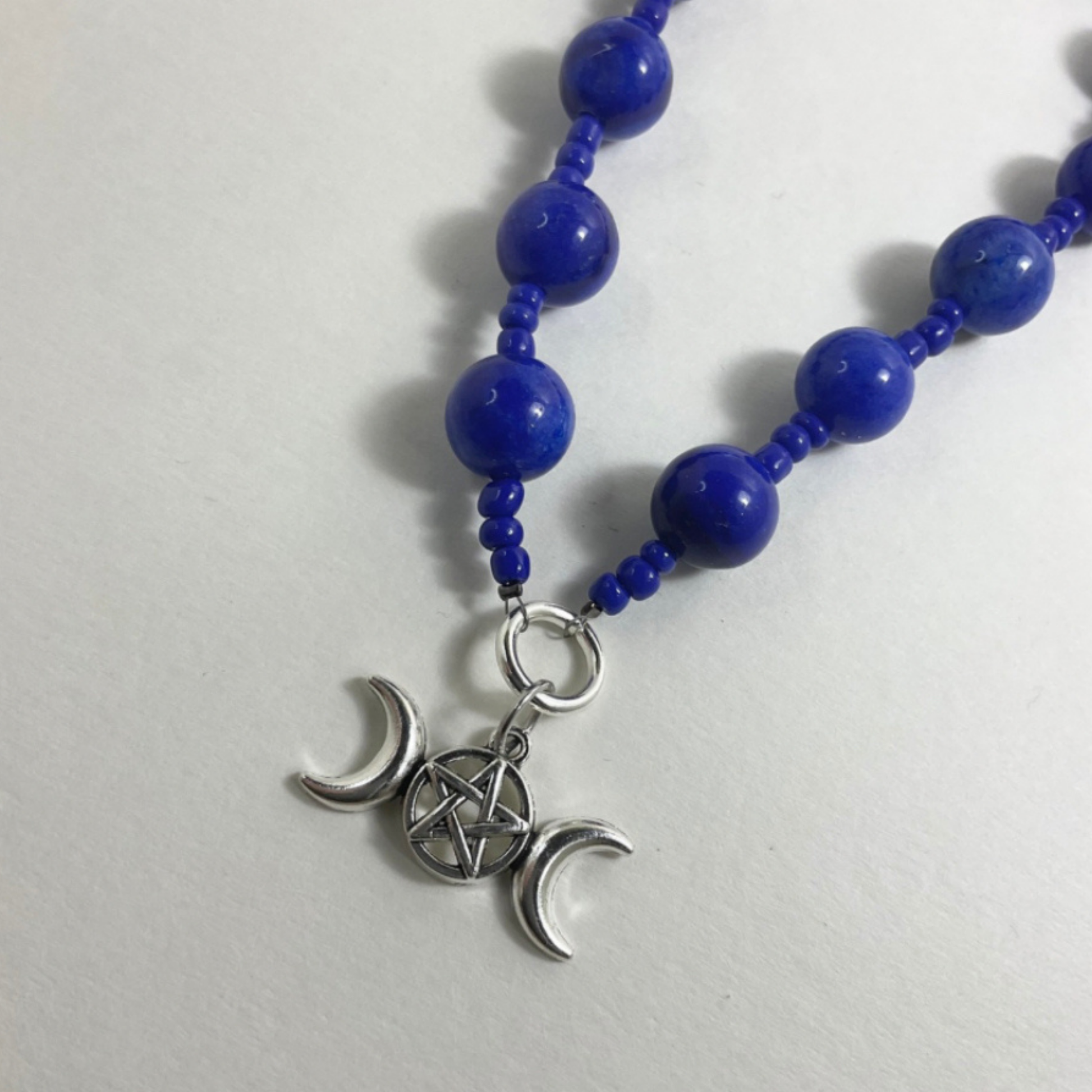 These 13 Bead (one for each of the lunations in a lunar year) Prayer Beads (approximately 5-6”) are lovingly hand made by Witch Joseph with 13 gorgeous blue glass beads (12mm) and vibrant blue seed beads…with a beautiful silver tone Triple Moon Goddess Symbol with Pentacle (15 x 18mm).