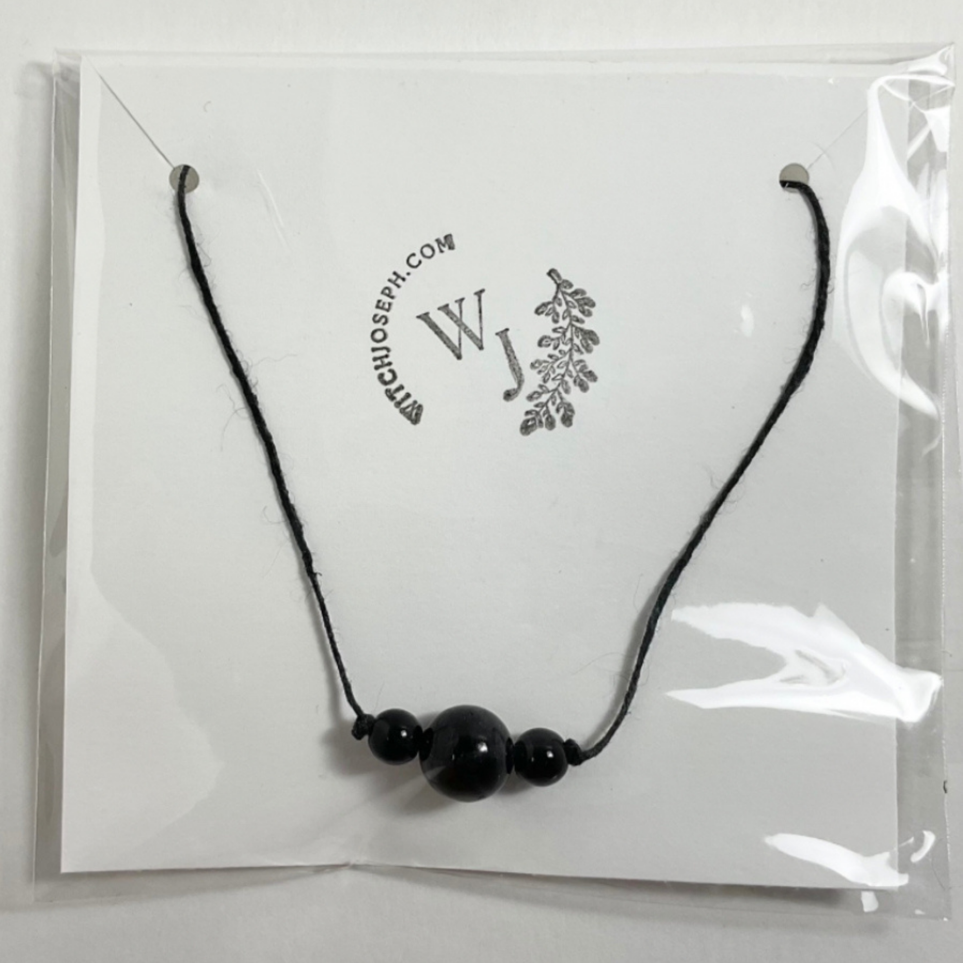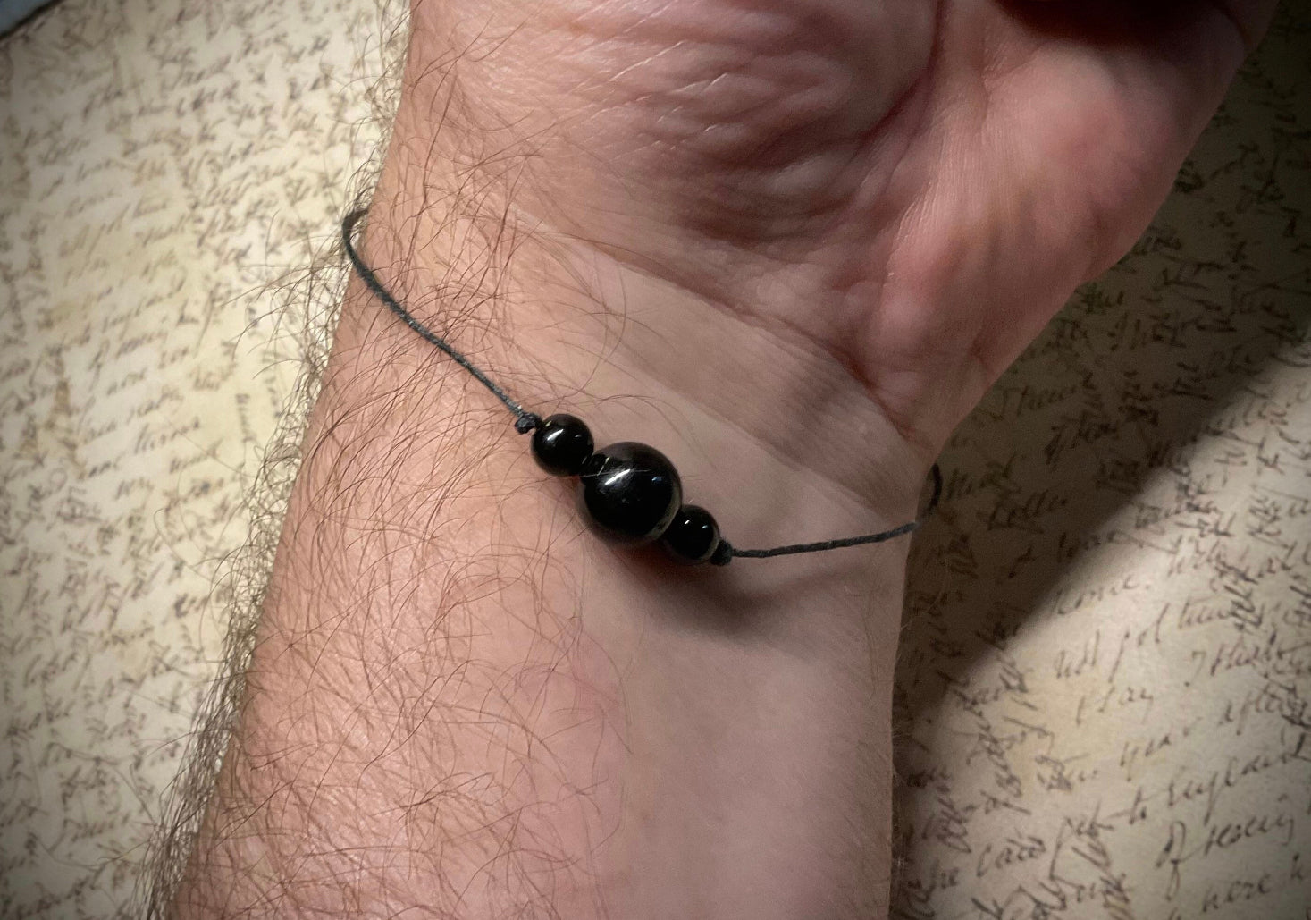 An adjustable Black Tourmaline Bead (10mm) Bracelet, with two black glass beads (6mm) on slip knot cording. Handmade by Witch Joseph.