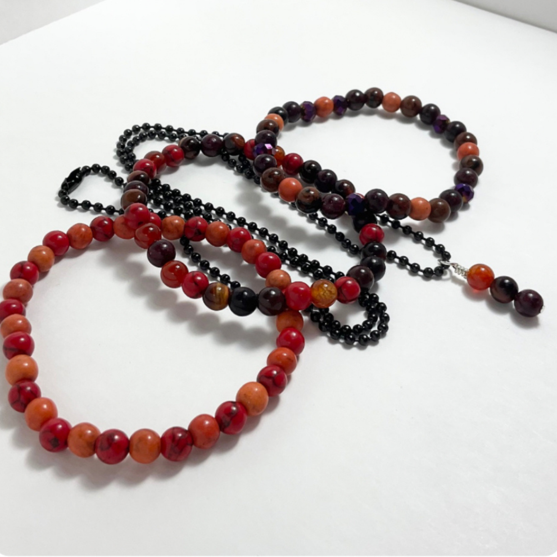 This stretch Bracelet set and accompanying Necklace is lovingly created from 6mm glass and quartz beads in brilliant autumnal colors of reds, browns and oranges…with the occasional purple accent (smaller faceted bead) that flashes like the sparkle from a bonfire in the Fall.