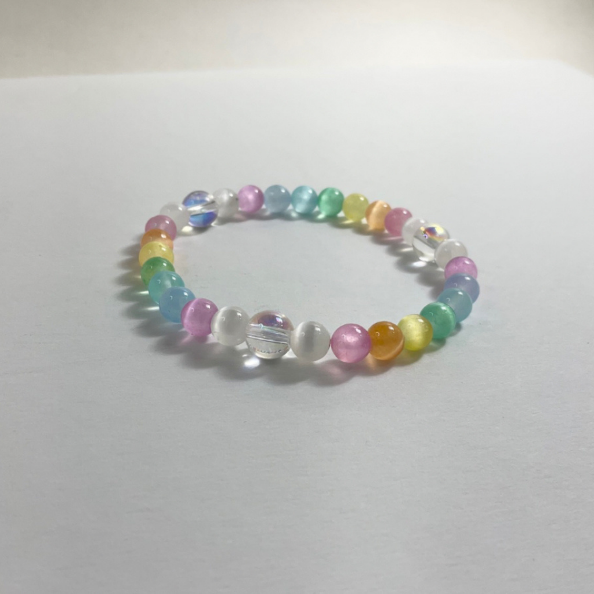 These gorgeous stretch bracelets are lovingly made by Brother Christopher…with 6mm selenite beads and each bracelet also has 3 refractive crystal beads for extra light. These bracelets are approximately 6.5” on stretch nylon cord.
