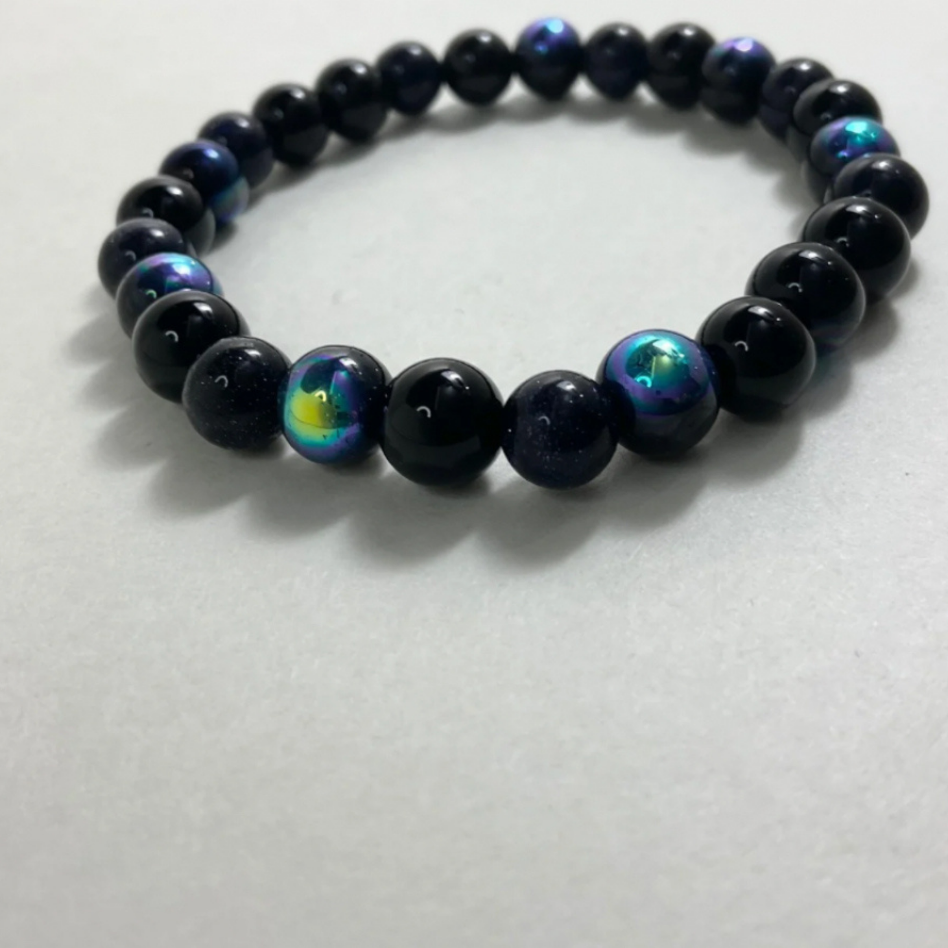 These beautiful stretch bracelets are lovingly handmade by Brother Christopher here at Witch Joseph…from 8mm glass beads in black and reflective iridescent black…and with black goldstone…gorgeous in the light.