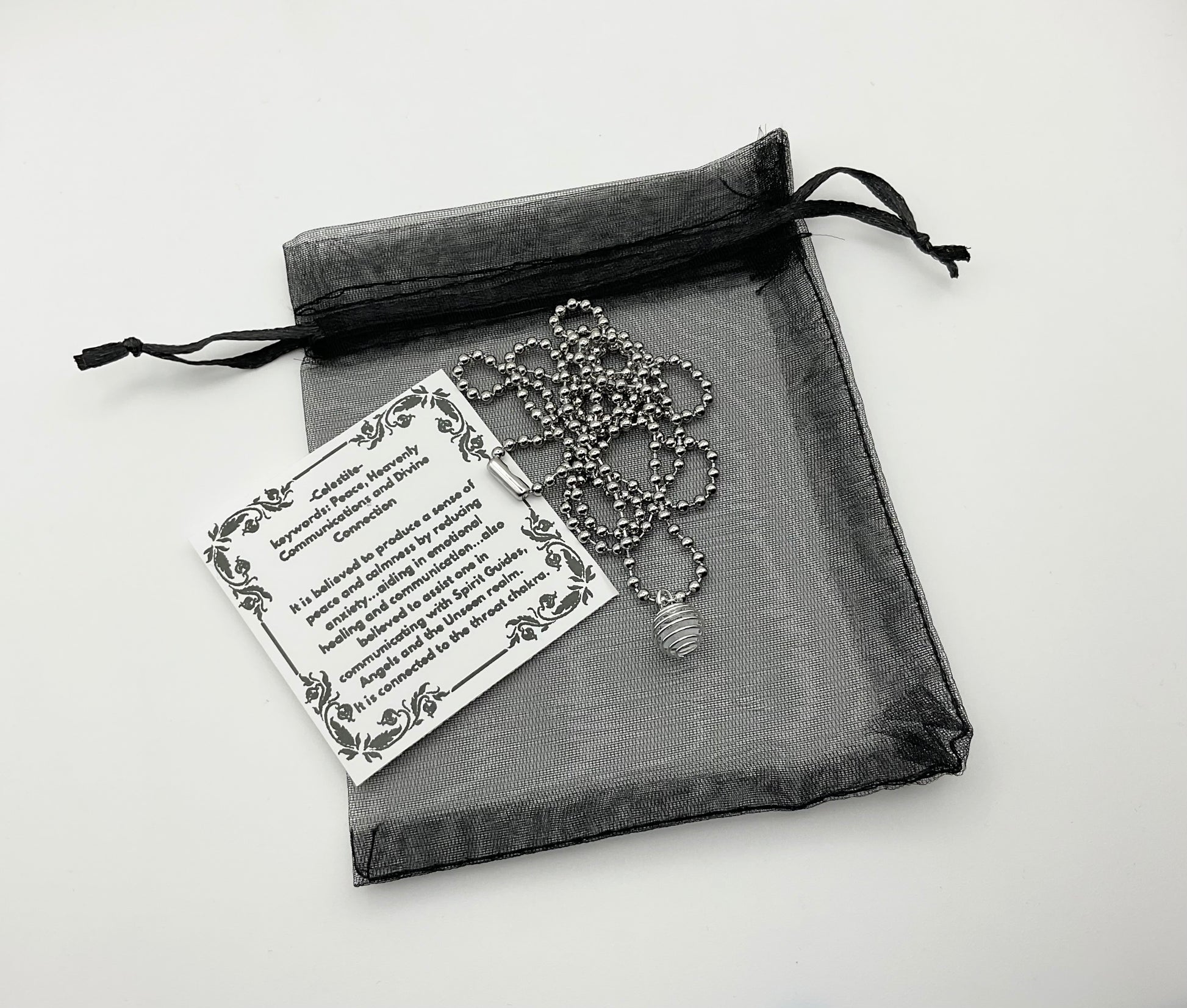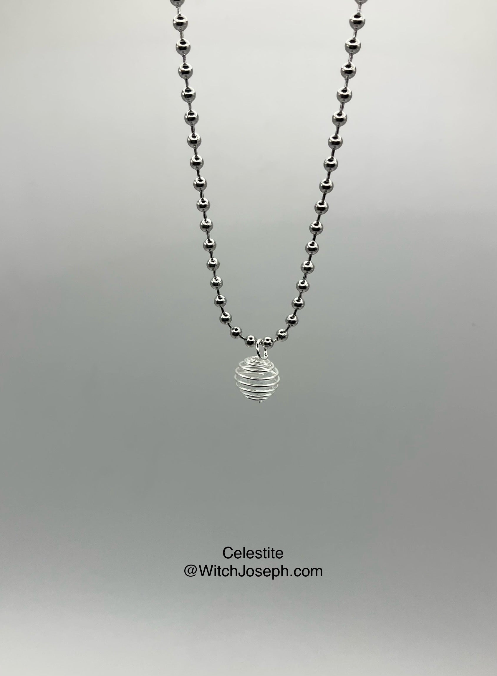 Illuminate your spirit with the pure energy of Celestite. This elegant 8mm silver-tone crystal cage holds a natural Celestite Crystal chip, allowing the grounding and heavenly energy to dance within its sacred geometry. Suspended from a 30” stainless steel 2.4mm ball chain, it’s a simple yet powerful talisman for energy alignment, grounding and protection.