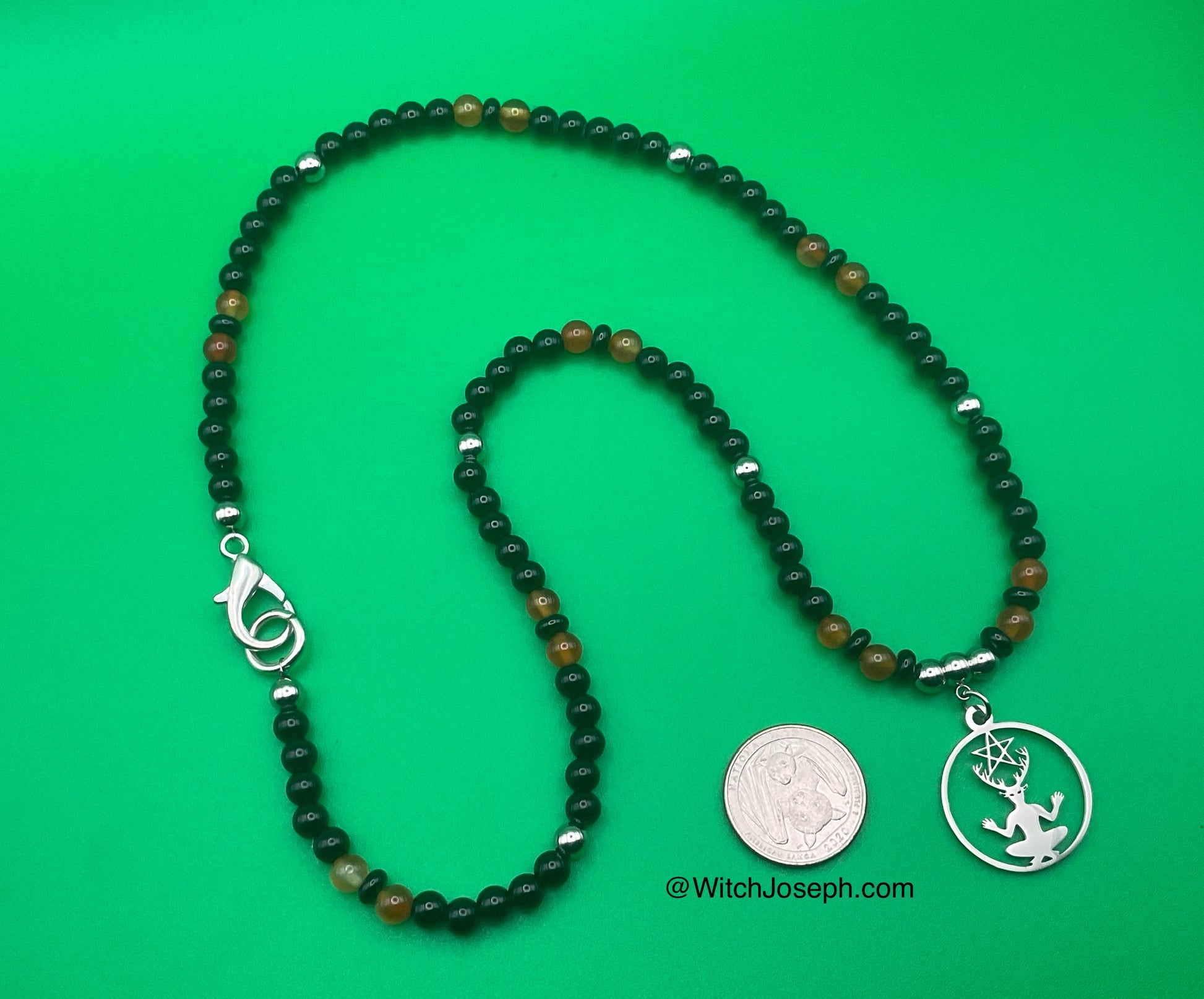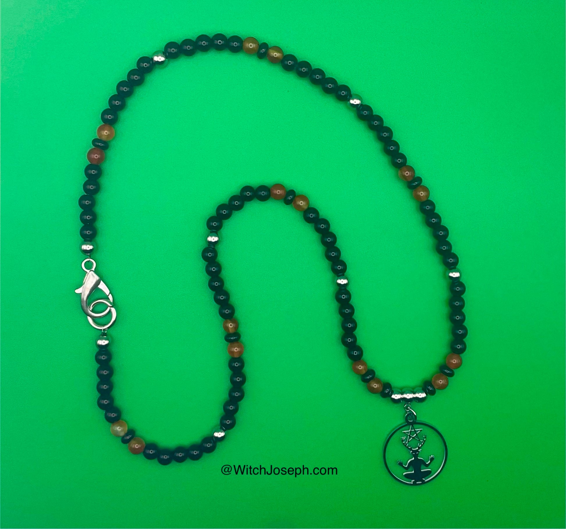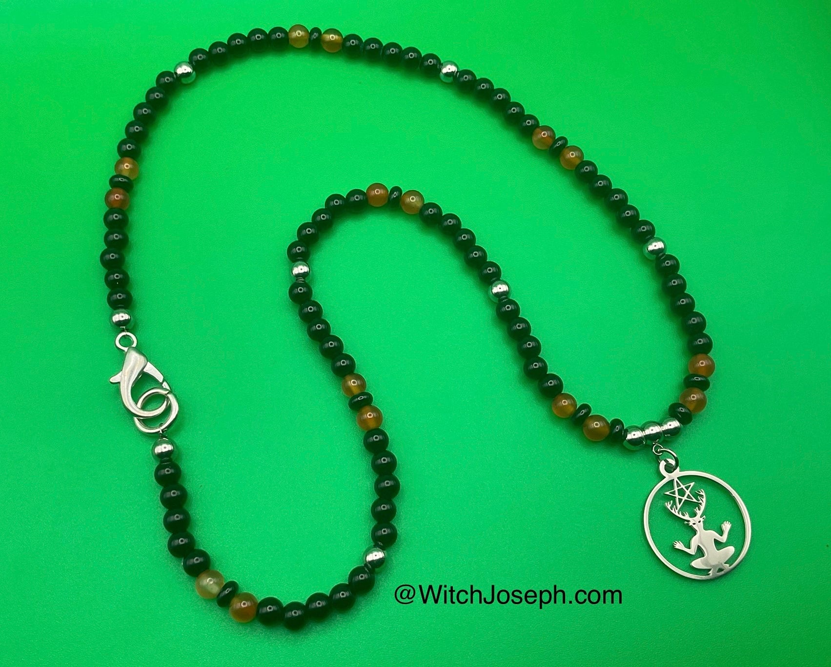 The pendant is complemented with black beads, fiery Carnelian beads, and stainless steel accent beads, finished with a durable stainless steel lobster clasp for secure wear.