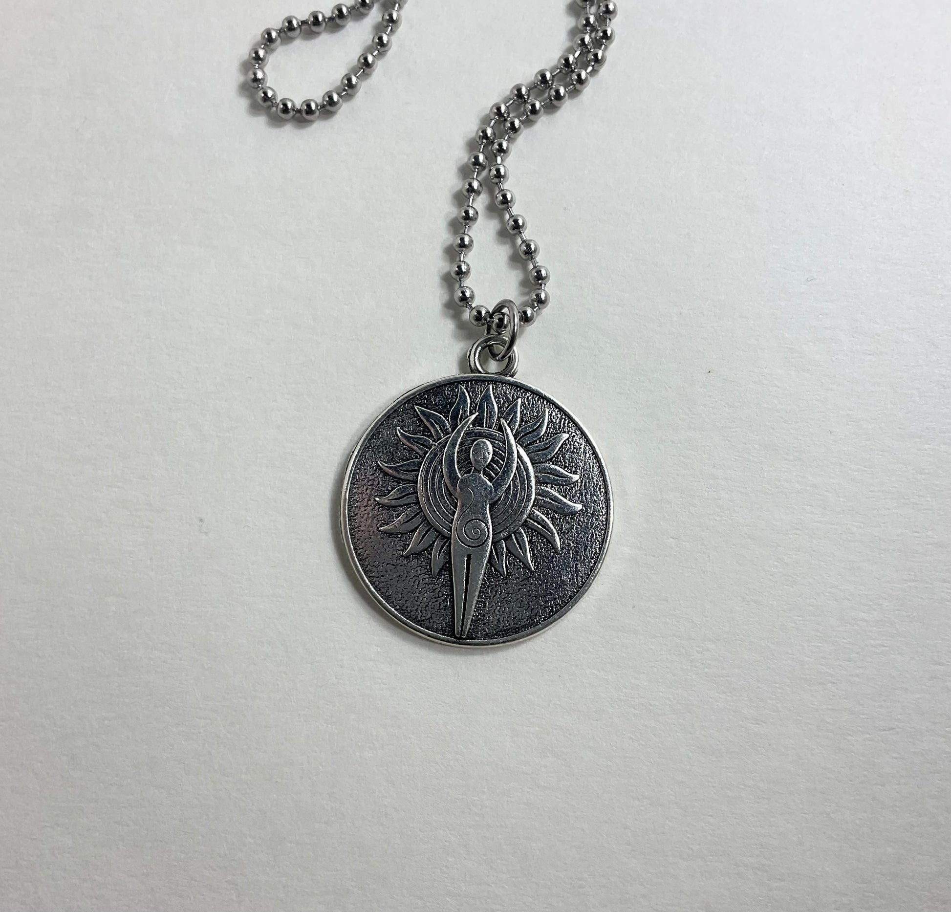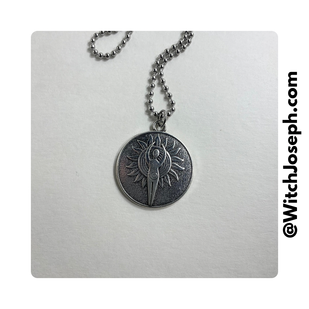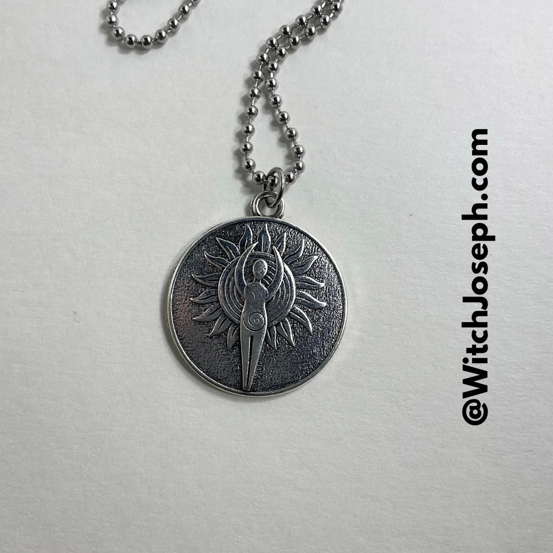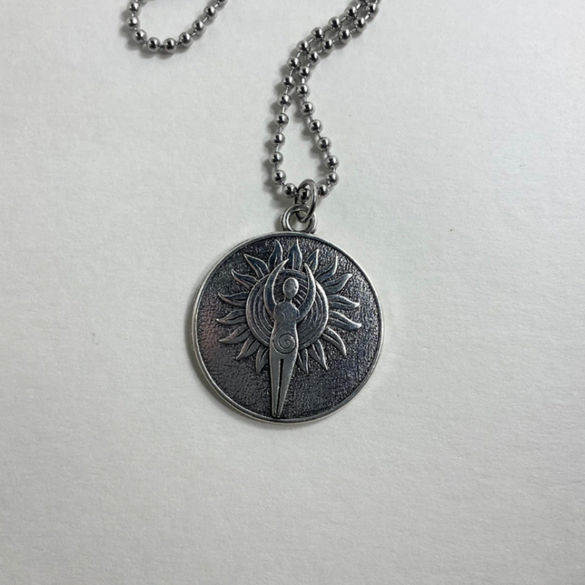 Celebrate the Goddess as the source of Light and Life…with this metal Solar Goddess Charm. (30MM in diameter, approximately 1 1/4”). The body of the Goddess is shown over the Sun disc and has the Spiral symbol emblematic of Her promise that Life is cyclical and eternal…all forms pass away and are renewed in new forms. This is sure to be a beloved addition to any devotee of the Great Goddess.