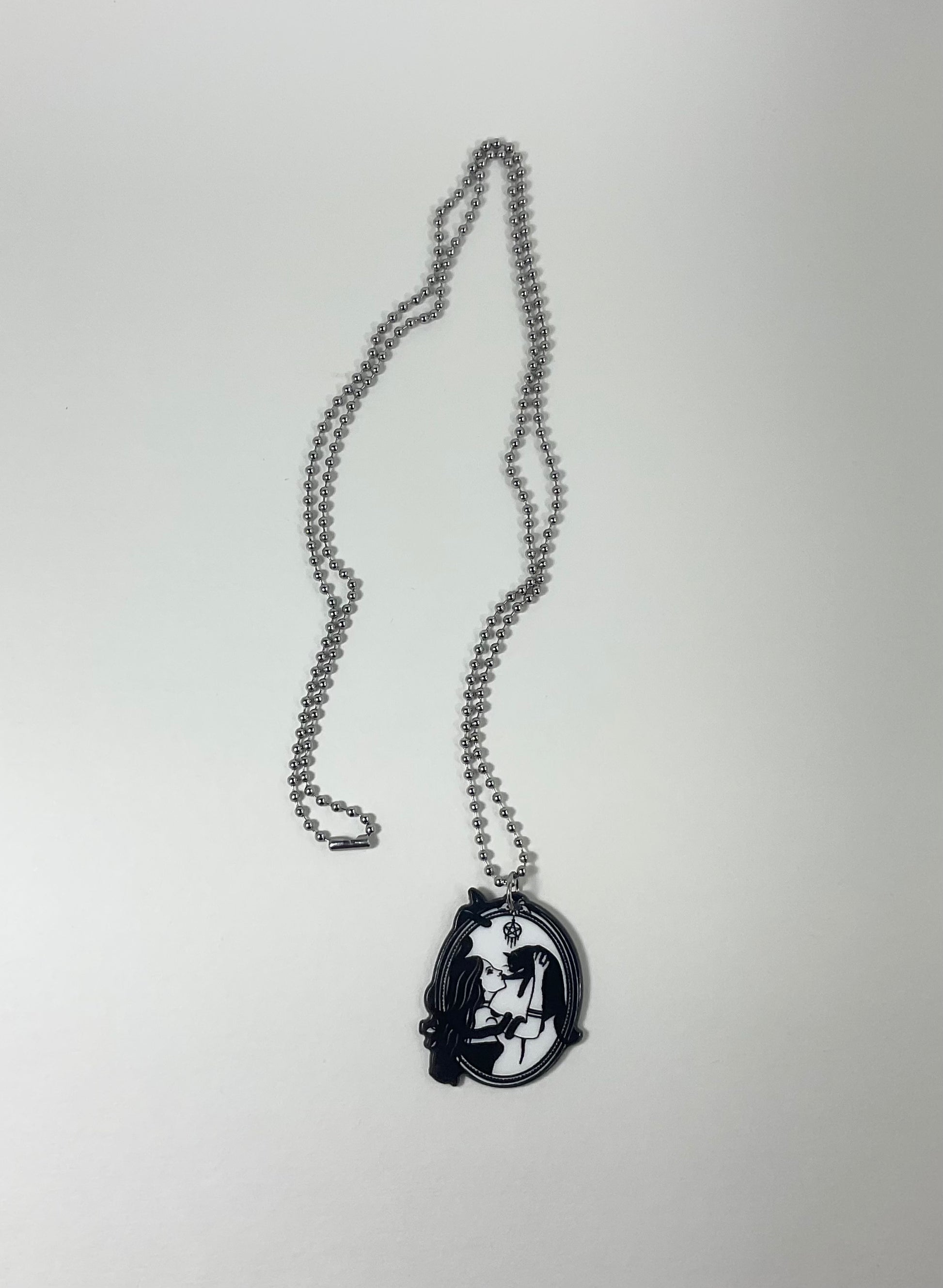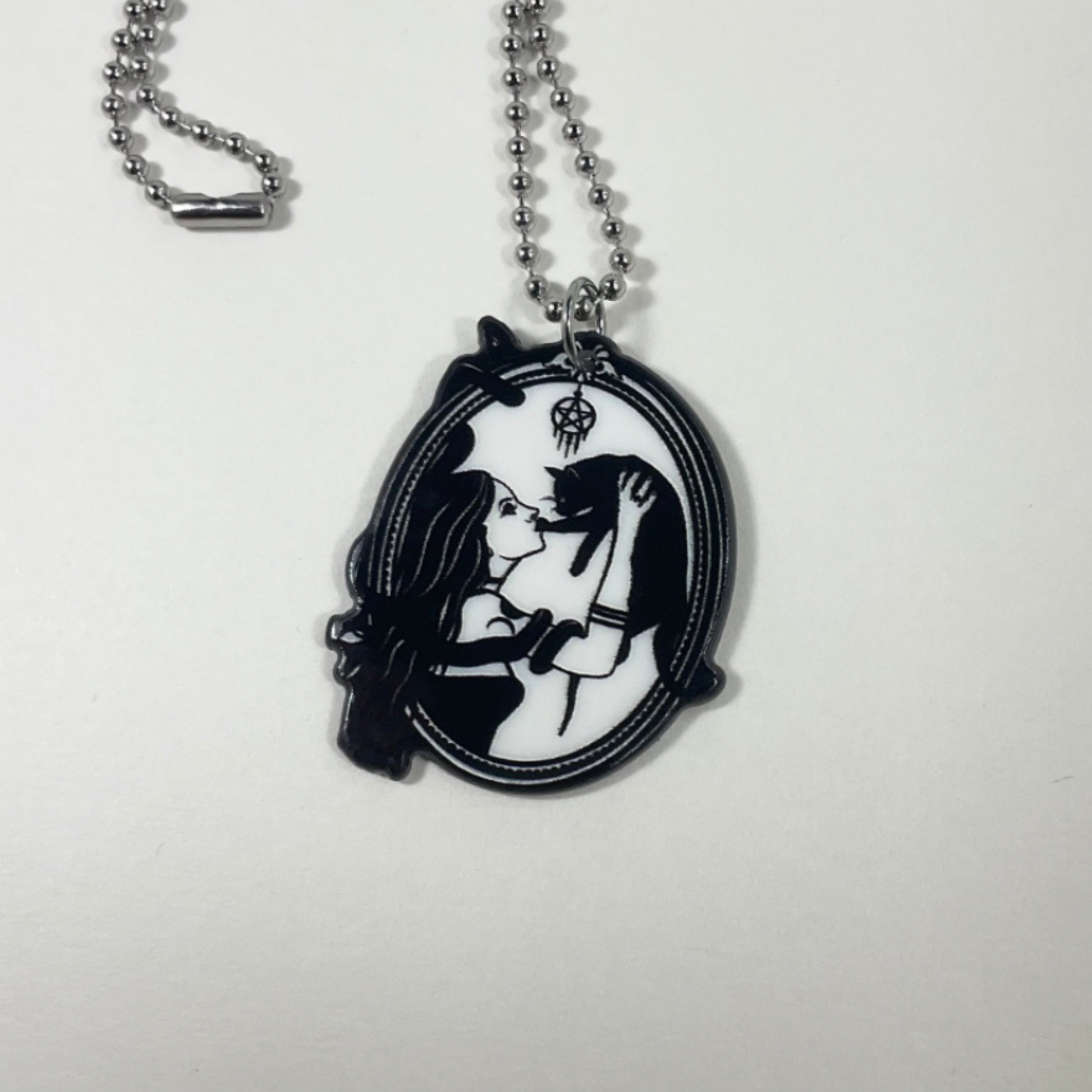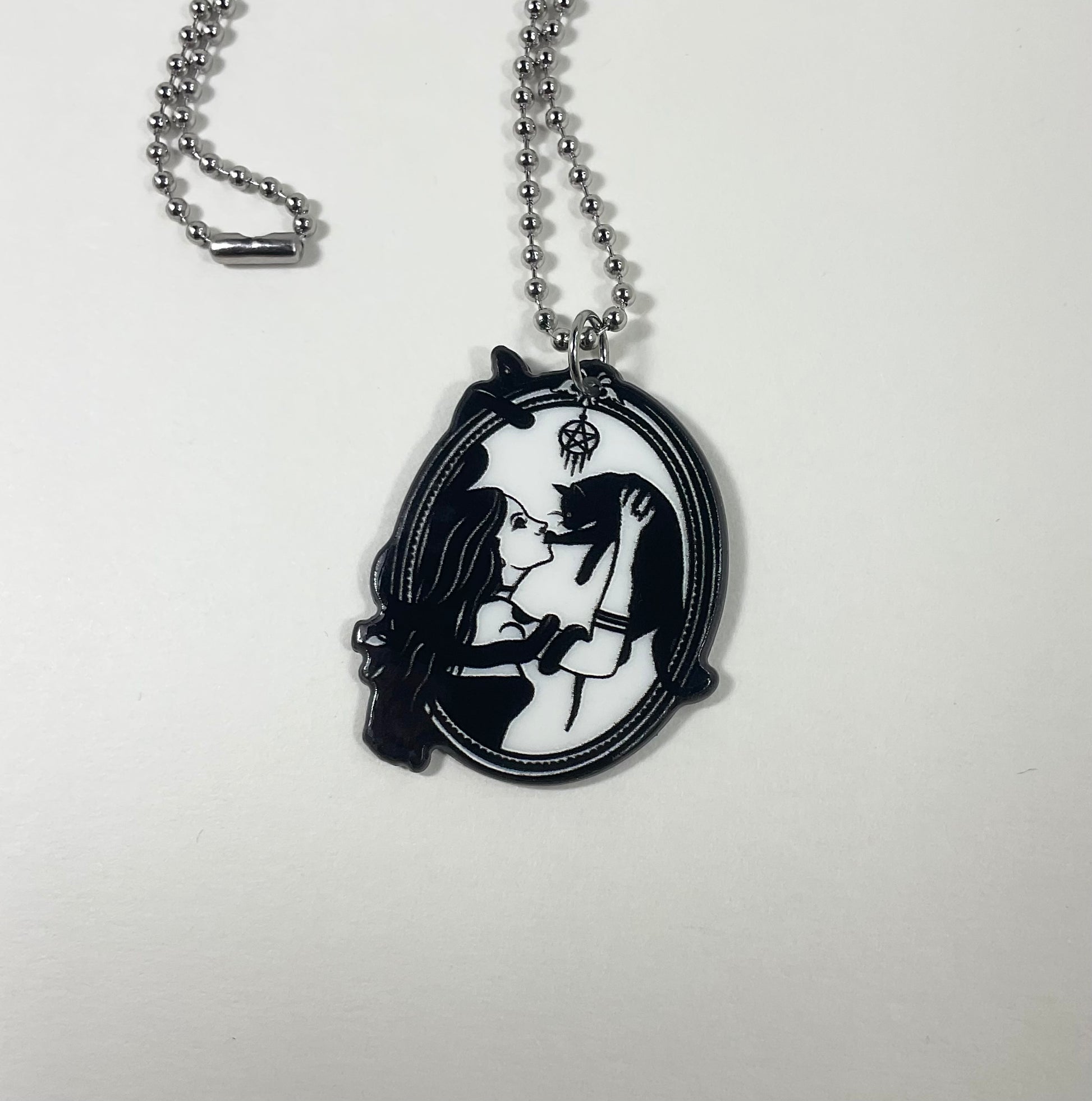 Goddess Hecate (Hekate) Witch pendant with gorgeous black cat…this pendant is double sided…and is approximately 1.5” x 1”…also features a tiny Pentacle above the two figures…we love how she is kissing the cat’s paw.