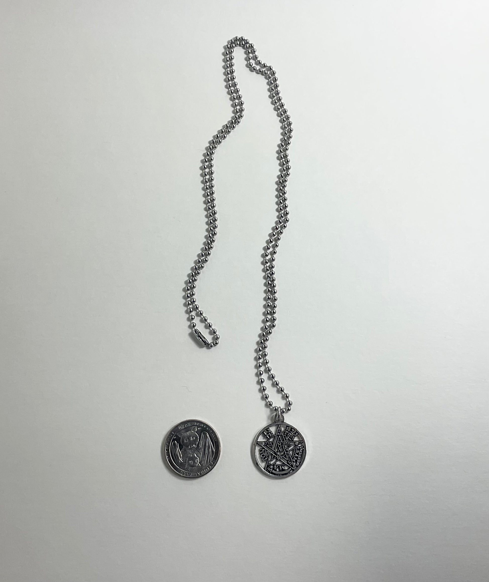 Tetragrammaton (literally four letters) Pentagram Pendant in Silver Tone…the Pentagram/Pentacle is a powerful protection symbol, sometimes symbolizing Witchcraft and the Magickal path itself. It is often seen as an elemental symbol with the four elements Earth, Air, Fire and Water in balance and crowned by the element of Spirit or Akasha symbolized by the upper top point….with the circle of protection and wholeness surrounding these…some practitioners see the human form represented by the five pointed star. This particular pentagram is based on the one designed by Eliphas Levi with the Tetragrammaton (the four lettered Hebrew name for G-d…YHVH)