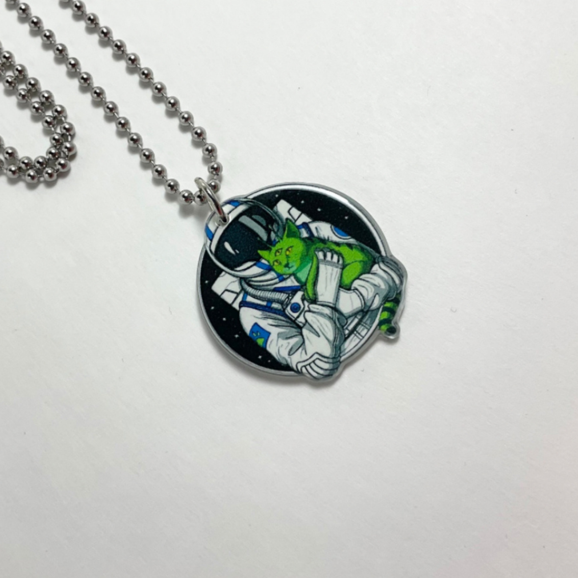 Adorable acrylic Astronaut with Cute Alien Cat Charm necklace…double sided.