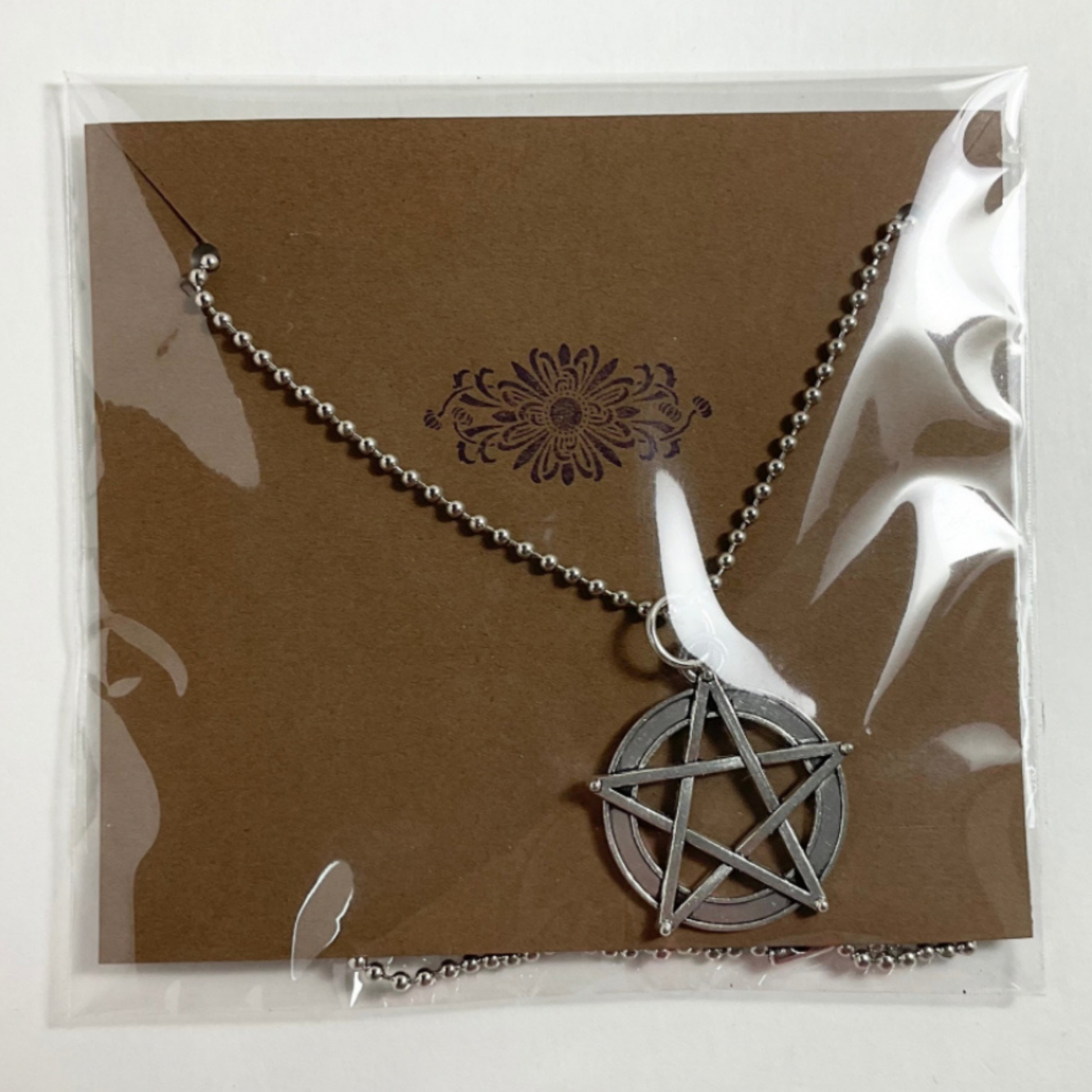 Pentagram Pendant in Silver Tone…the Pentagram is a powerful protection symbol, sometimes symbolizing Witchcraft and the Magickal path itself. It is often seen as an elemental symbol with the four elements Earth, Air, Fire and Water in balance and crowned by the element of Spirit or Akasha symbolized by the upper top point….with the circle of protection and wholeness surrounding these…some practitioners see the human form represented by the five pointed star.