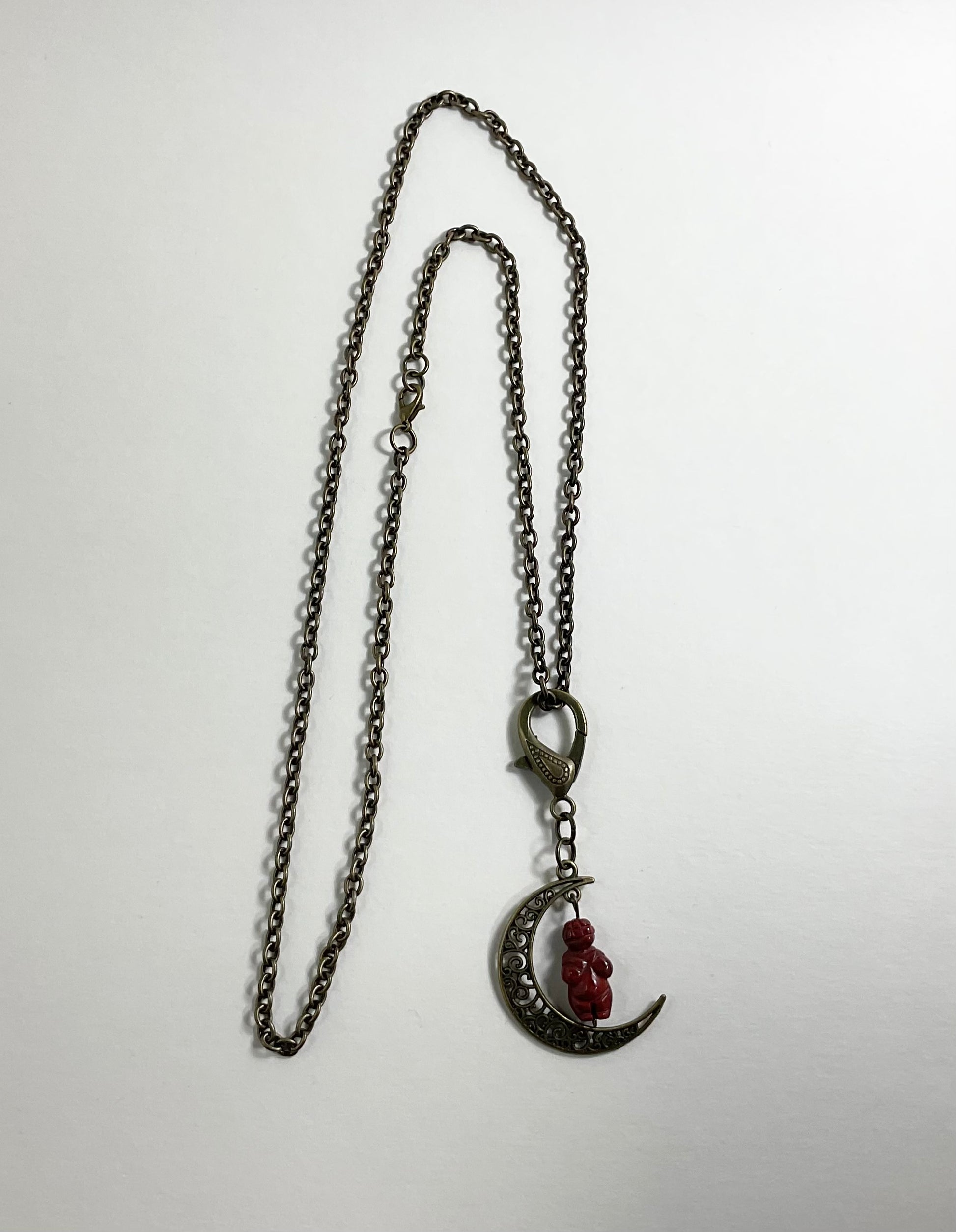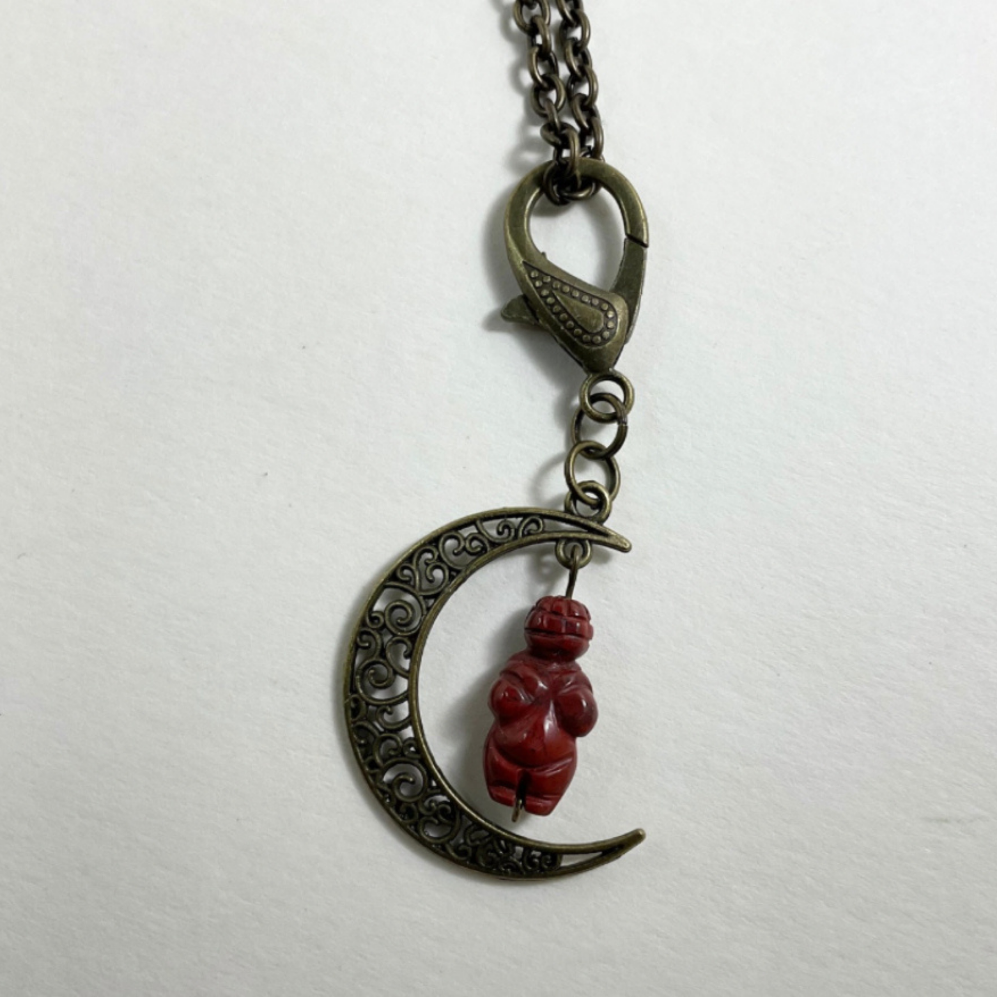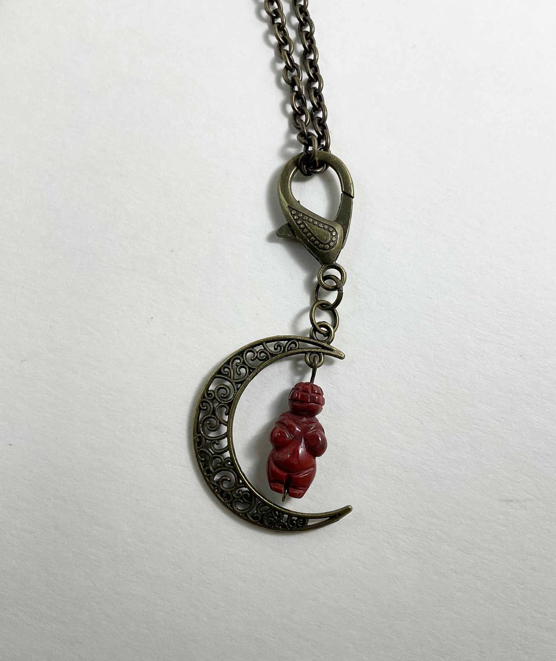 Jasper Moon Goddess Talisman…carved Jasper bead in the image of the Goddess of Willendorf and hanging from a crescent moon in bronze tone metal…pendant is attached to a decorative bronze tone lobster claw (can easily be taken off the chain and worn in other ways or hung in the home as a Goddess ward).