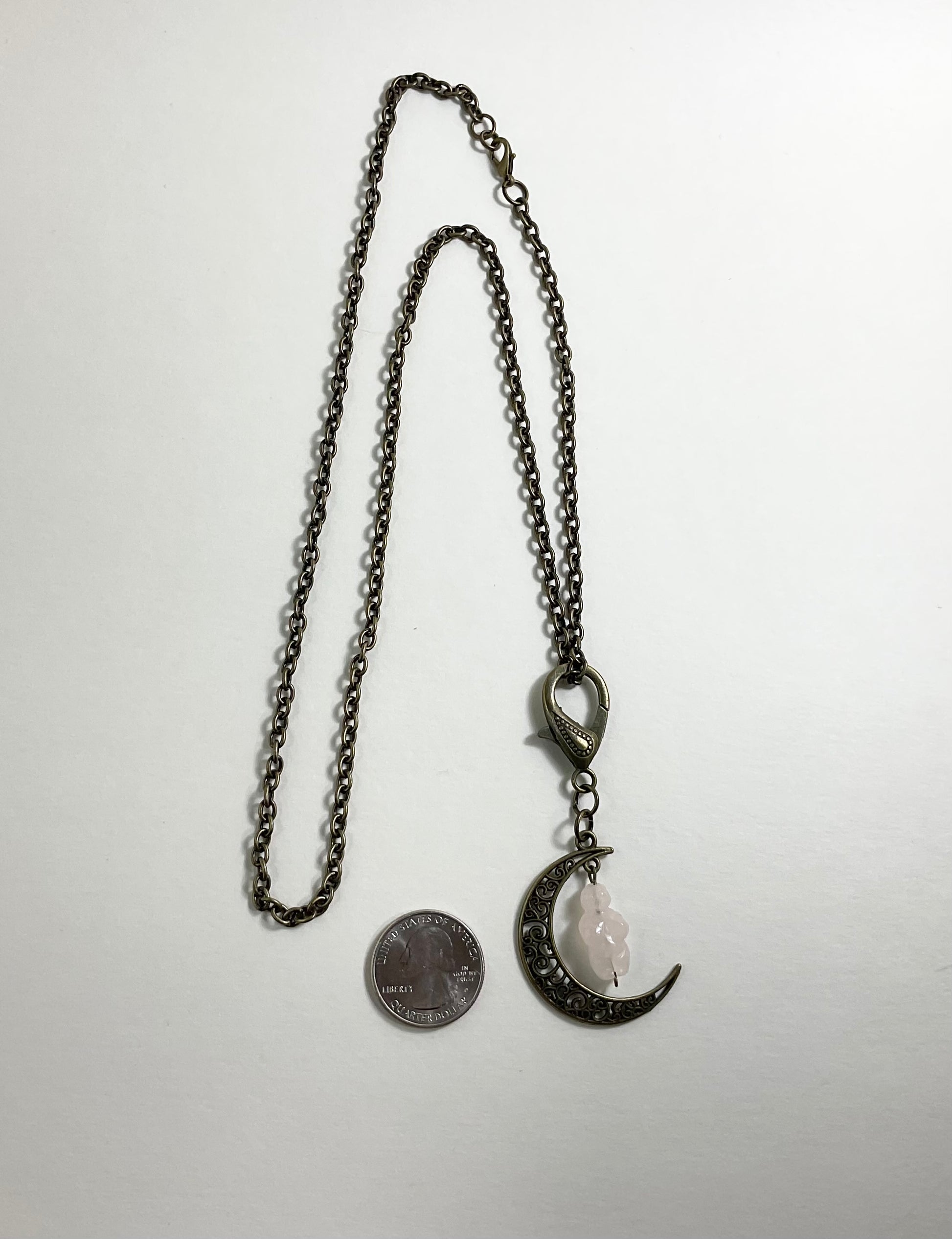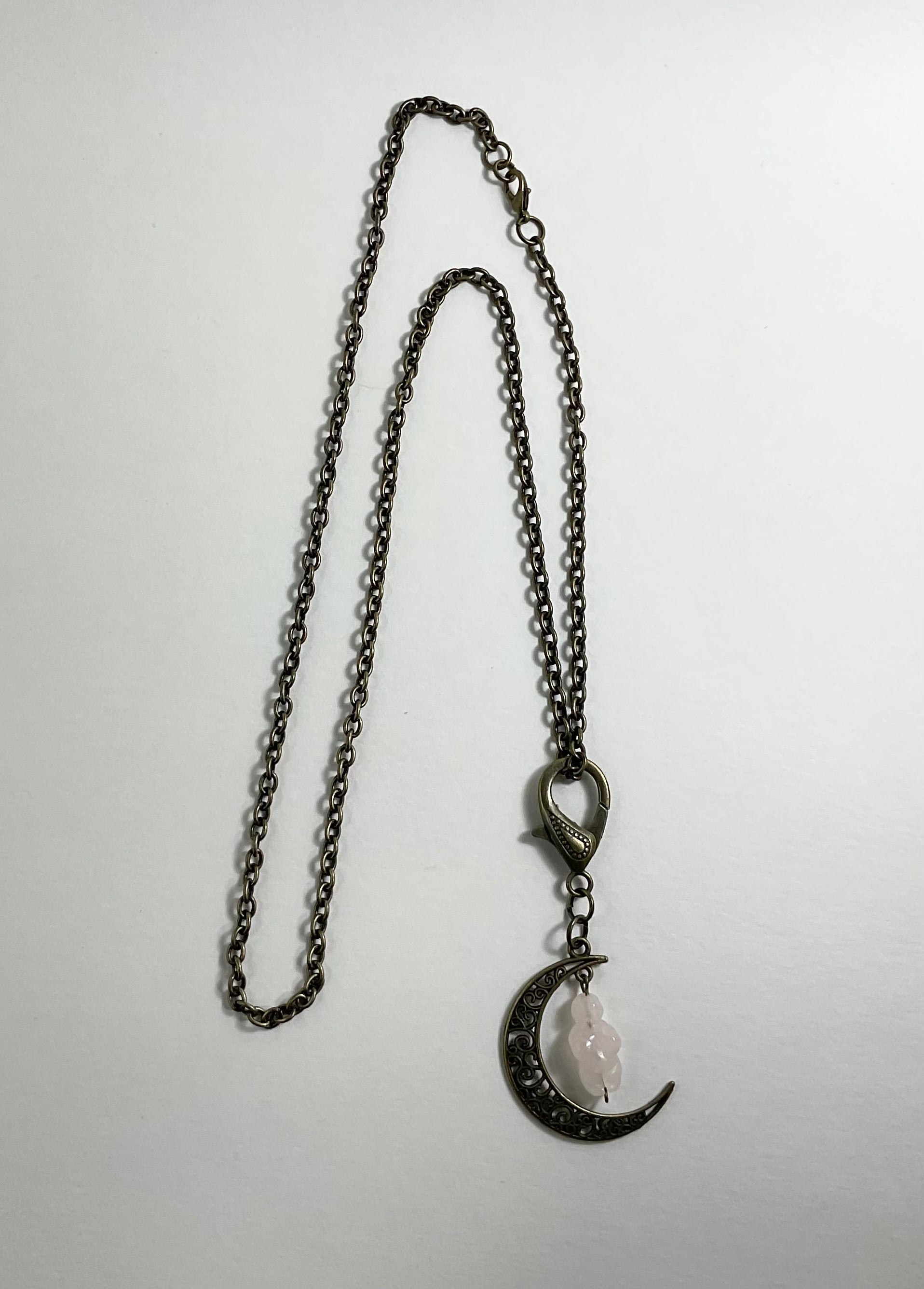 Rose Quartz Moon Goddess Talisman…carved Rose Quartz bead in the image of the Goddess of Willendorf and hanging from a crescent moon in bronze tone metal…pendant is attached to a decorative bronze tone lobster claw (can easily be taken off the chain and worn in other ways or hung in the home as a Goddess ward).