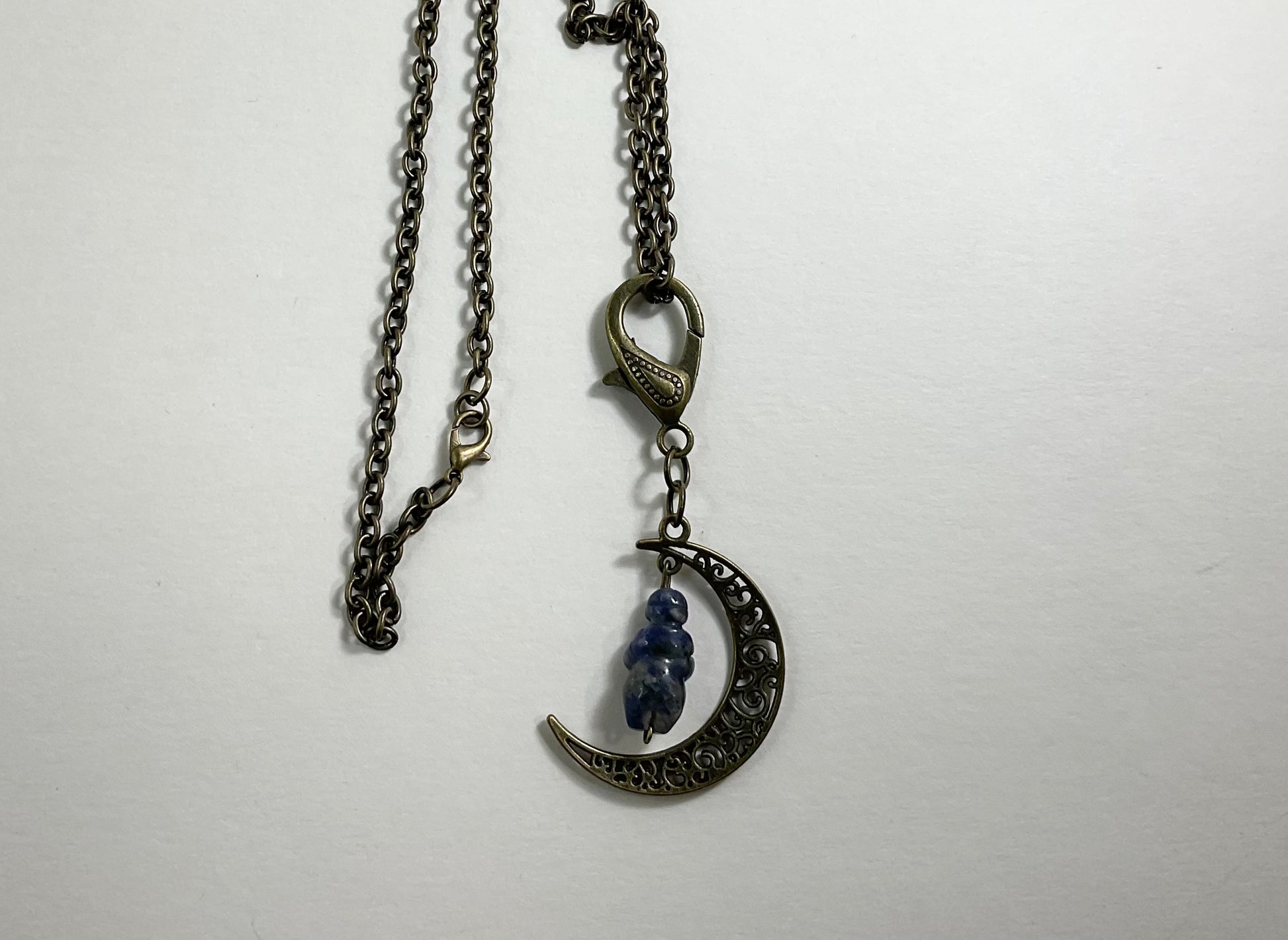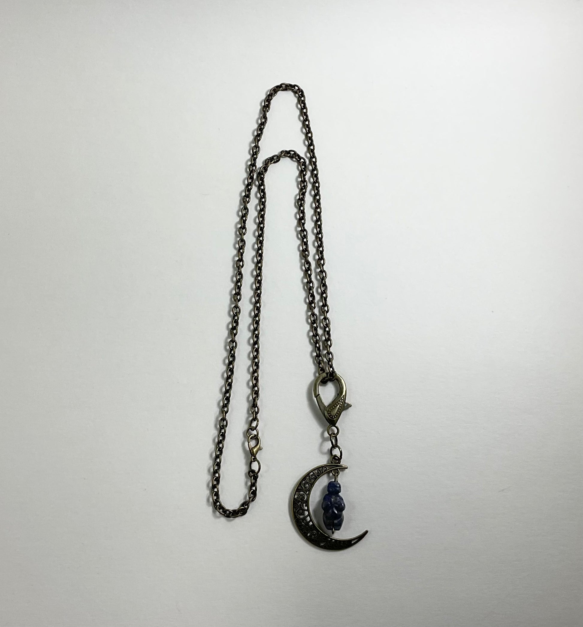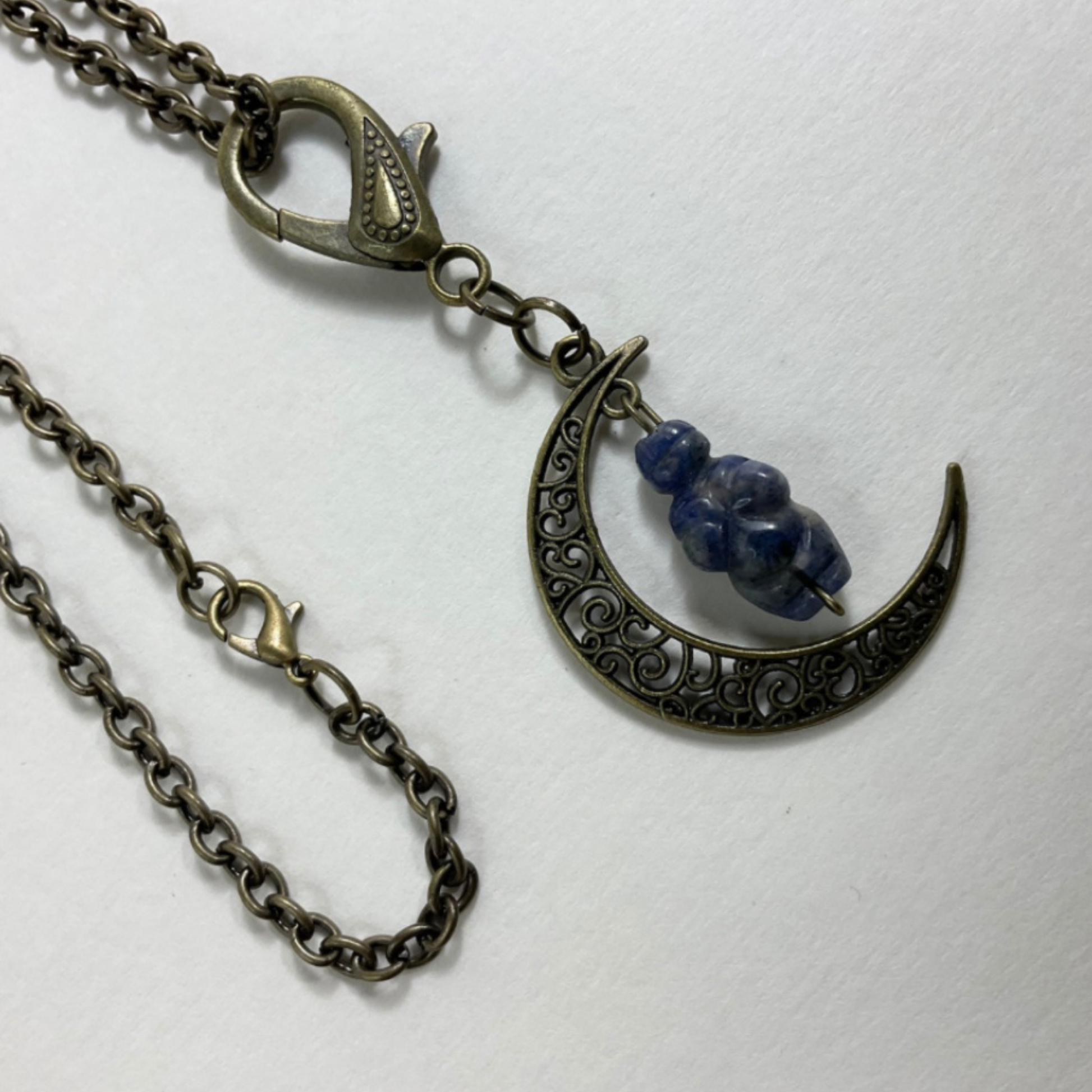 Sodalite Moon Goddess Talisman…carved Sodalite bead in the image of the Goddess of Willendorf and hanging from a crescent moon in bronze tone metal…pendant is attached to a decorative bronze tone lobster claw (can easily be taken off the chain and worn in other ways or hung in the home as a Goddess ward).
