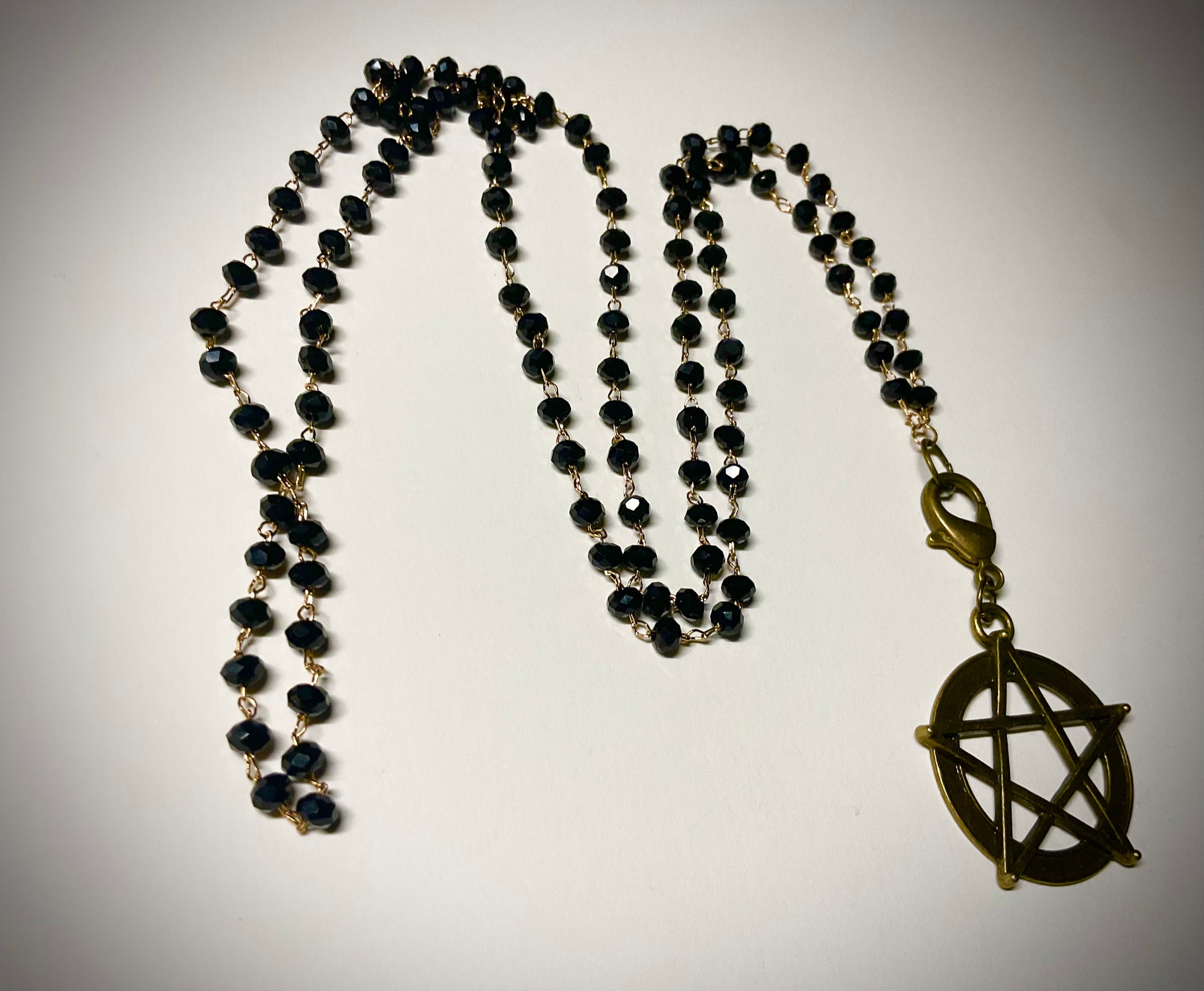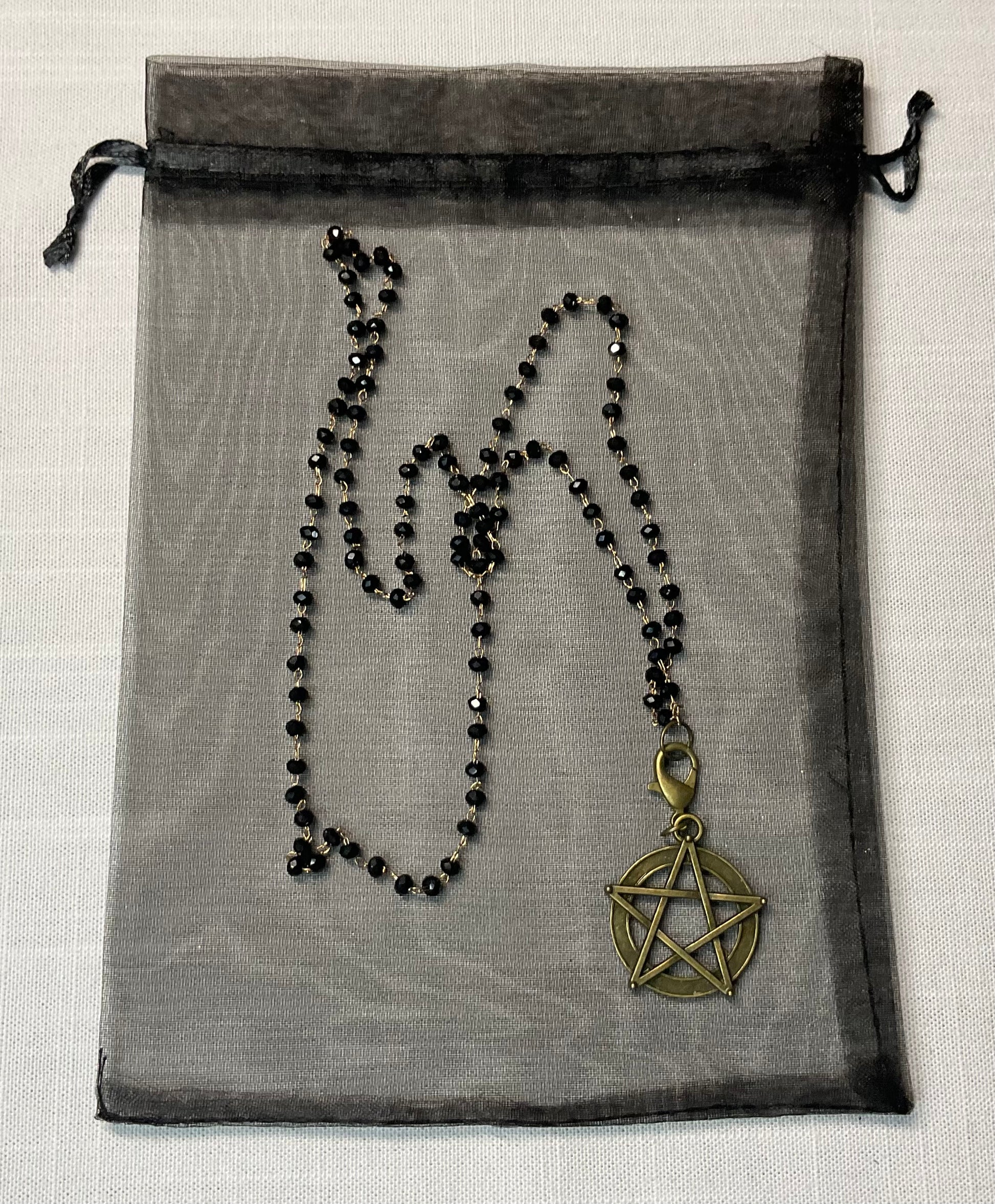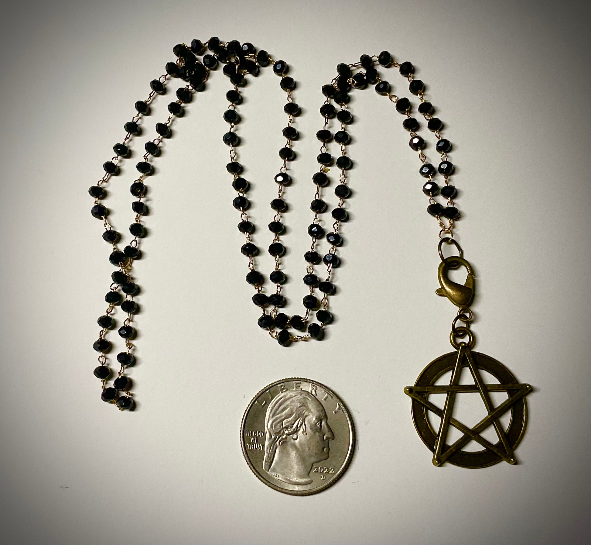 The symbol of the Pentagram is a protective symbol of good magic(k) and combines the 4 elements of Fire, Water, Air and Earth with the topmost point representing the element of Spirit, manifesting and directing the other four…united in the circle it is a symbol of wholeness…this necklace Is a small and delicate appearing interwoven pentacle (1 inch) on a lobster claw in bronze tone (points extend slightly beyond the circle of the Pentacle) on a 24” beaded (3.5mm black crystal glass beads…very delicate) copper chain (no clasp)…there’s lots of sparkle here and we love that…it inspires magic when it sparkles in the candlelight or in the Full Moon.