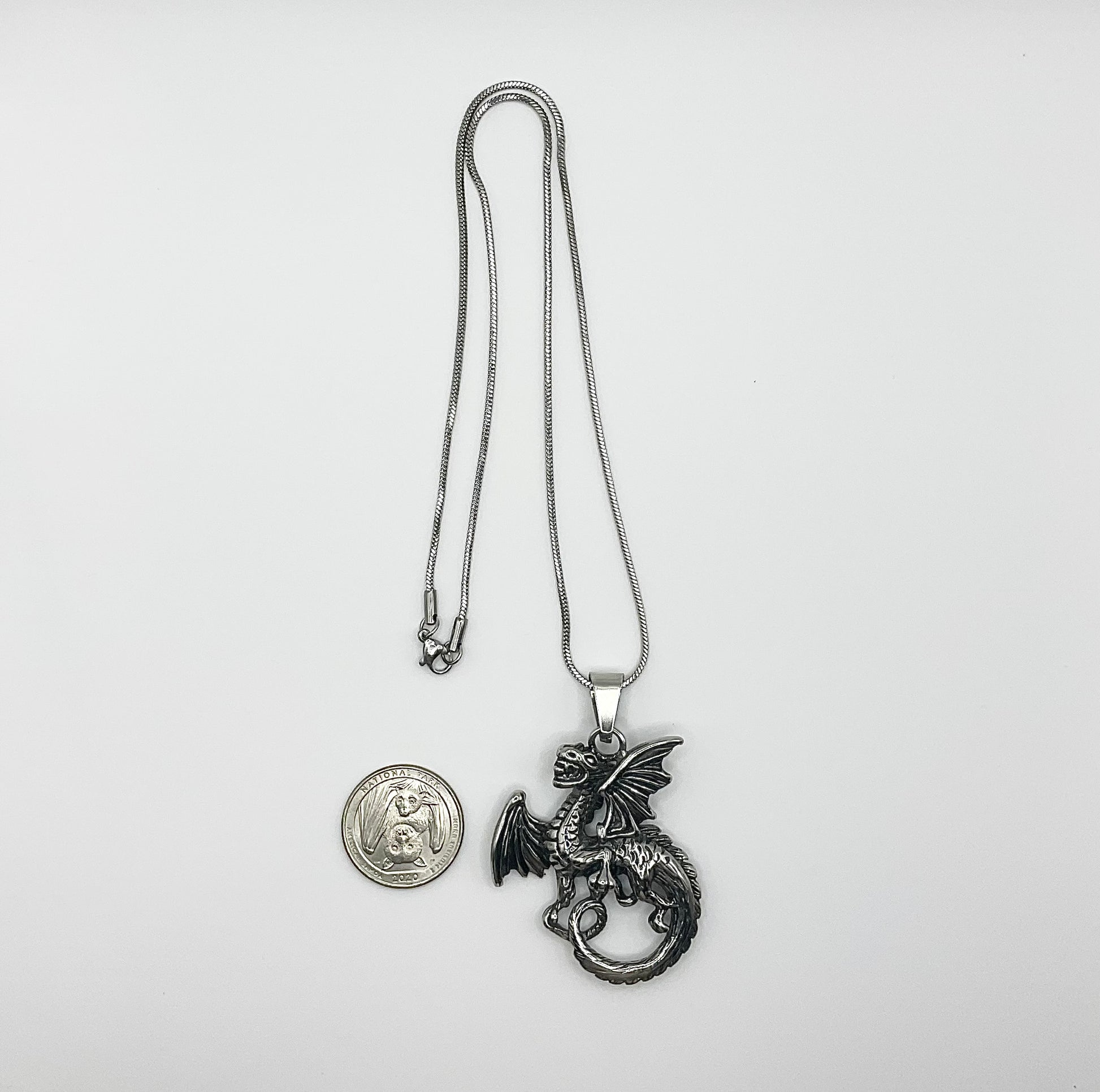 Stainless Steel Dragon Talisman Necklace – 62.2mm x 44.2mm Pendant on a 24”, 304 Grade, 1.5mm thin Hypoallergenic Surgical Stainless Steel Round Snake Chain.
