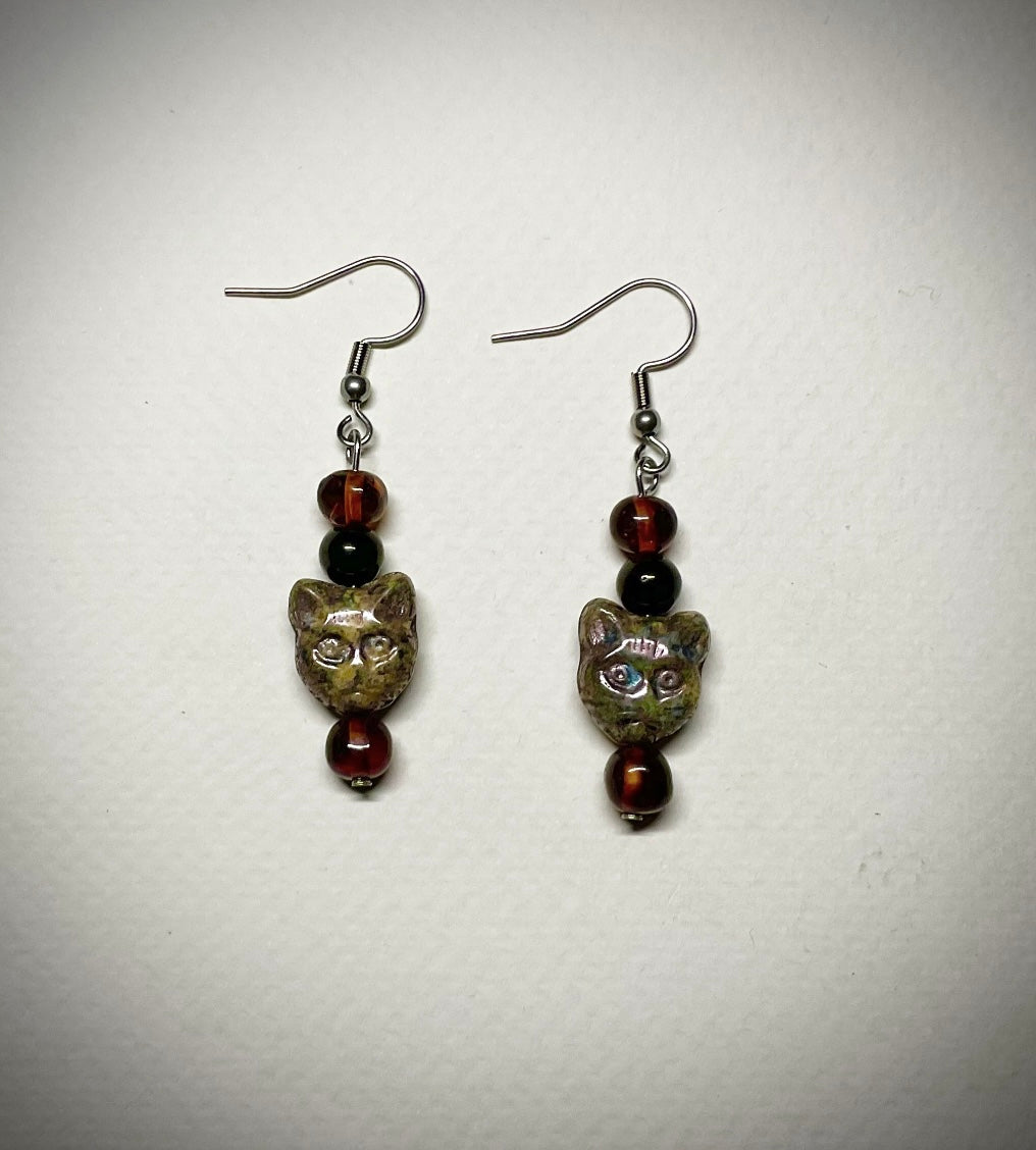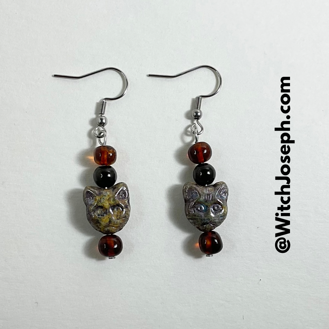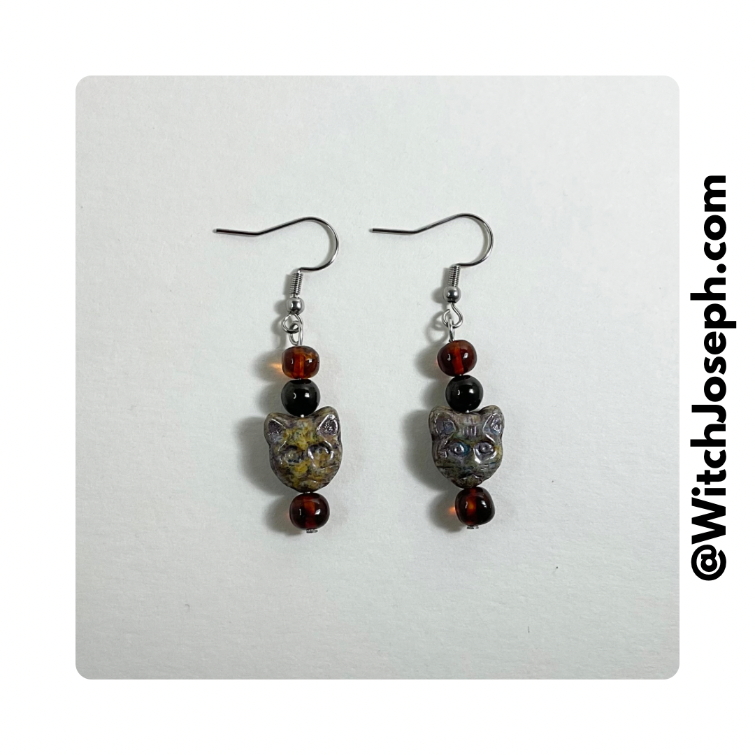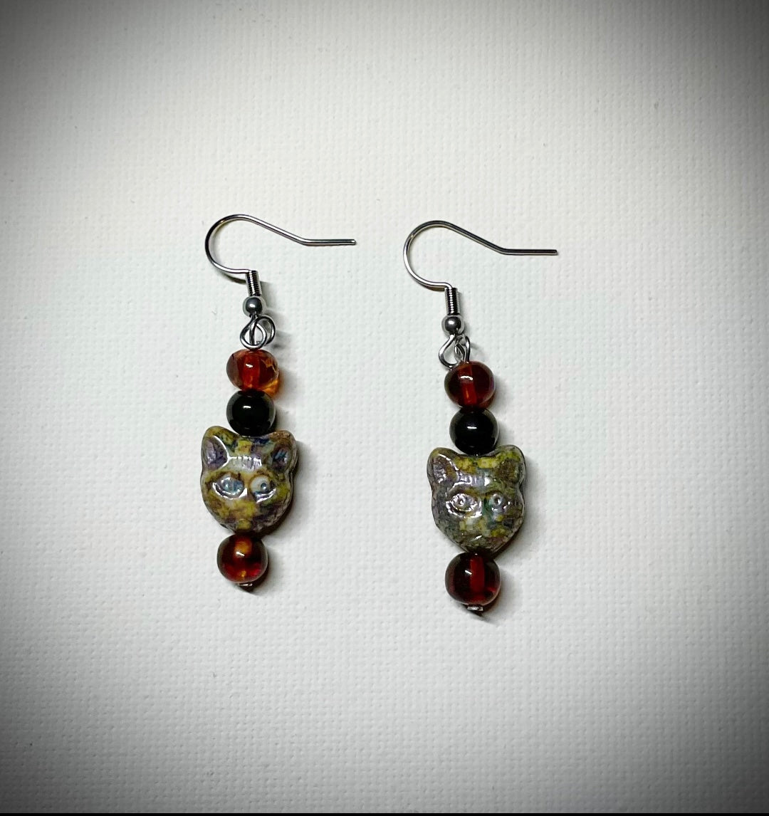 A Simple pair of gorgeous Goddess Bastet dangle…on stainless steel fish hook earrings with Baltic amber and jet beads…the Cat head is a Czech glass bead…a true statement piece.