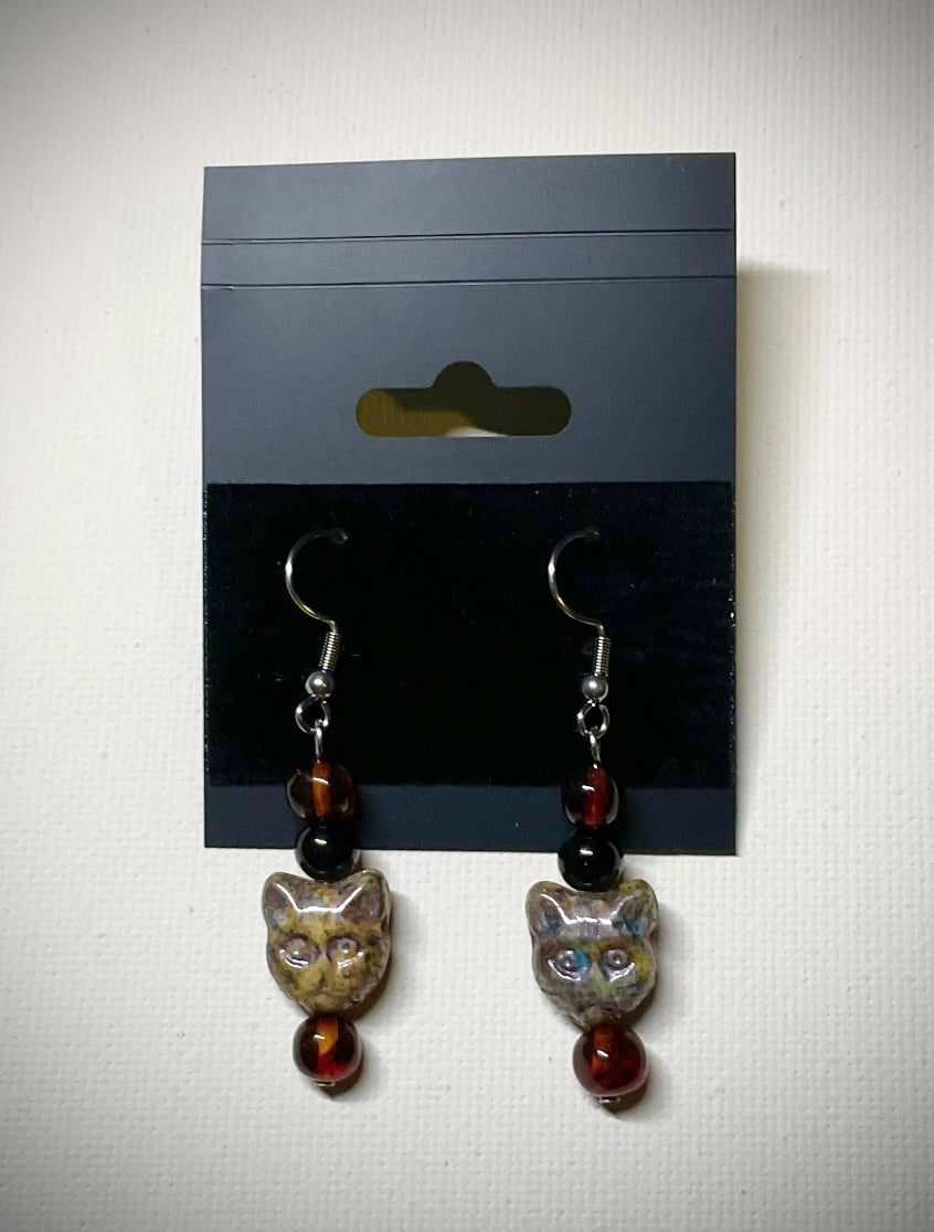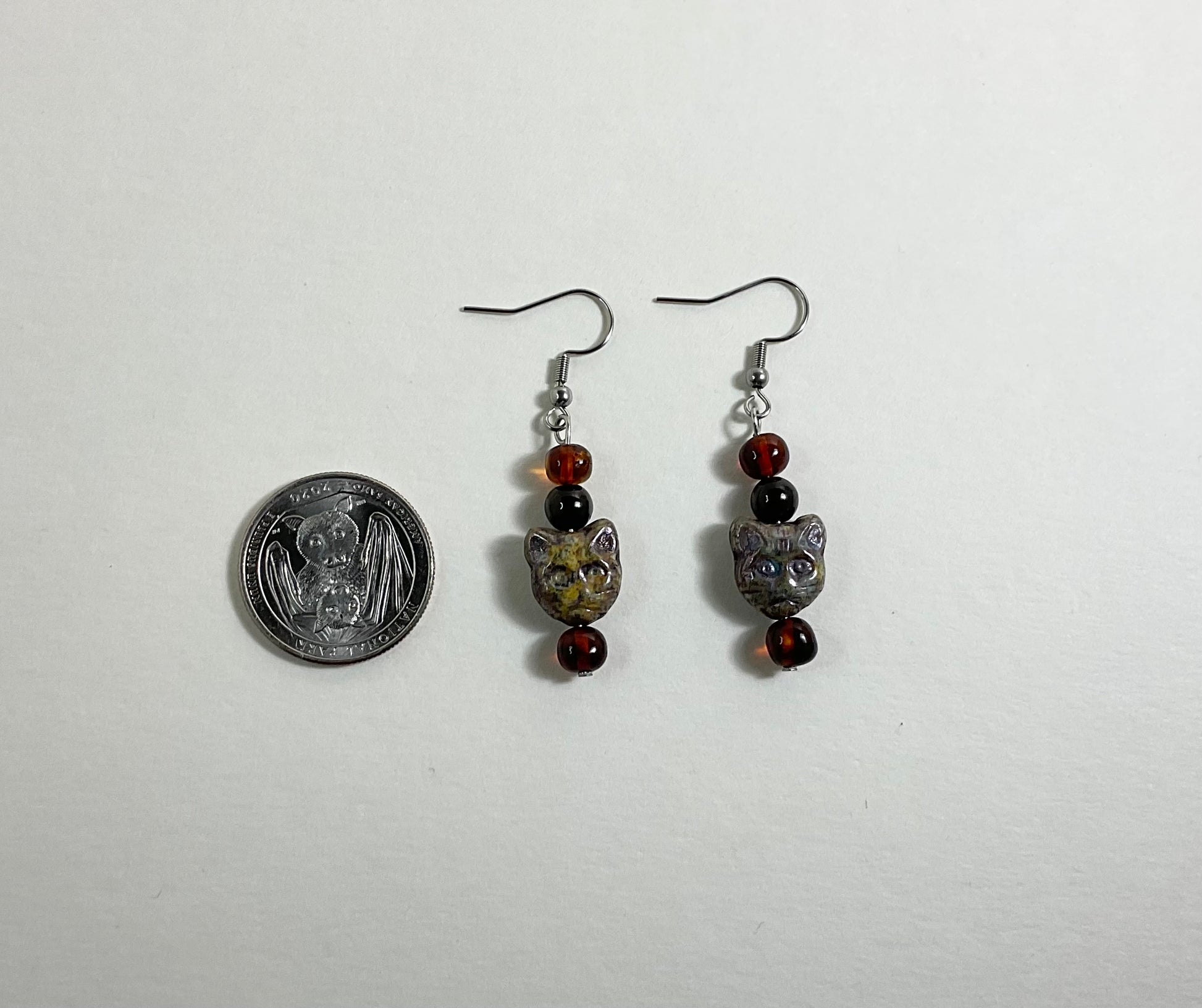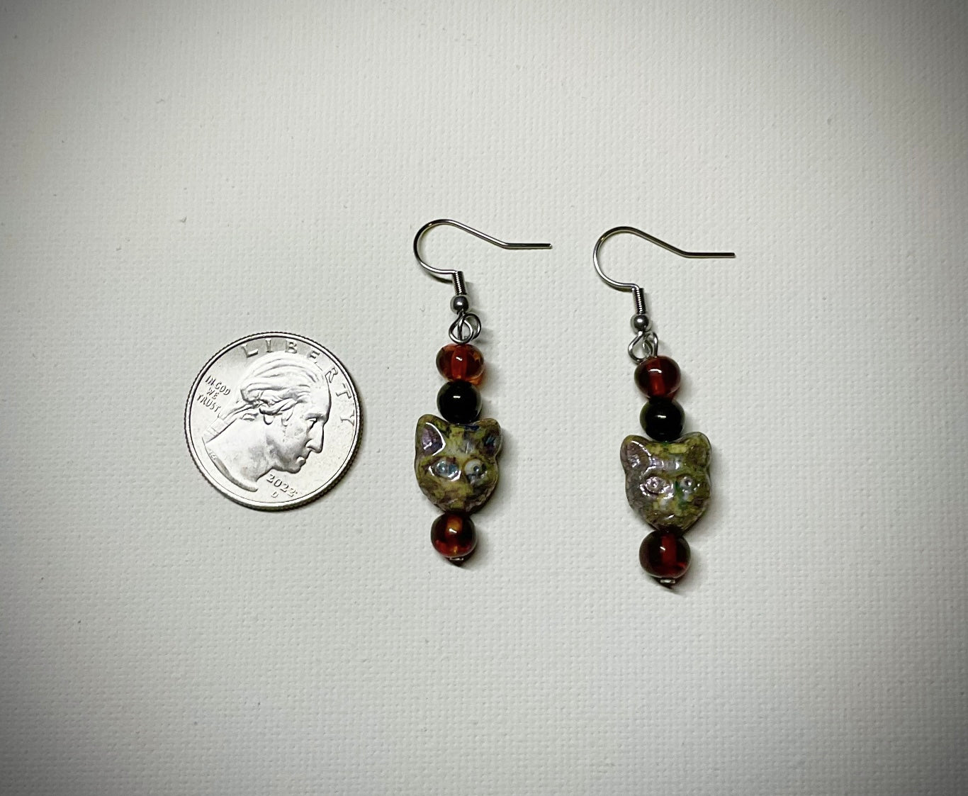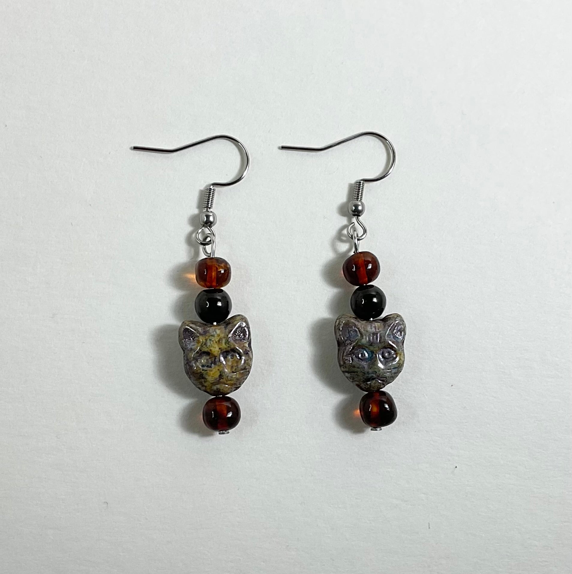 A Simple pair of gorgeous Goddess Bastet dangle…on stainless steel fish hook earrings with Baltic amber and jet beads…the Cat head is a Czech glass bead…a true statement piece.