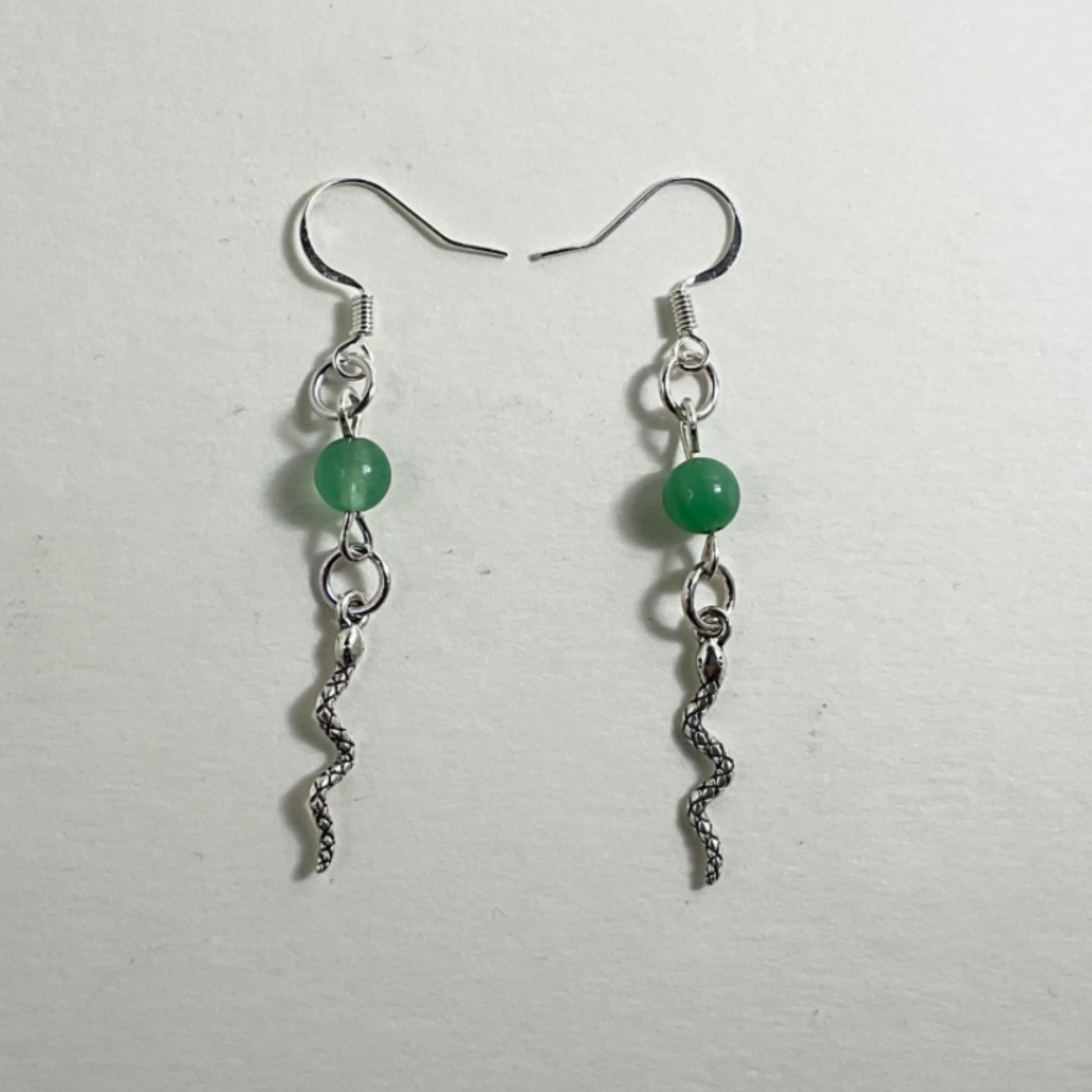 Our Snakes of Eden Earrings are hand made by Witch Joseph with a 6mm aventurine bead and an adorable silver tone snake charm…whole earring hangs approximately 2”.