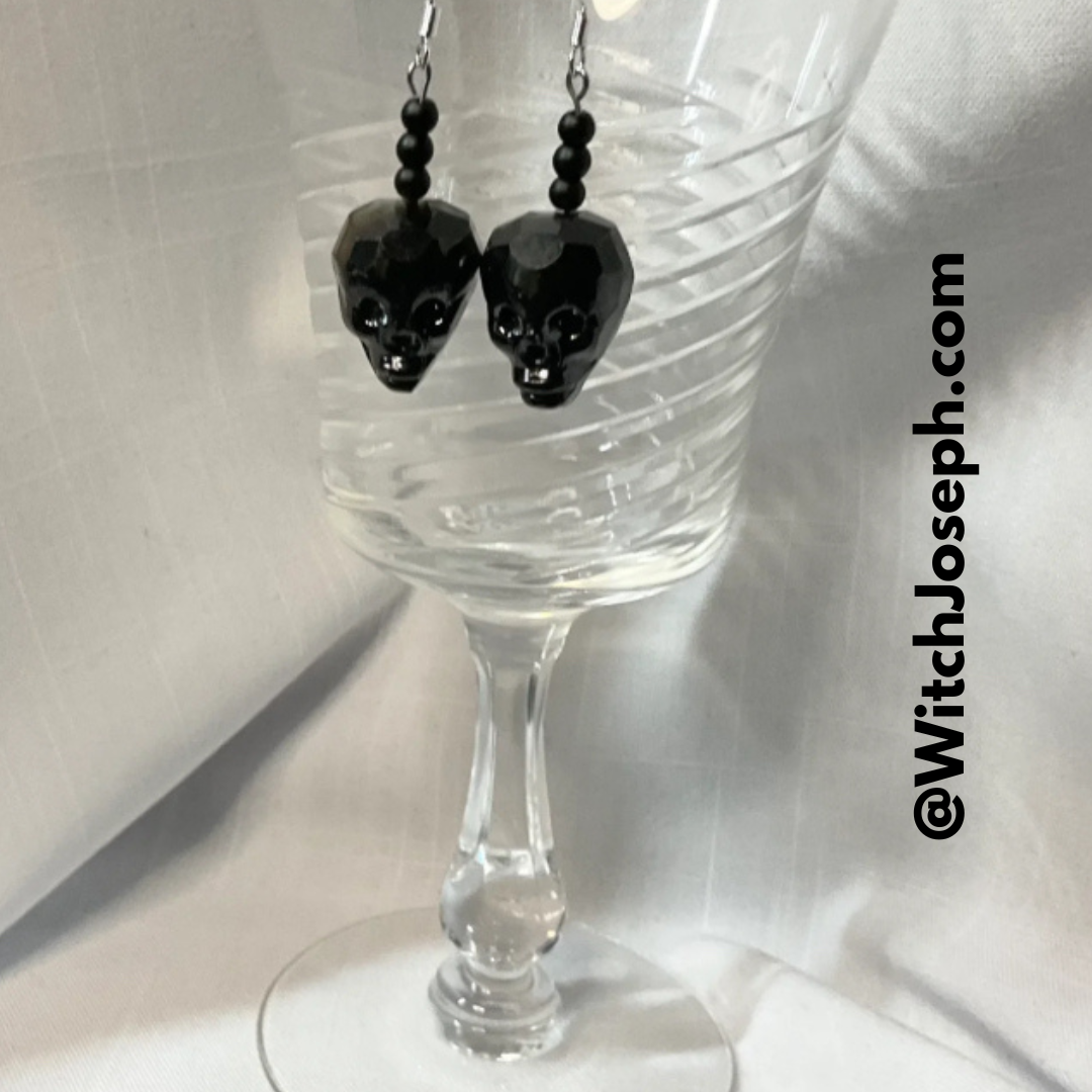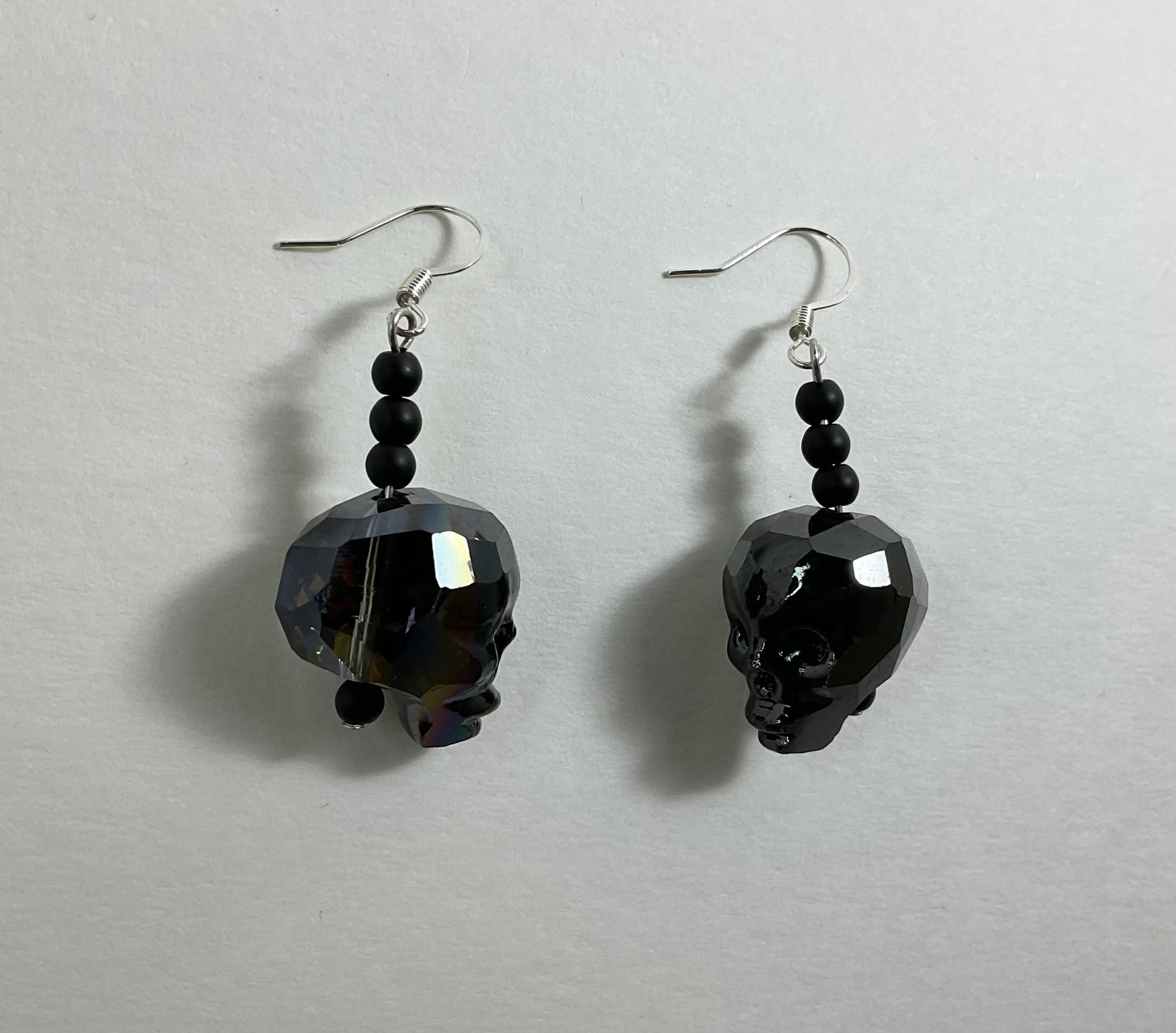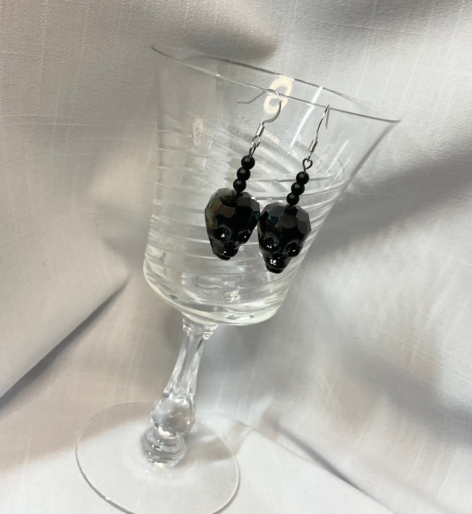Gorgeous Skull Dangle earrings…with black bead accents on stainless steel fish hook style earrings. Skulls are glass black faceted 20mm x 21 mm x 17mm…and stunning.