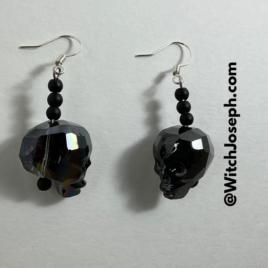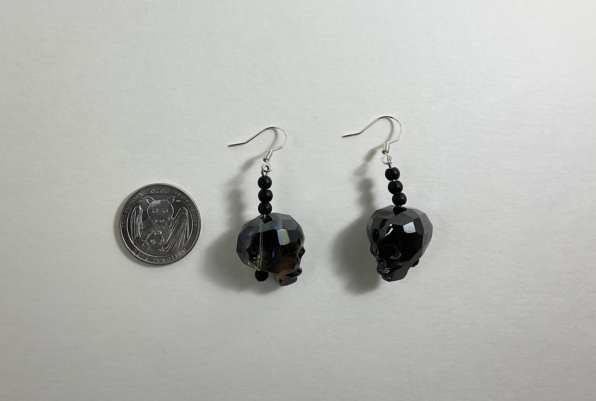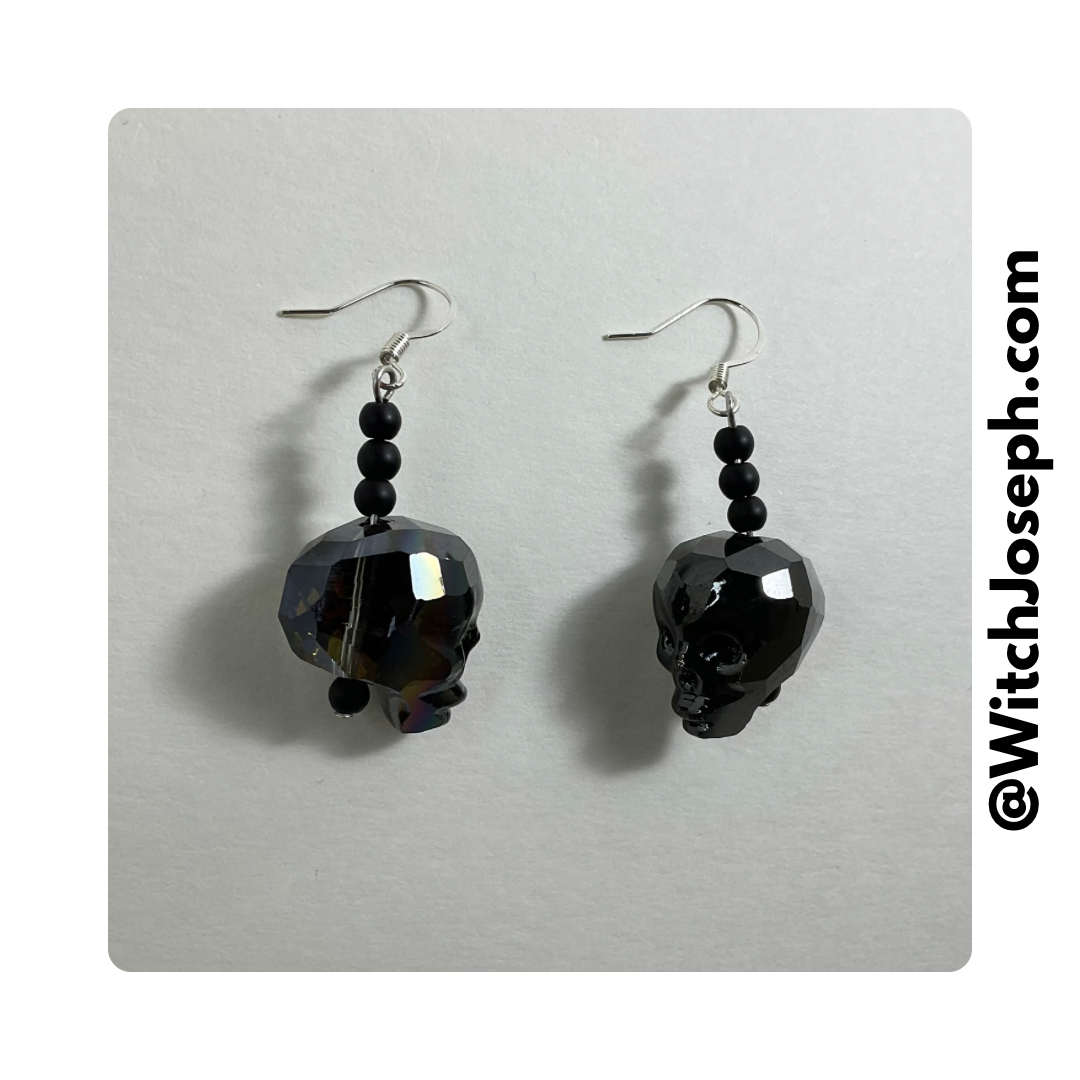 Gorgeous Skull Dangle earrings…with black bead accents on stainless steel fish hook style earrings. Skulls are glass black faceted 20mm x 21 mm x 17mm…and stunning.