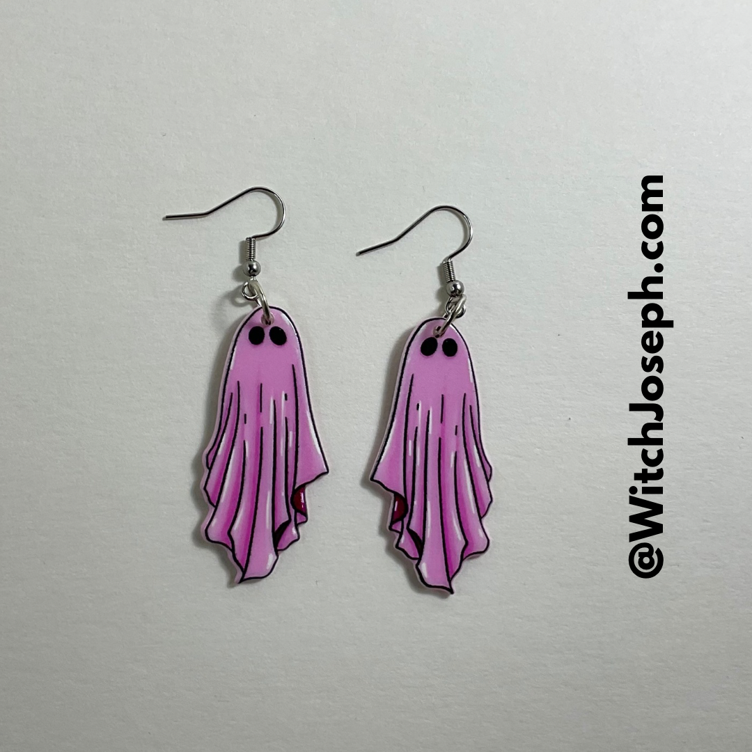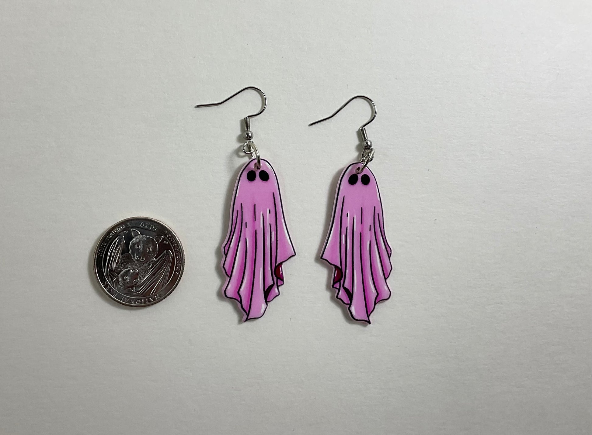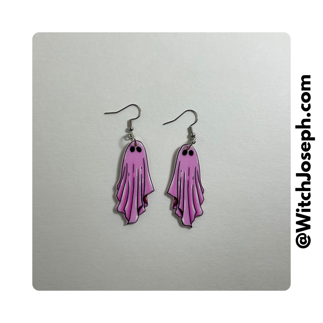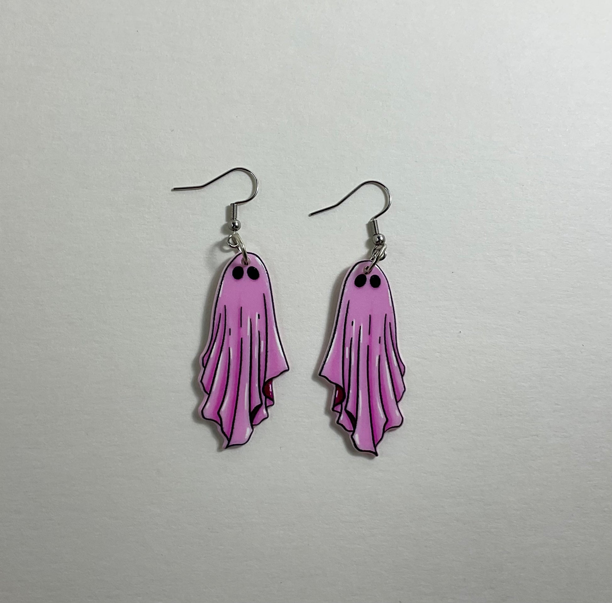 Pink Ghost earrings (approximately 1.5”x.750”) made from acrylic…on dangle fish hook earrings (stainless steel). These cuties are sure to attract attention.