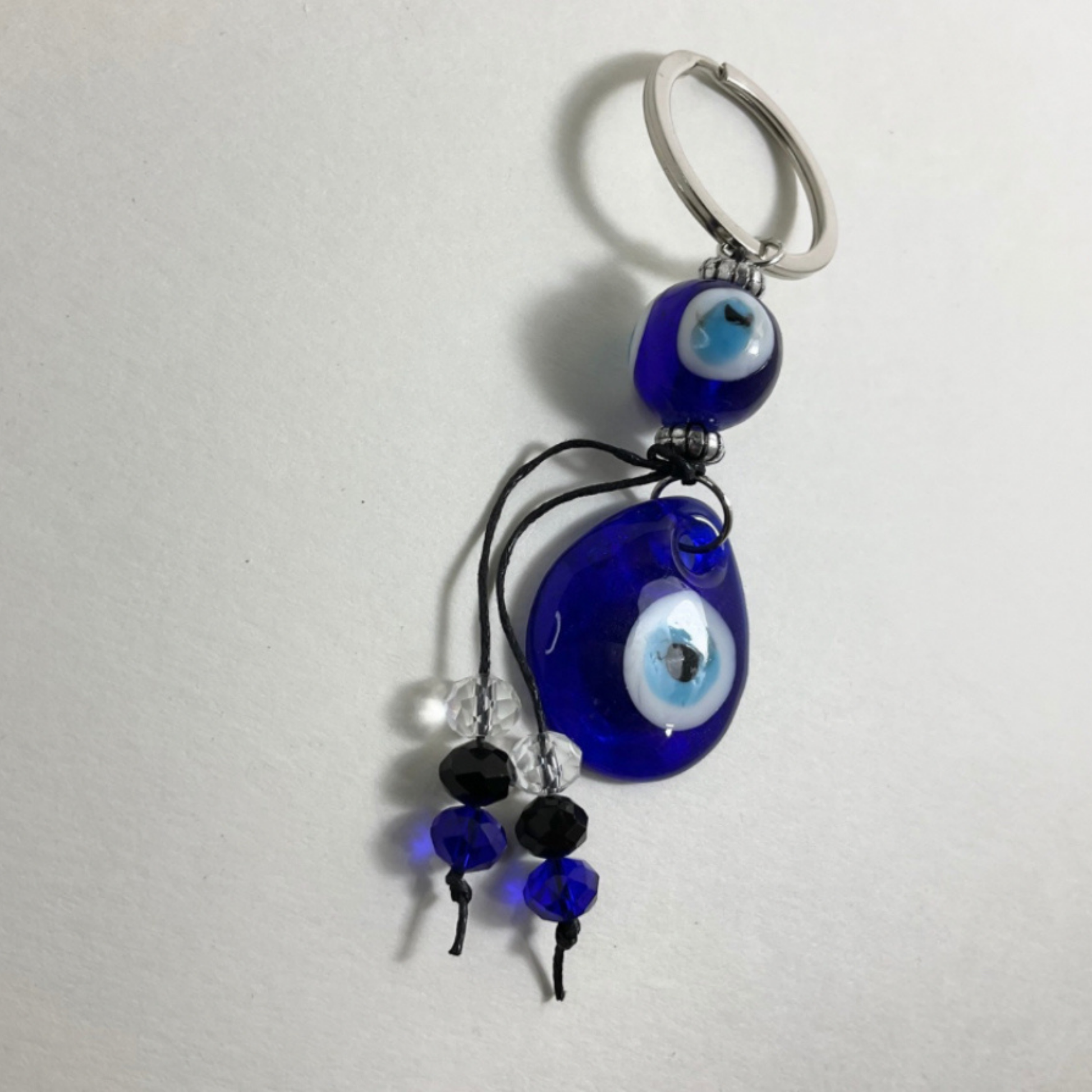 A keychain created out of Evil Eye glass pieces and color coordinated beads.