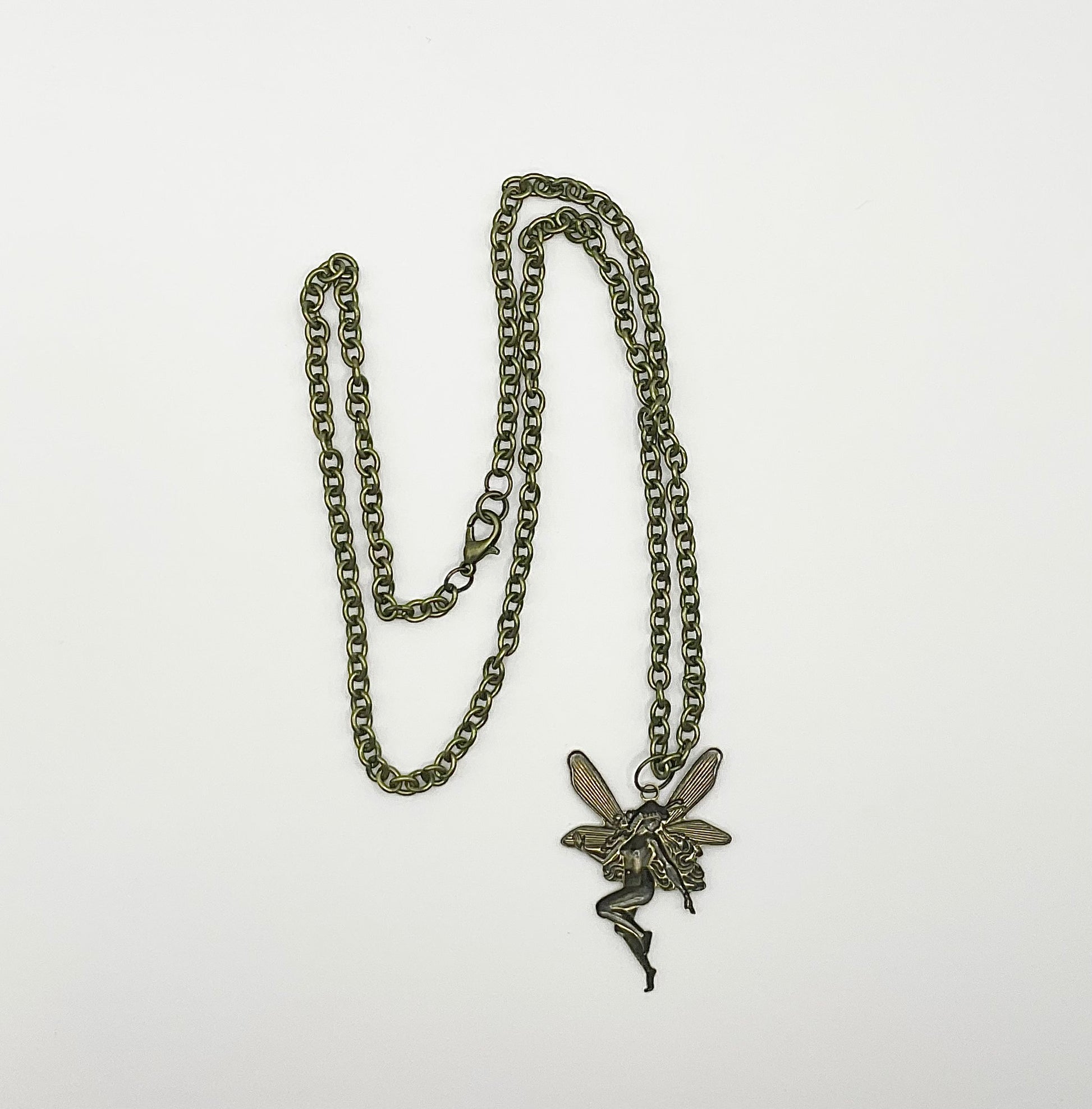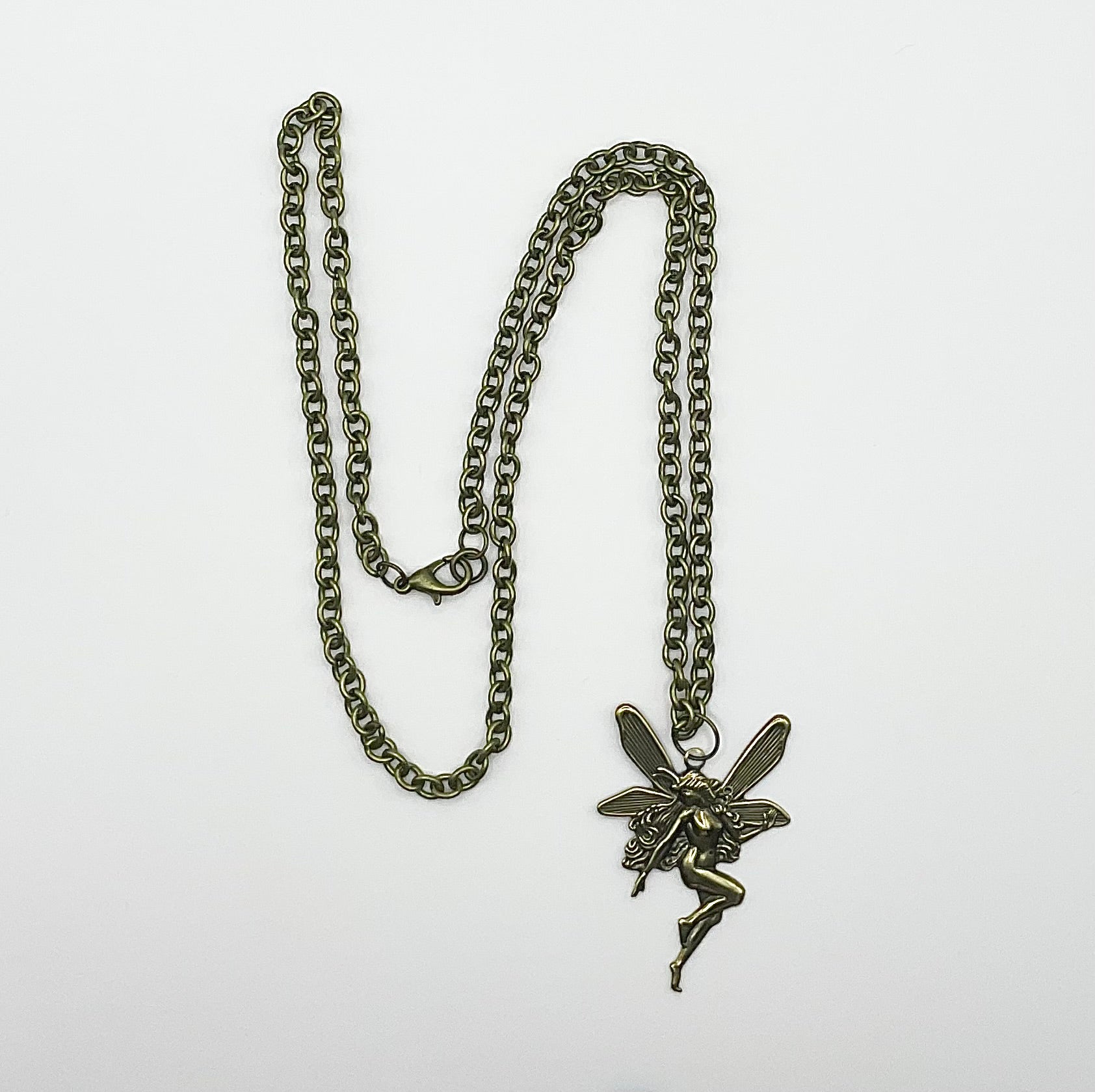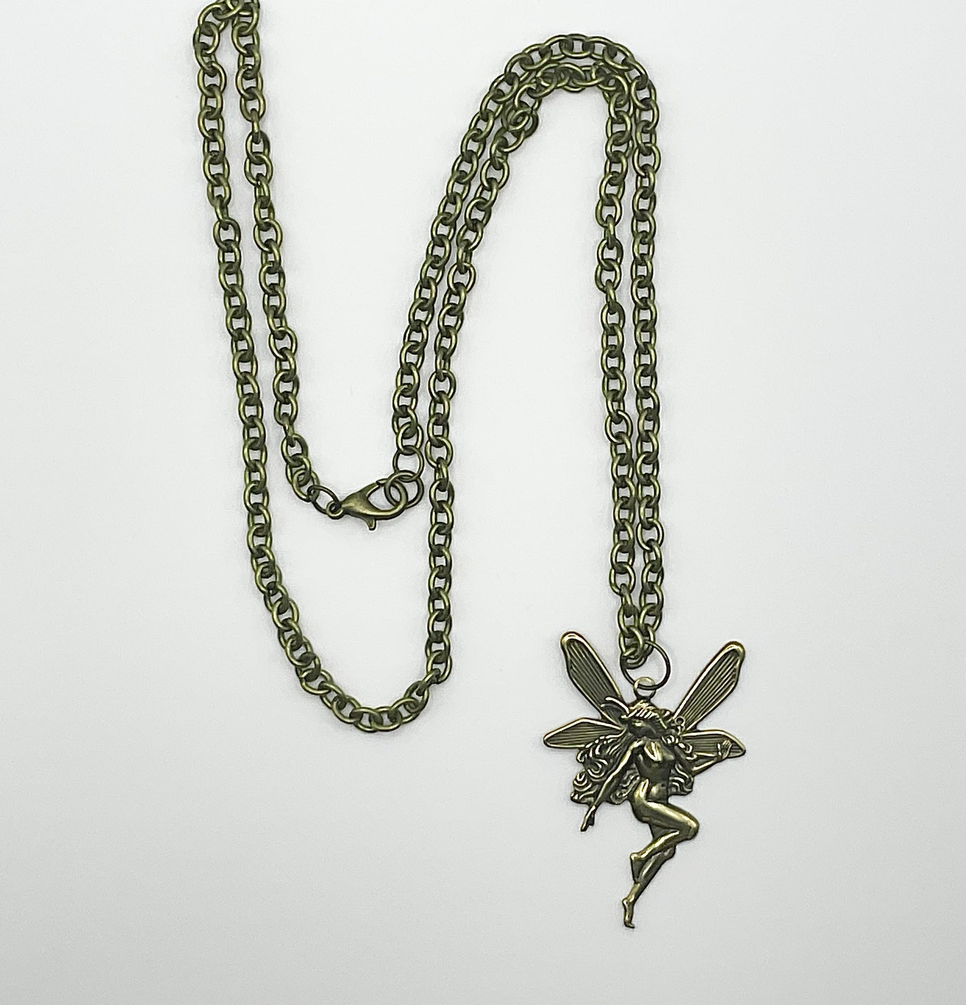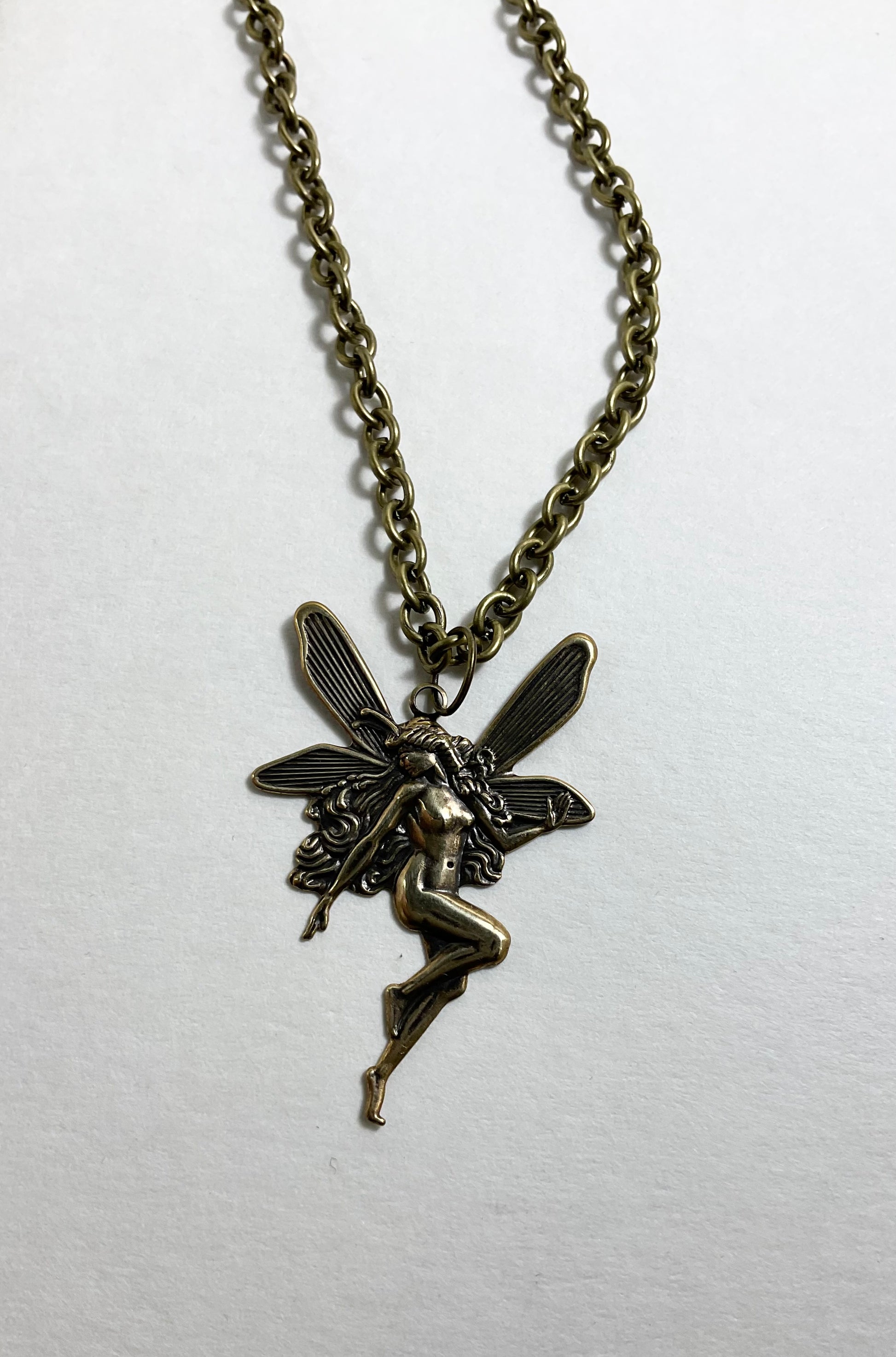 Gorgeous Antique Brass Tone Fairy (45mm X 30mm) pendant on a 22” bronze tone chain with lobster clasp. This is a stunning statement piece, hand curated and put together by Witch Joseph…makes an excellent gift…for yourself or others.