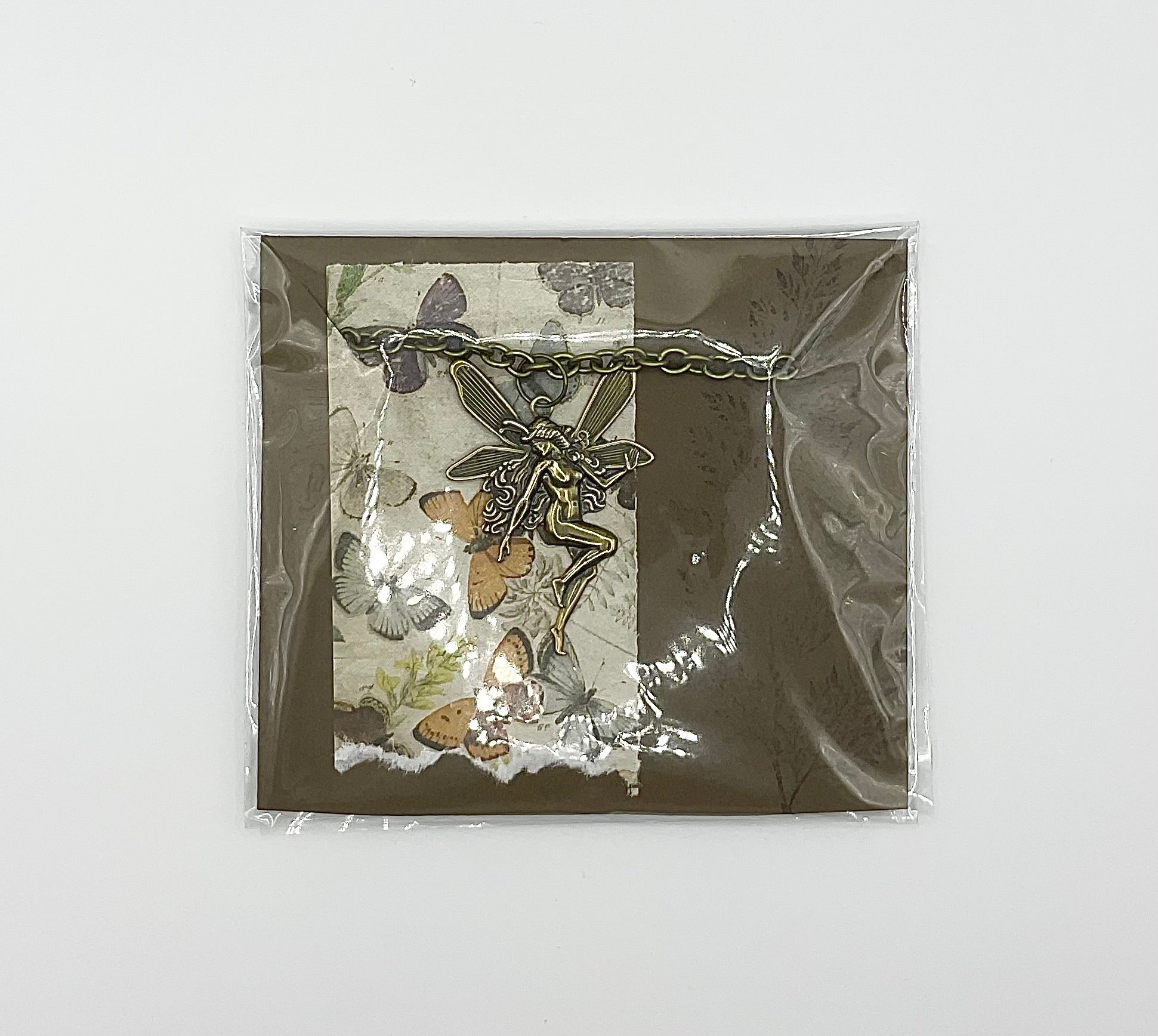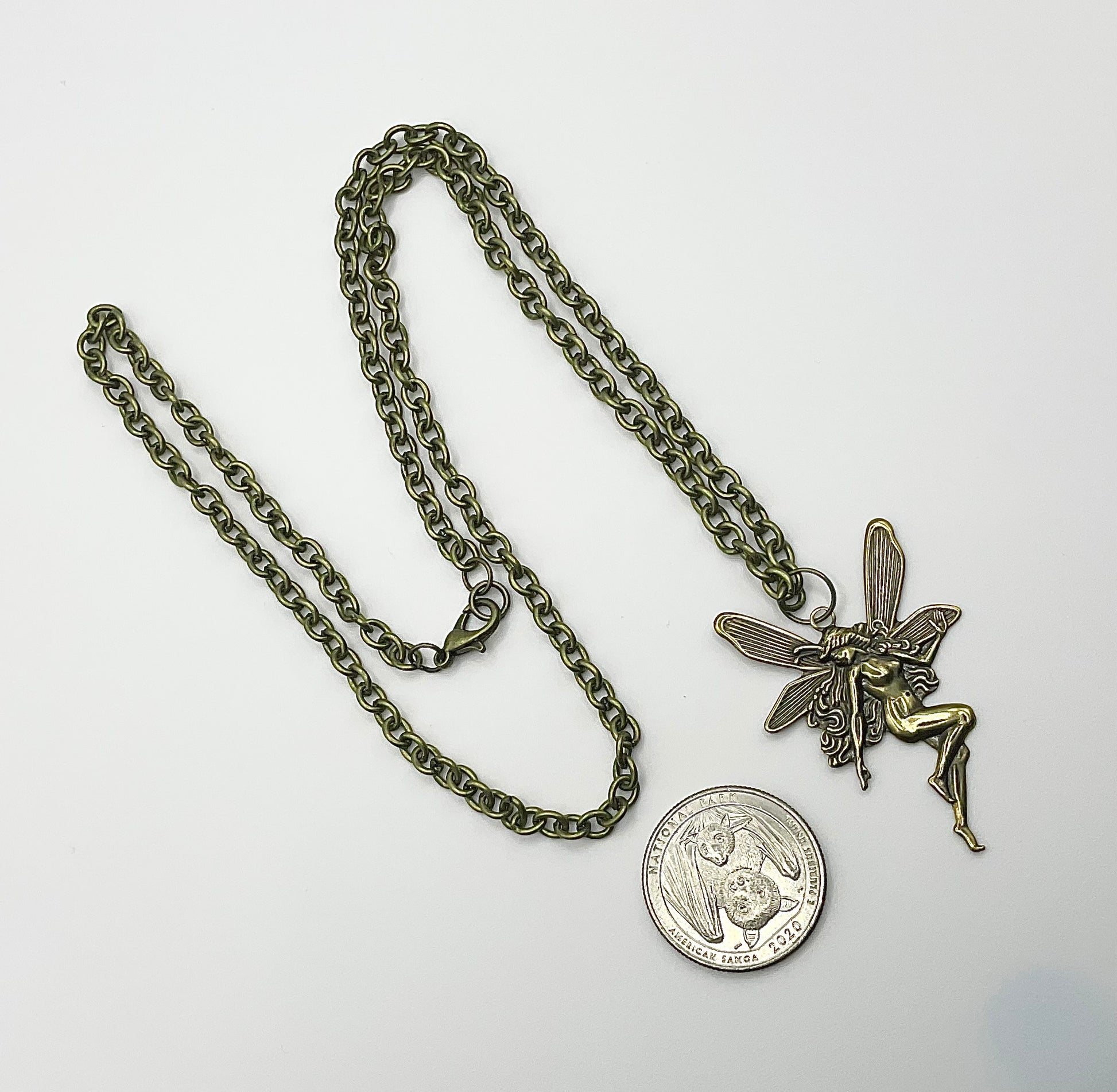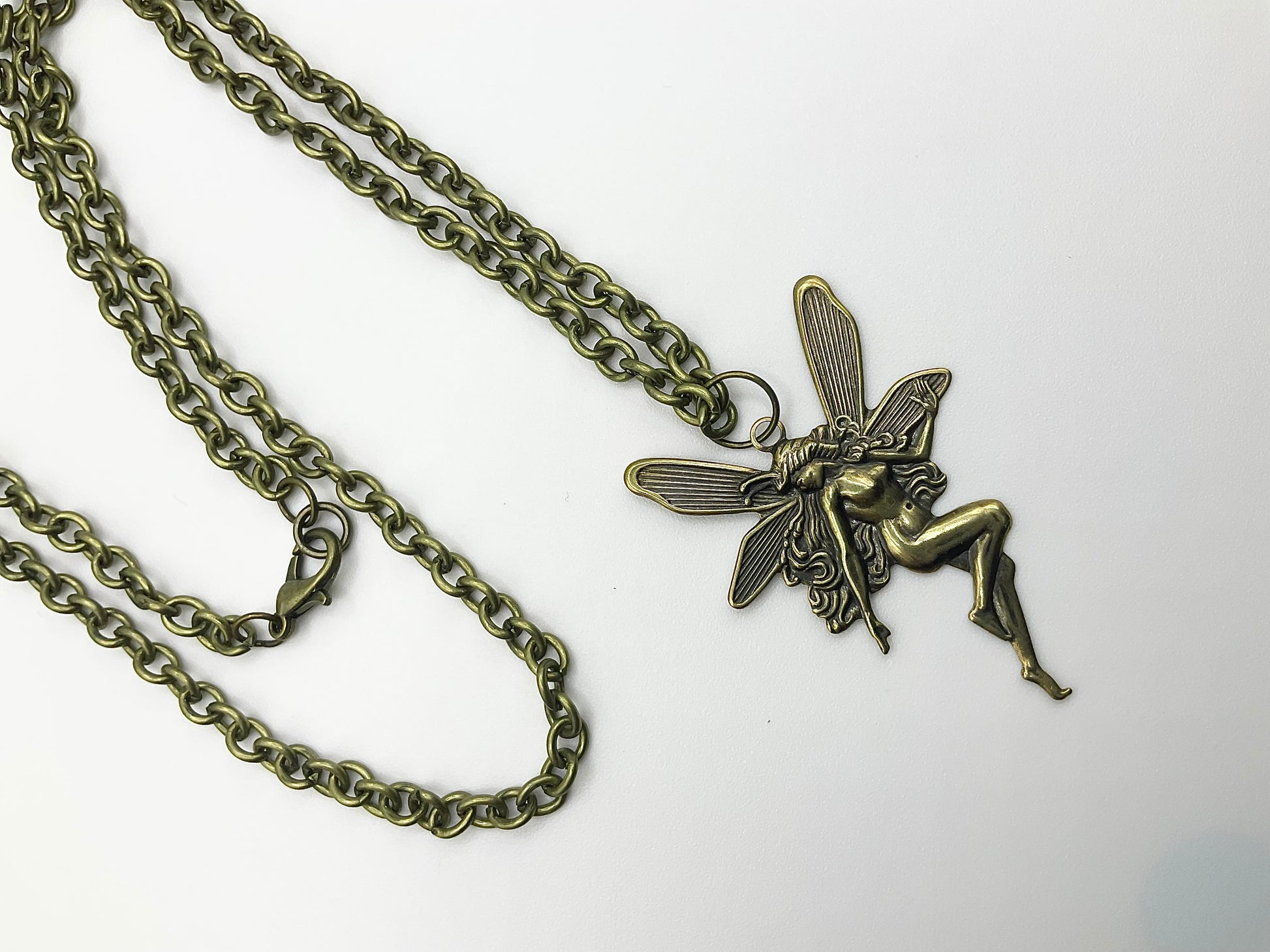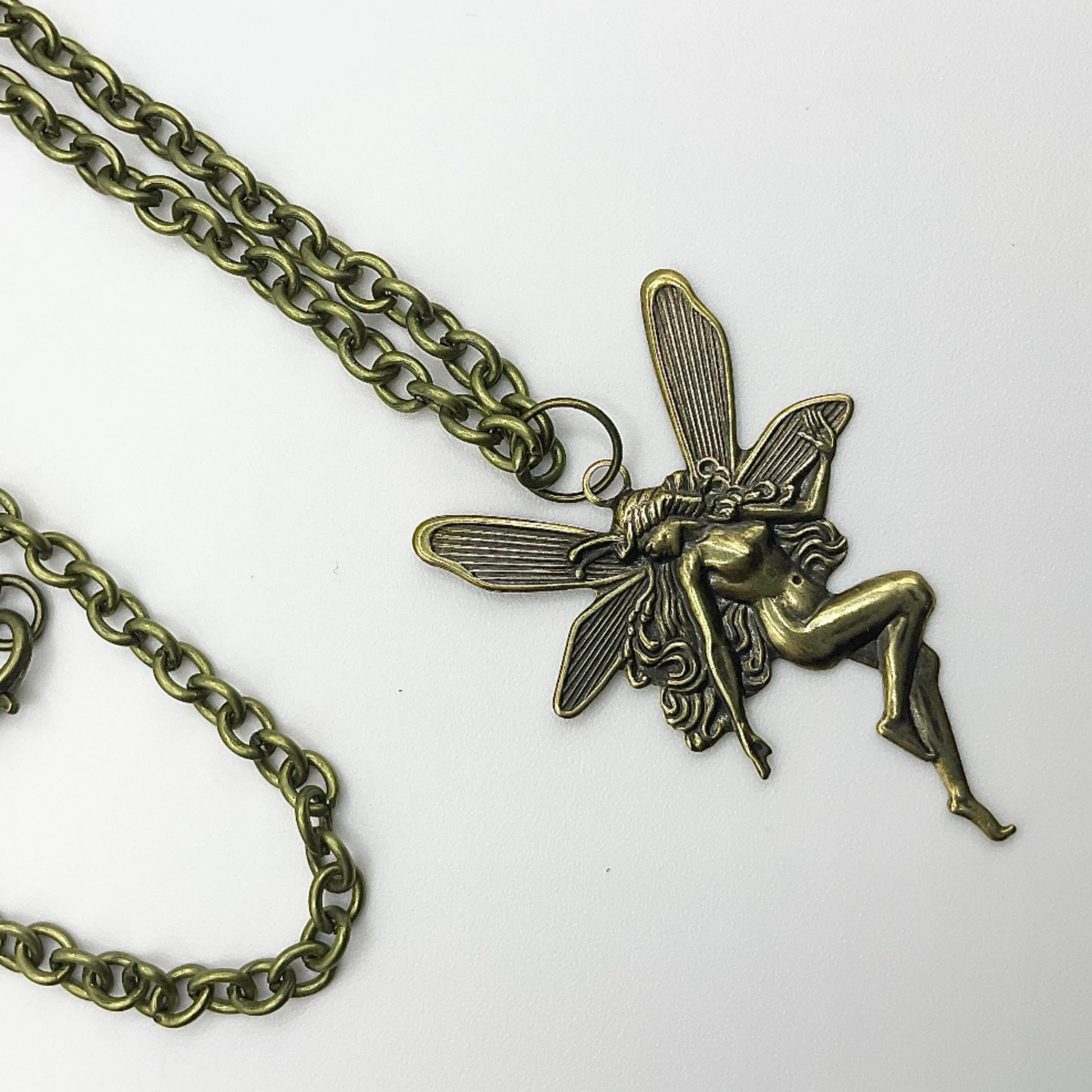 Gorgeous Antique Brass Tone Fairy (45mm X 30mm) pendant on a 22” bronze tone chain with lobster clasp. This is a stunning statement piece, hand curated and put together by Witch Joseph…makes an excellent gift…for yourself or others.
