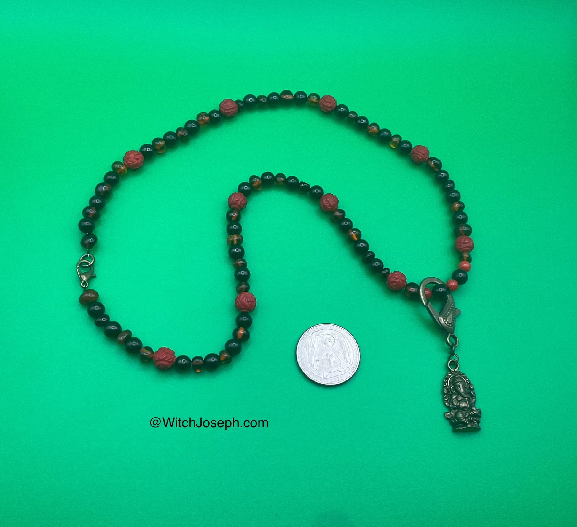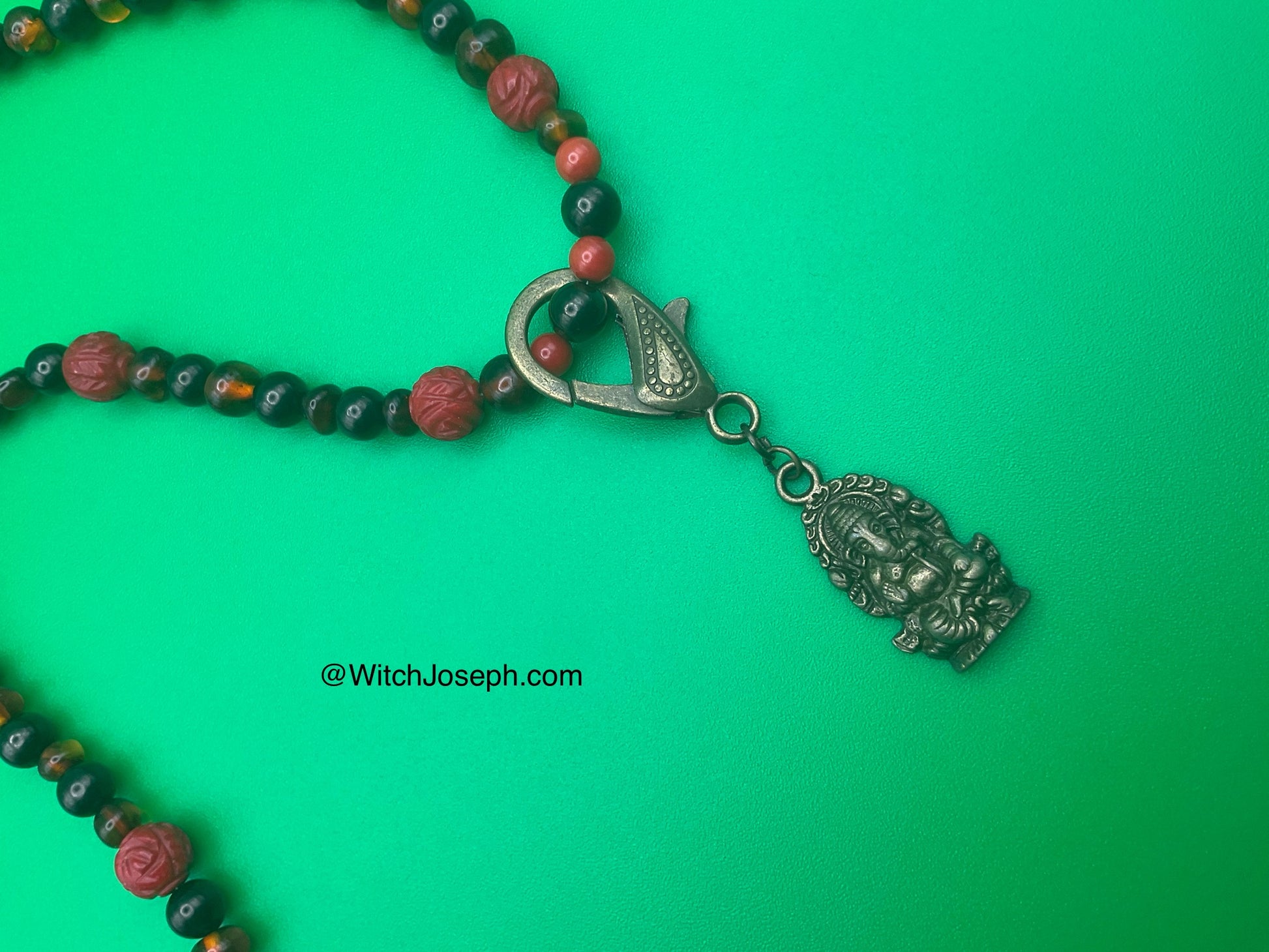 Ganesha Talisman with Amber and Jet and Red Coral Rose accents