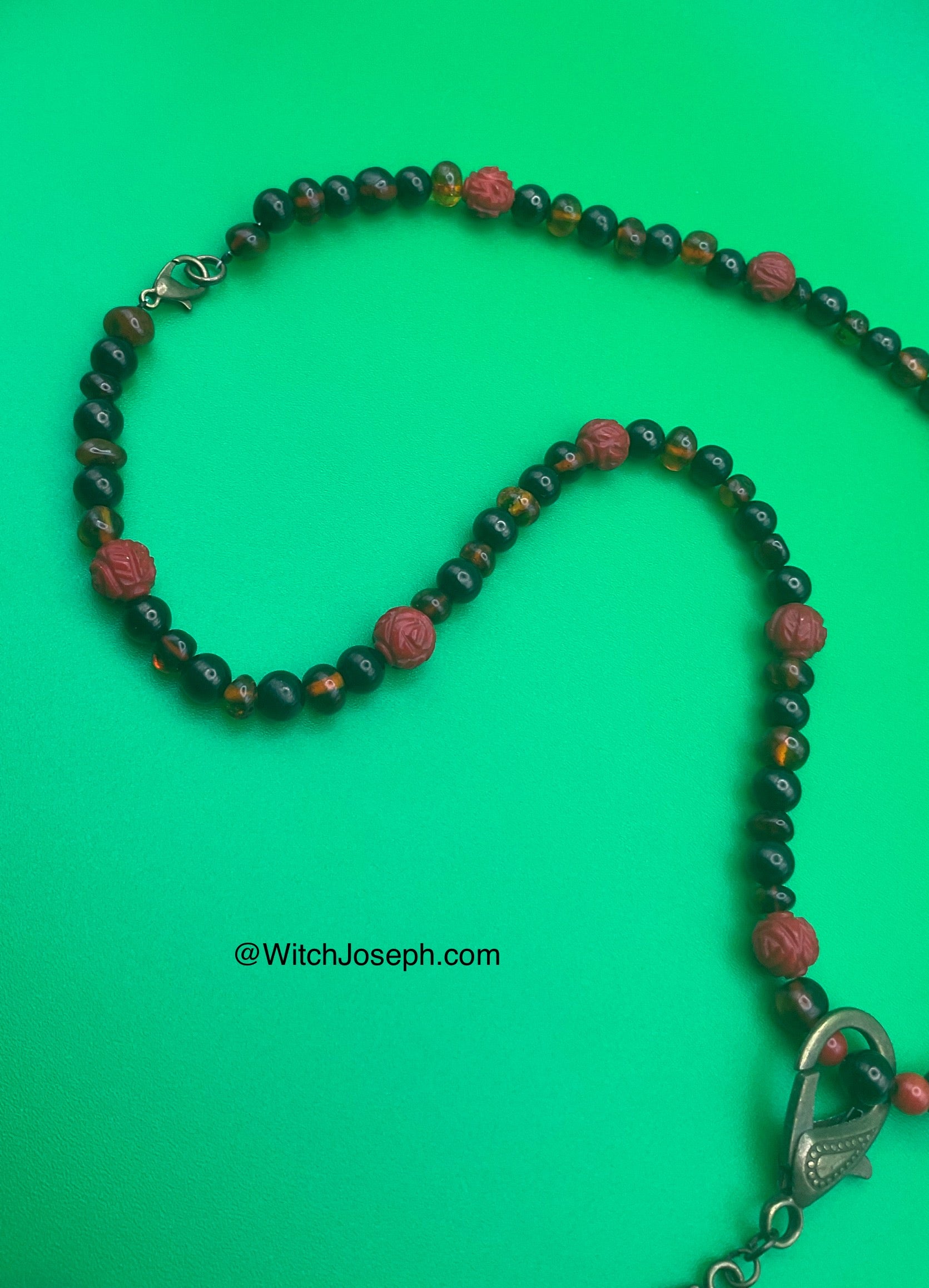 The strand combines the grounding power of Jet with the warm, protective energy of Amber, accented with red coral beads in both round and rose cut styles. A secure bronze tone lobster clasp completes the piece, making it both beautiful and durable for ritual or everyday wear.