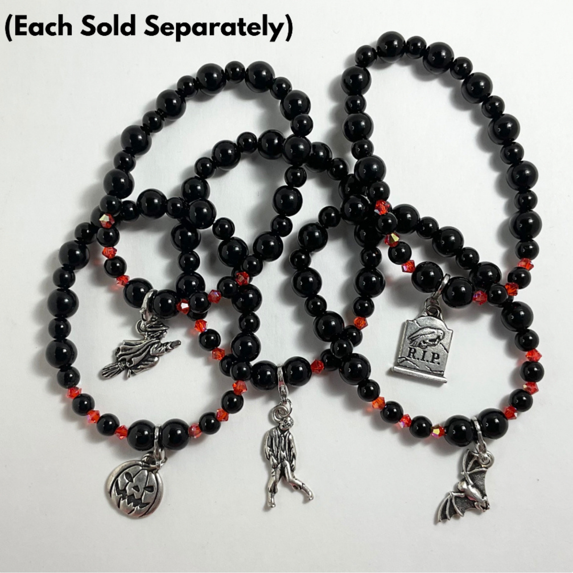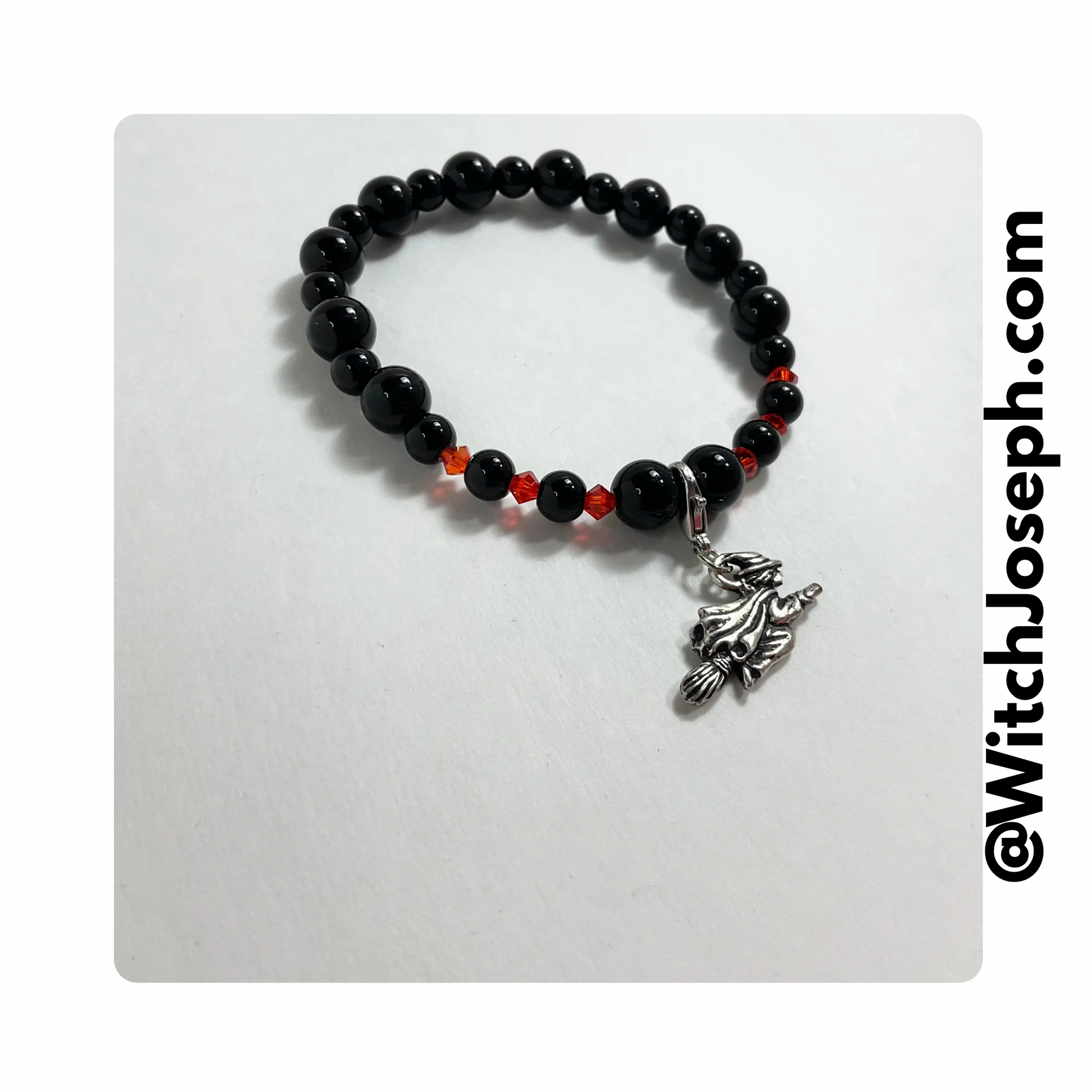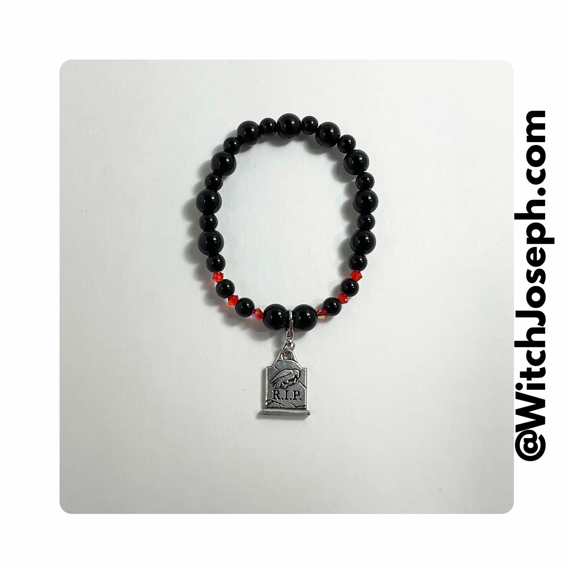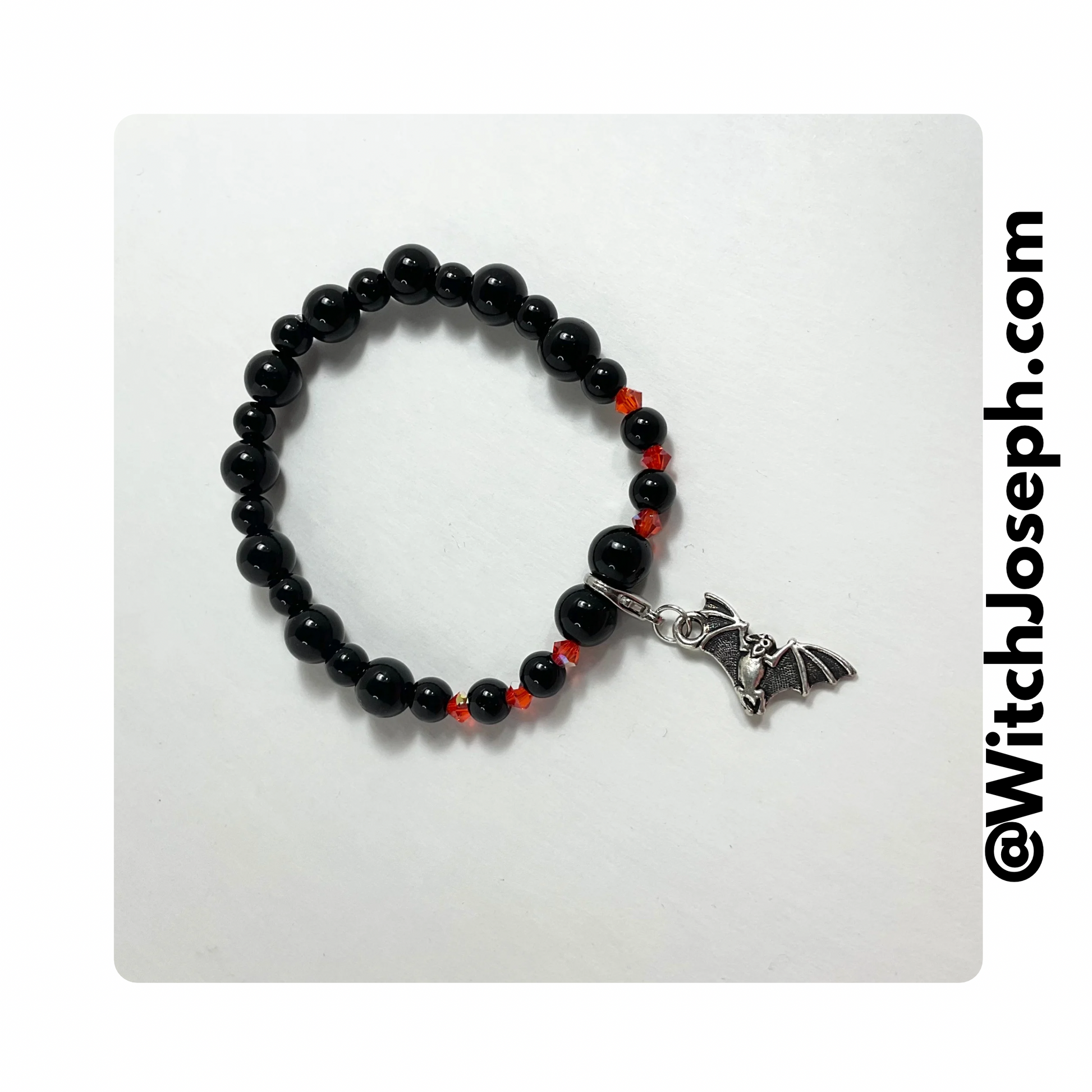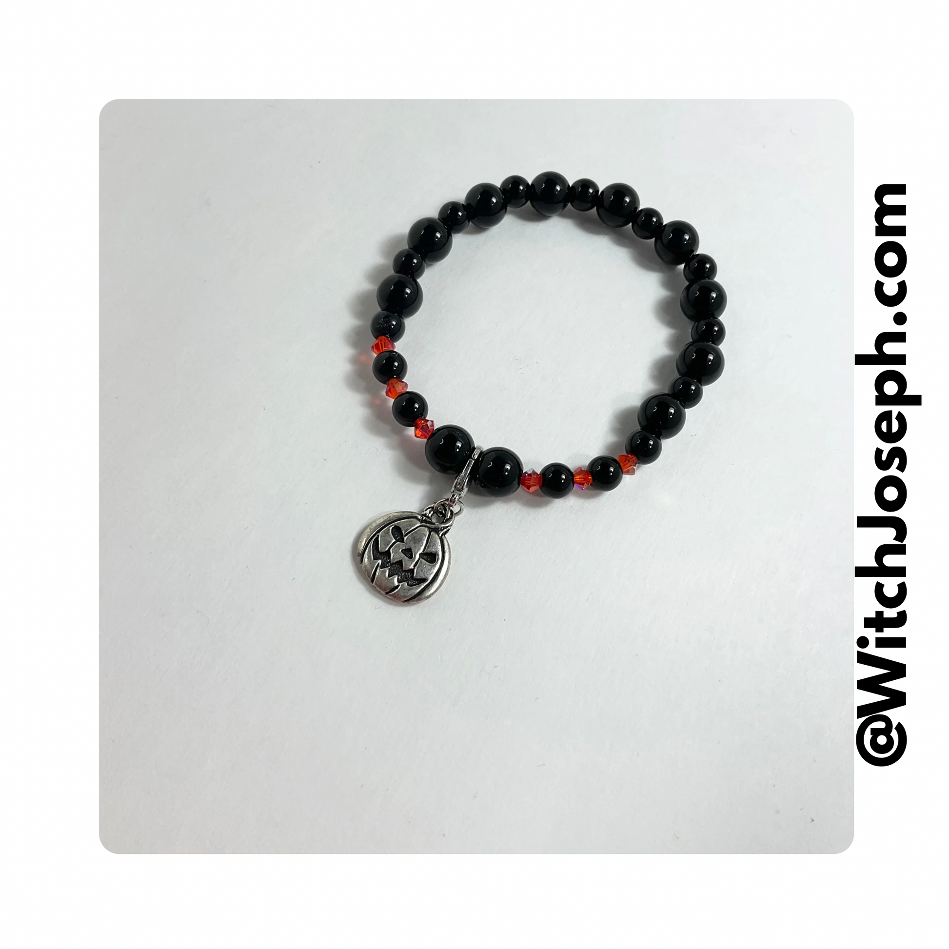 These stunning 6 inch stretch bracelets are hand crafted with love and magick by Brother Christopher right here at Witch house…in celebration of our favorite time of year. Made from black glass beads (8mm and 6mm) and accented with stunning orange Swarovski crystal beads (2mm).