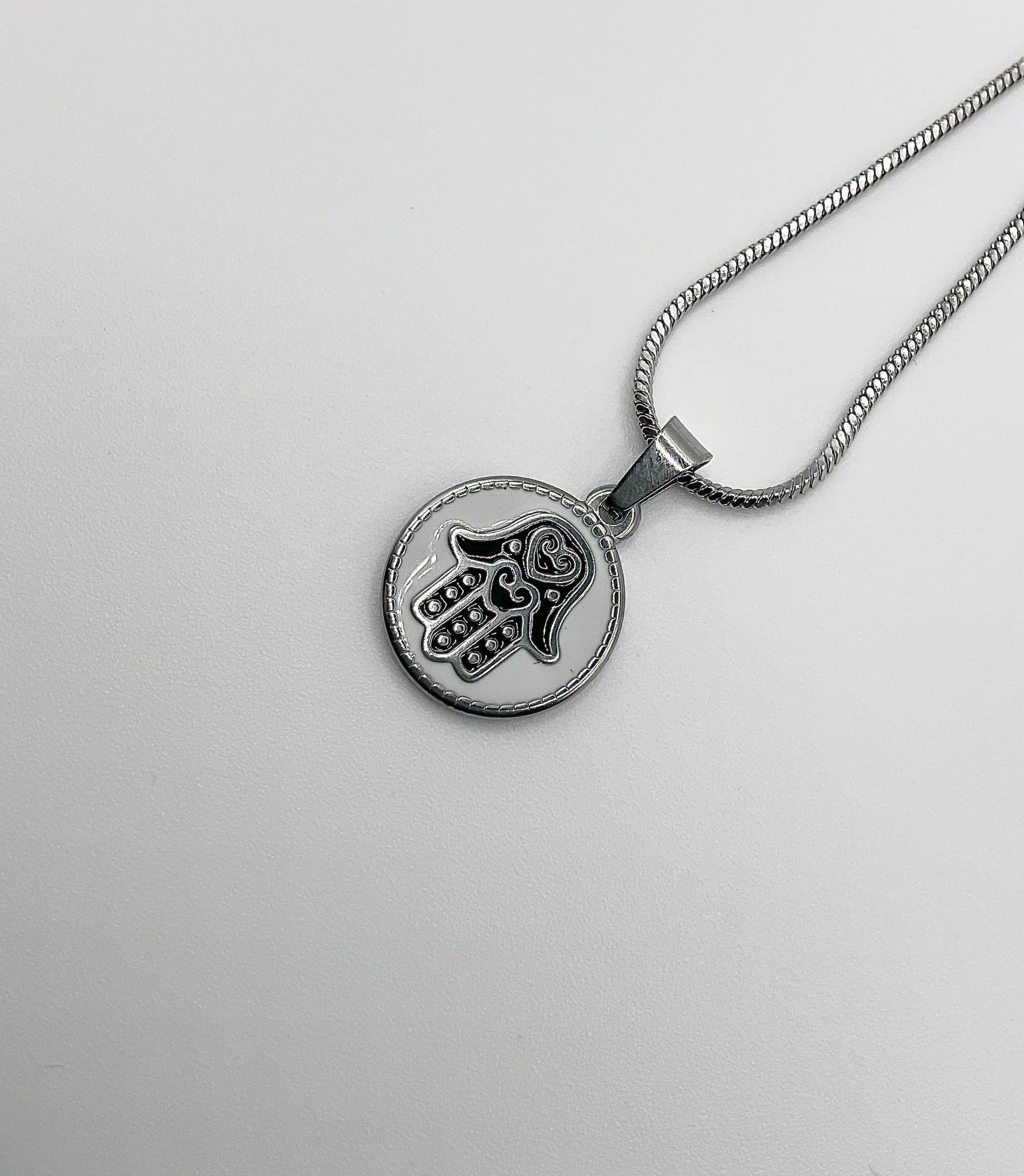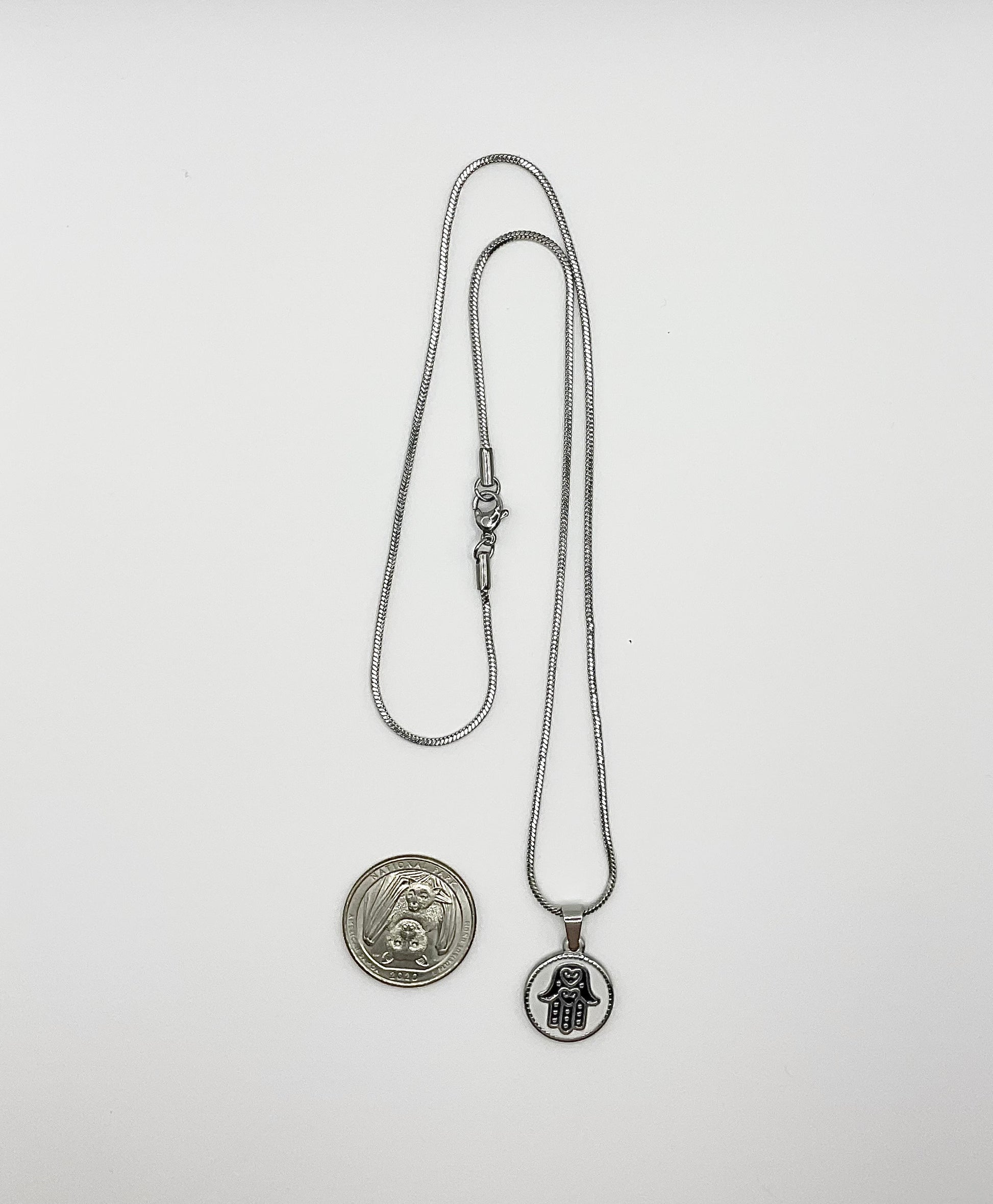 Stainless Steel Hamsa Hand Necklace with White and Black Enamel –