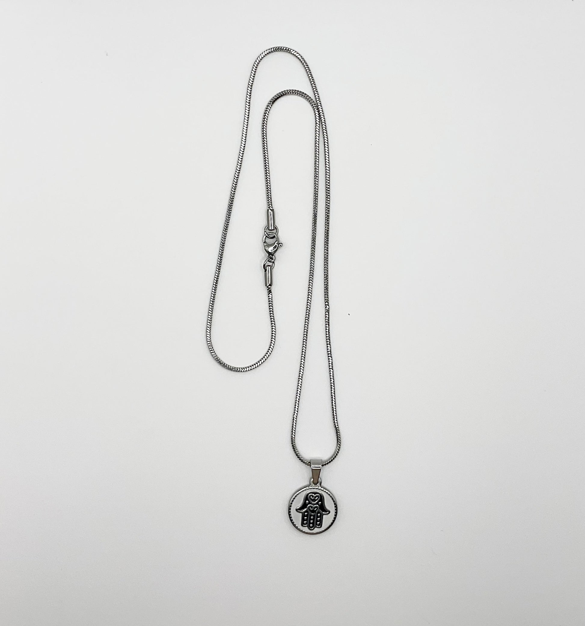 Protect your energy and embrace timeless symbolism with this Stainless Steel Hamsa Hand Necklace. Featuring a finely detailed Hamsa Hand pendant filled with contrasting white and black enamel, this piece symbolizes protection, good fortune, and spiritual balance across many cultures and faiths.