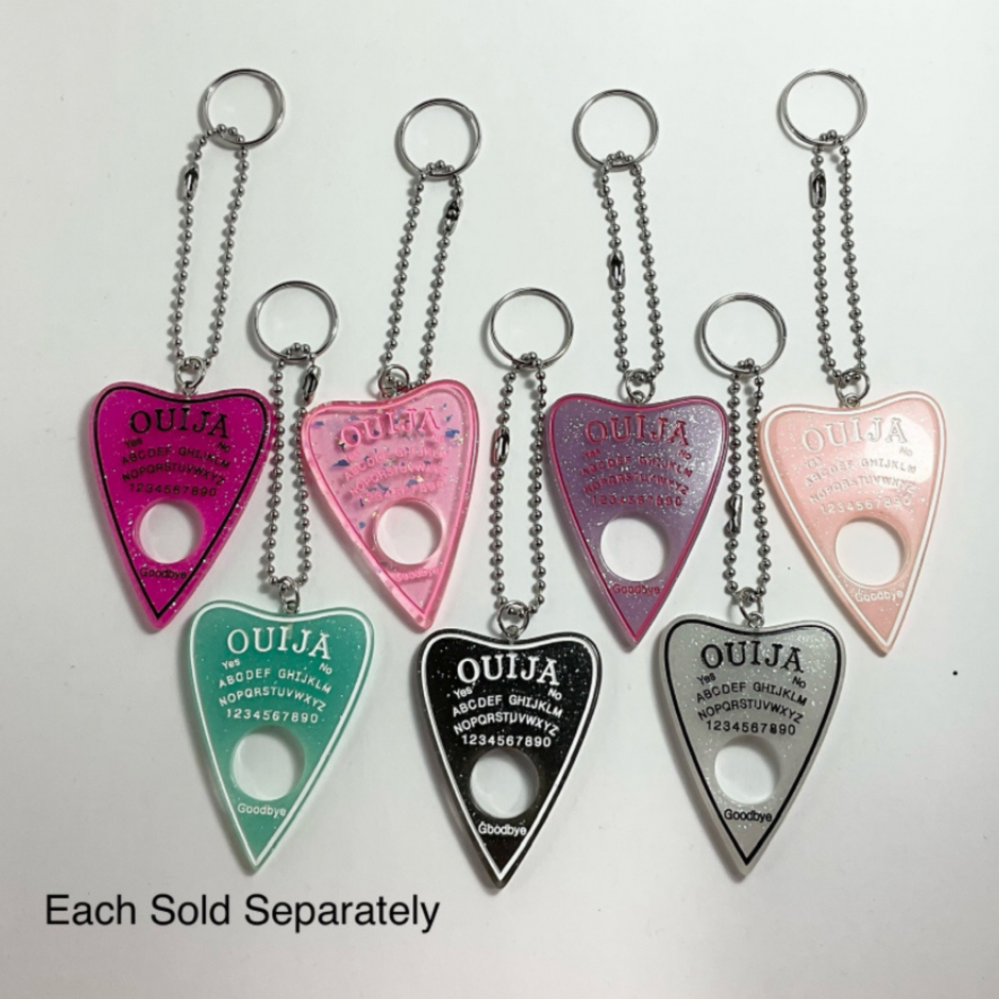 This Adorable acrylic Planchette Keychain comes in 7 colors (make your selection at check out). Each chain is 4.5” and the planchette is 2 1/4" by 1 1/2".