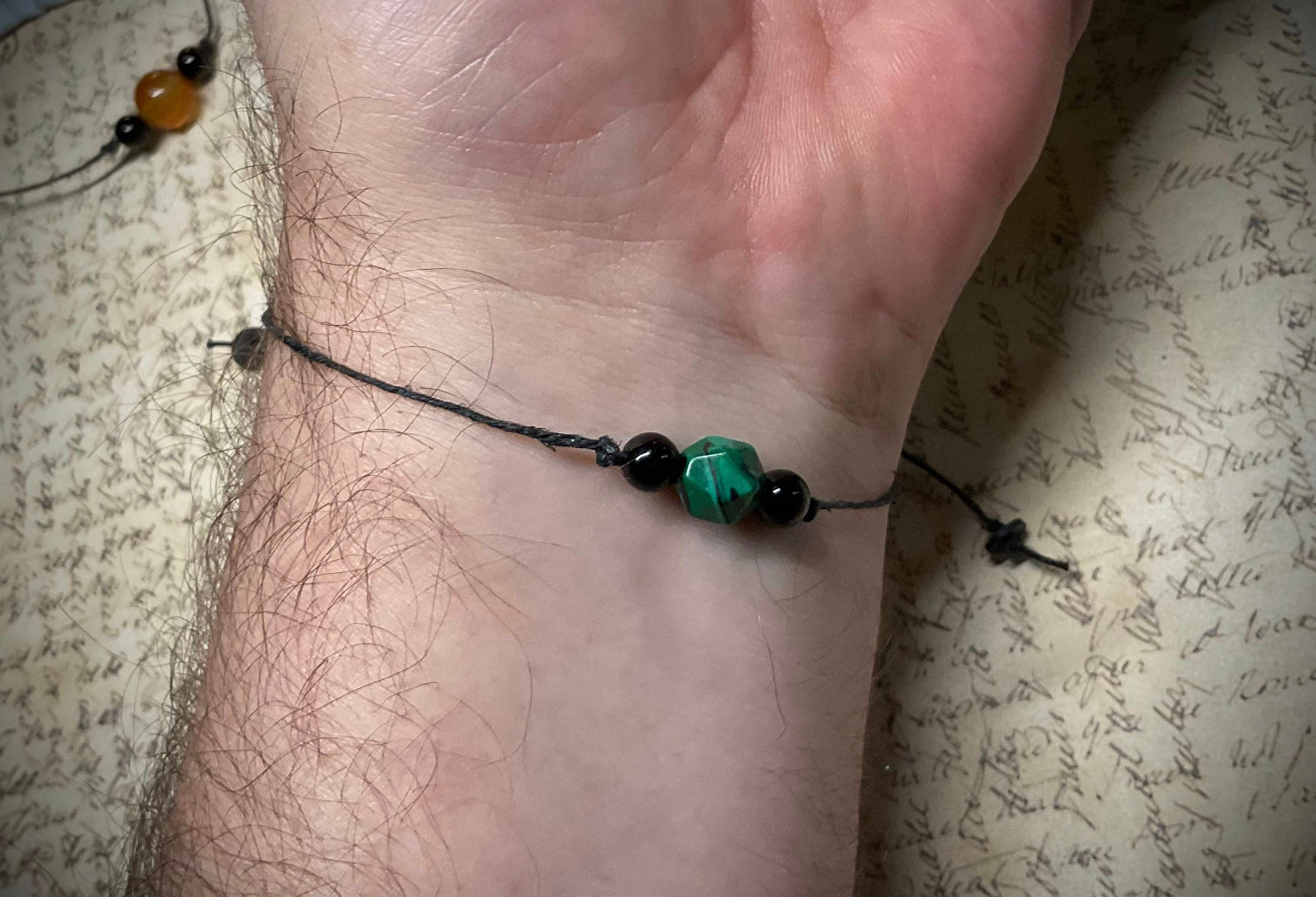 An adjustable Malachite (5mm diamond cut, reconstructed) Bracelet, with two black glass beads (6mm) on slip knot cording.