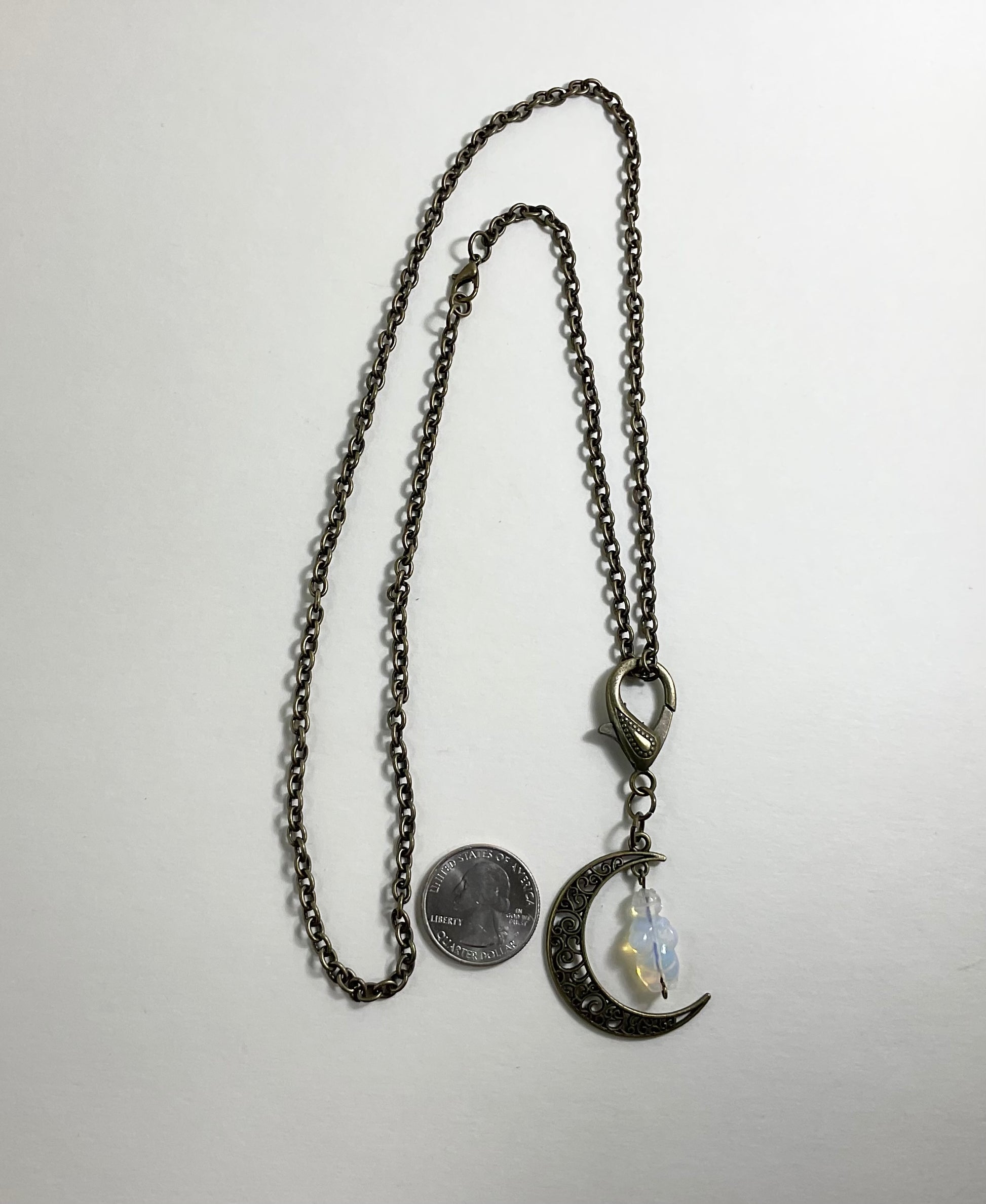 Opalite Moon Goddess Talisman…carved Opalite bead in the image of the Goddess of Willendorf and hanging from a crescent moon in bronze tone metal…pendant is attached to a decorative bronze tone lobster claw (can easily be taken off the chain and worn in other ways or hung in the home as a Goddess ward).