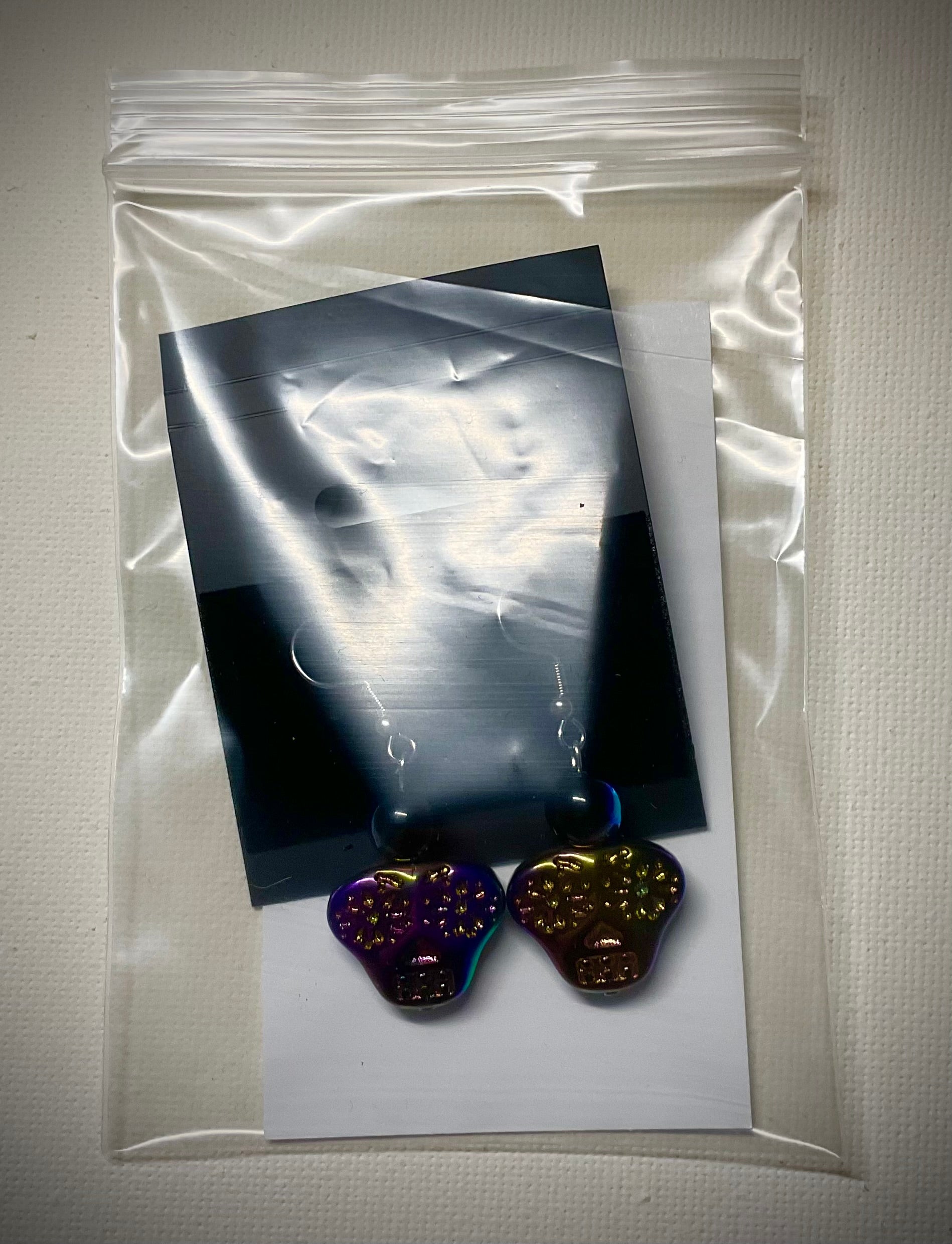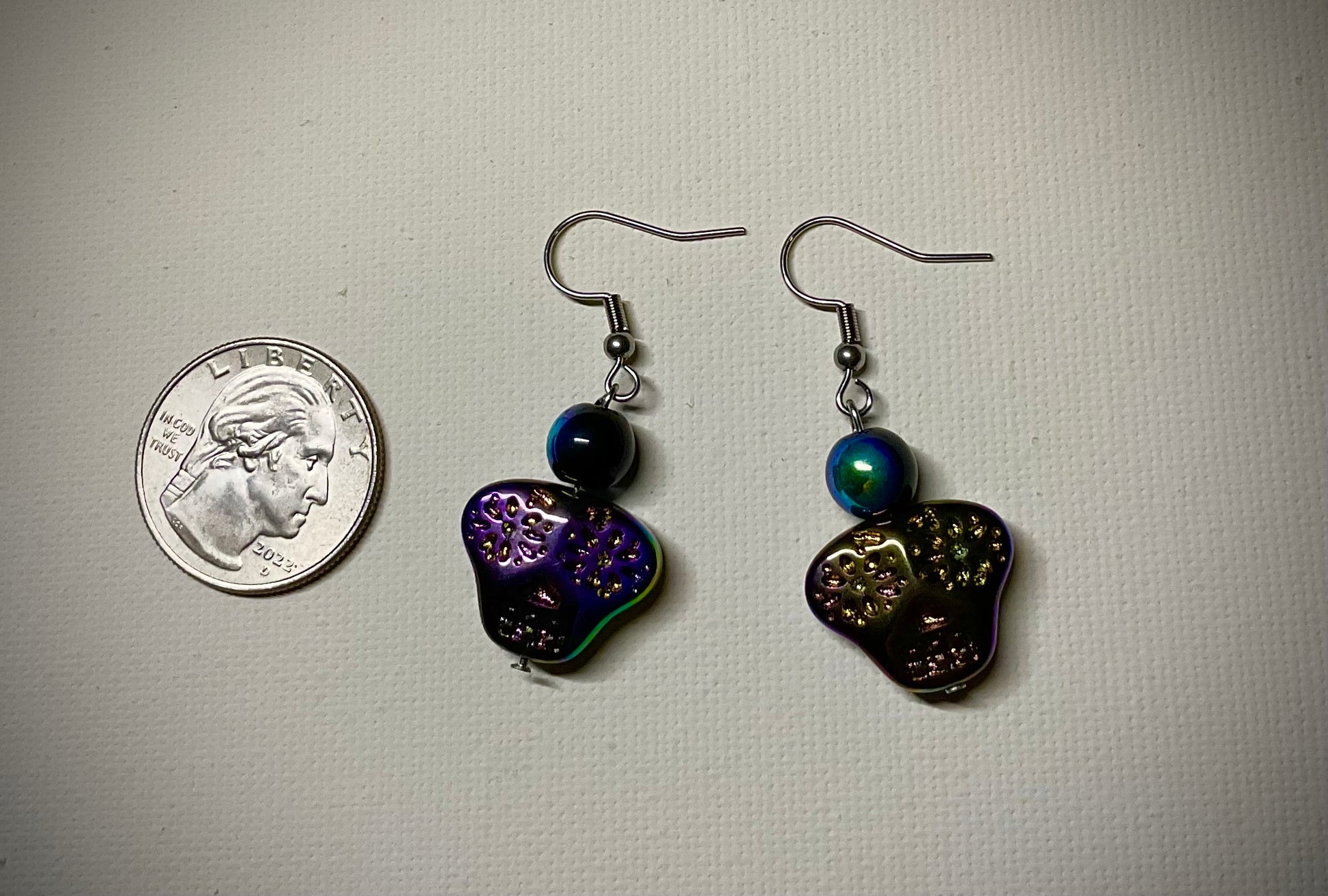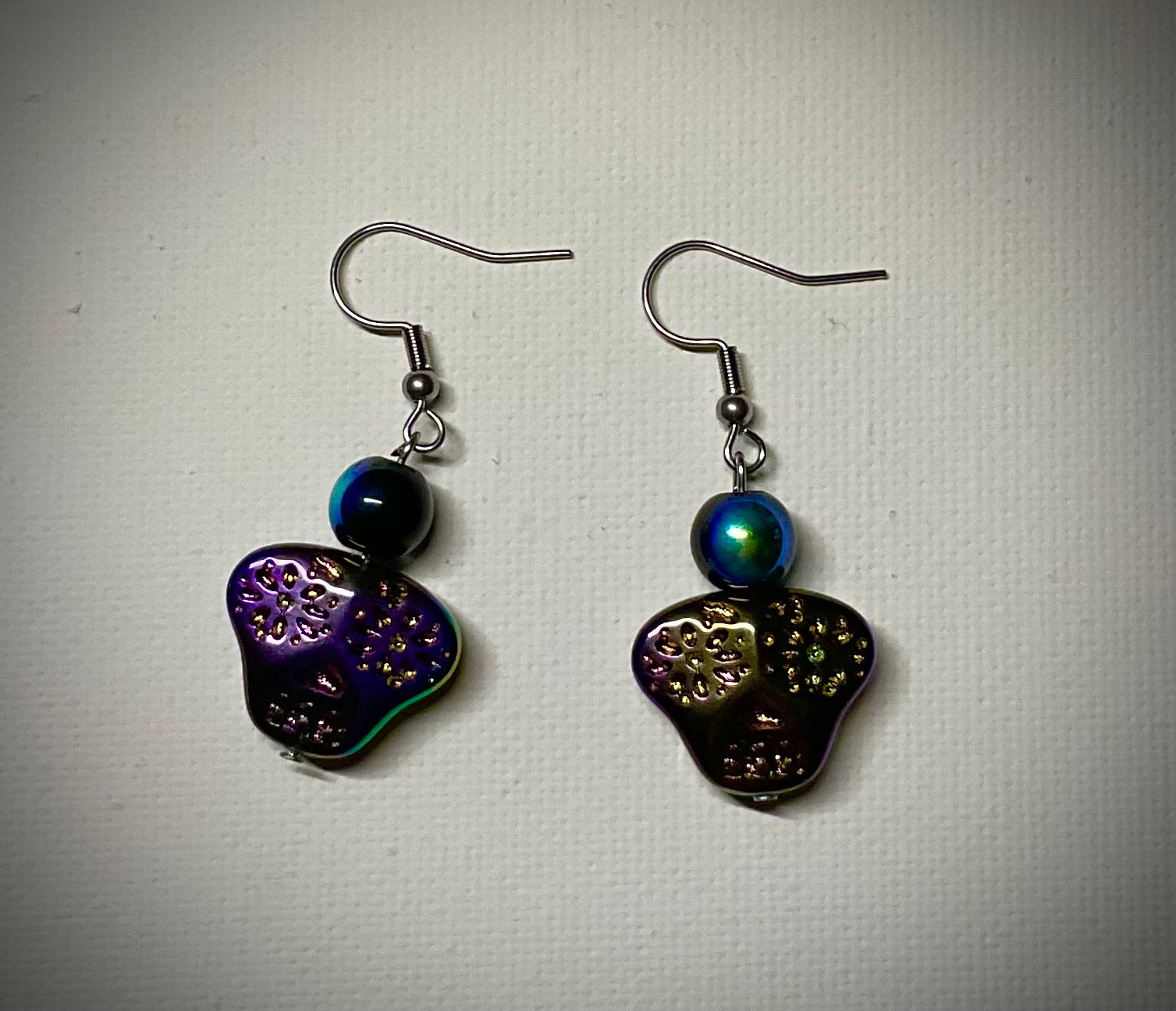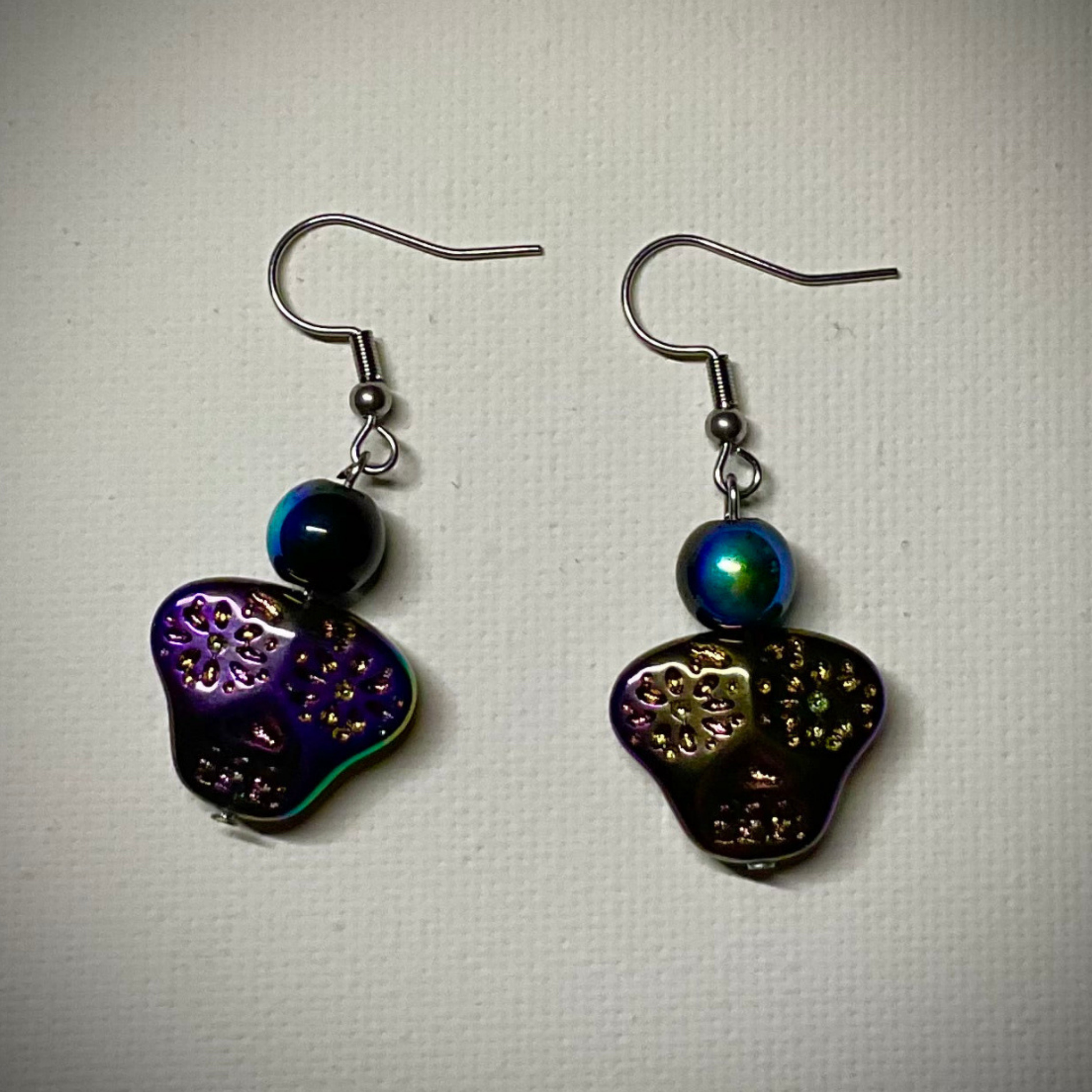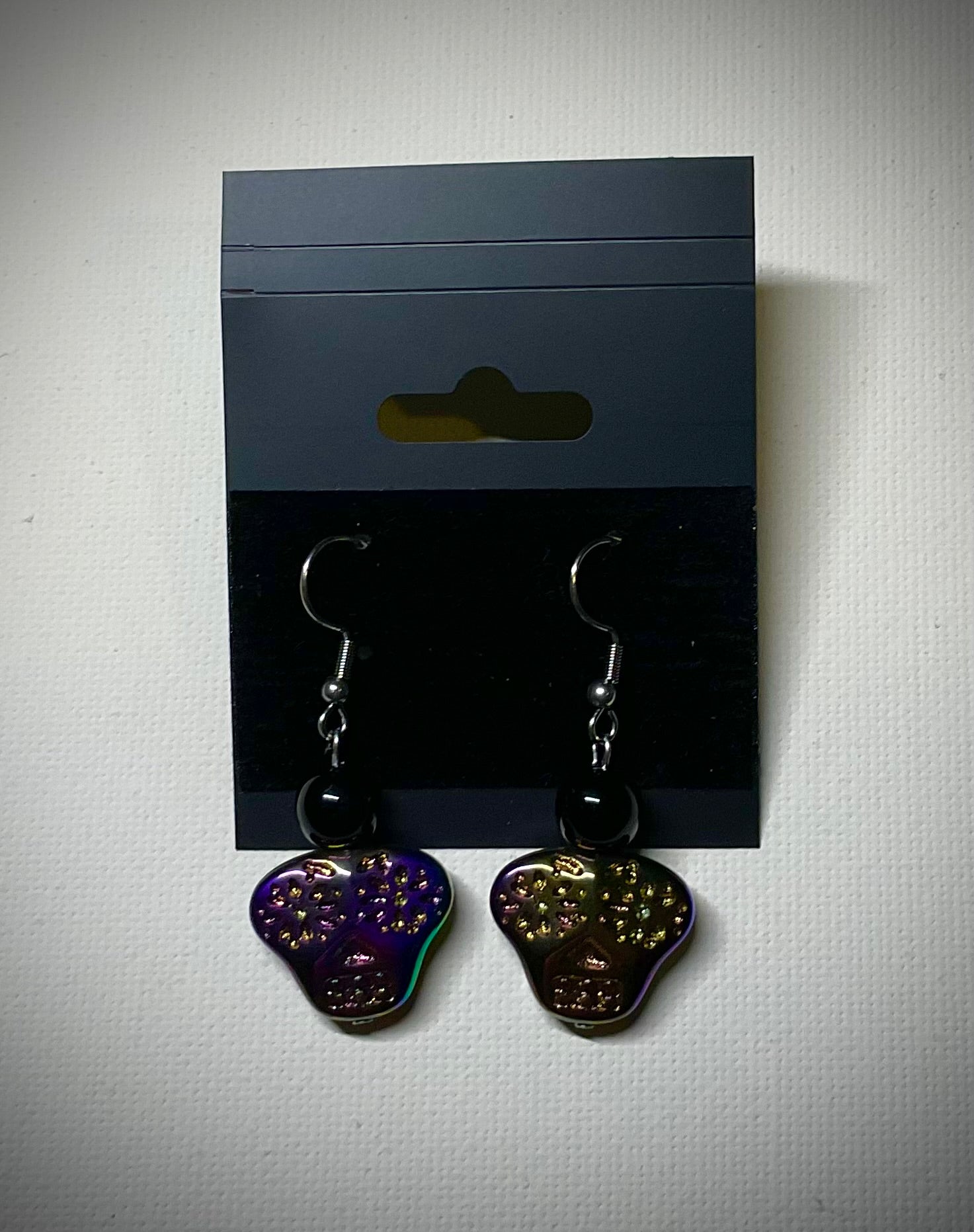 A Simple pair of gorgeous multi color skull dangle fish hook earrings with black iridescent accent beads…a true statement piece.