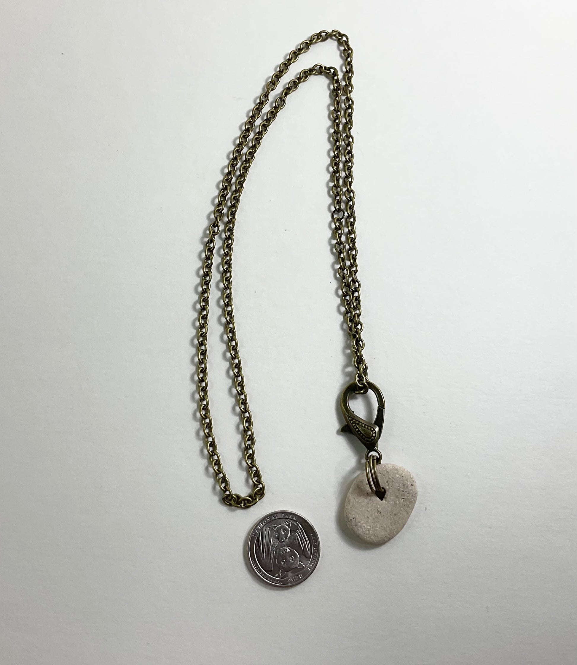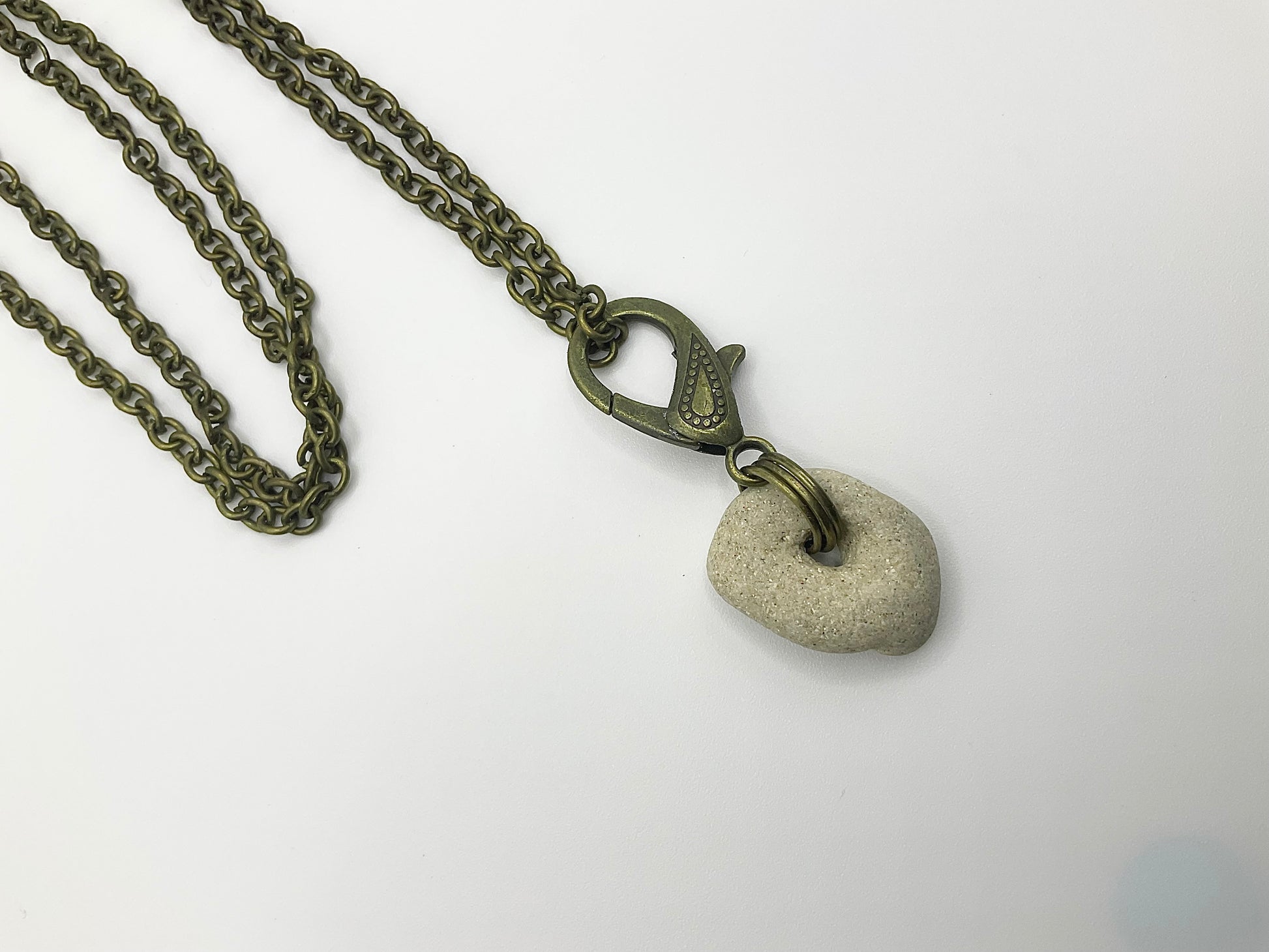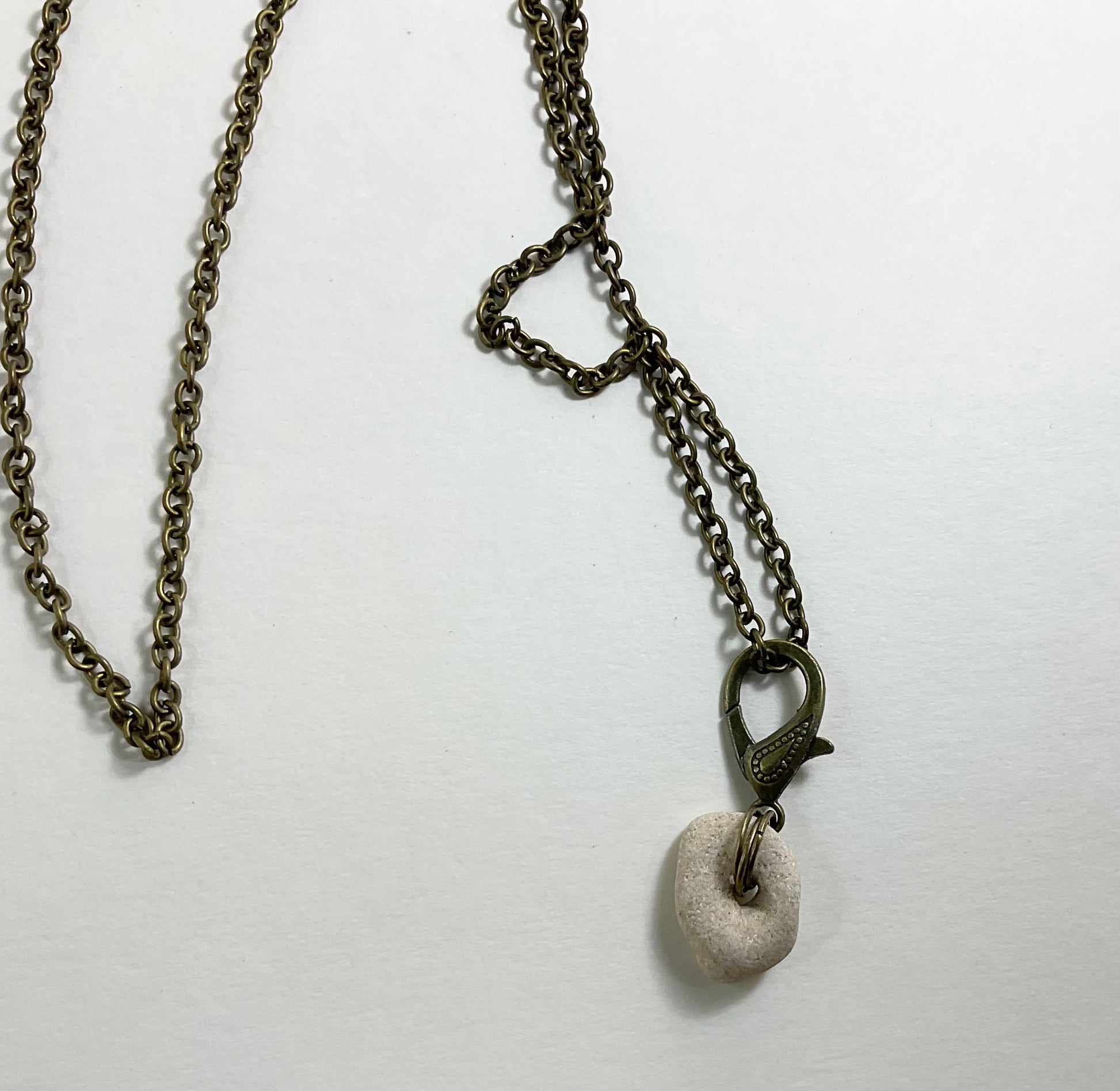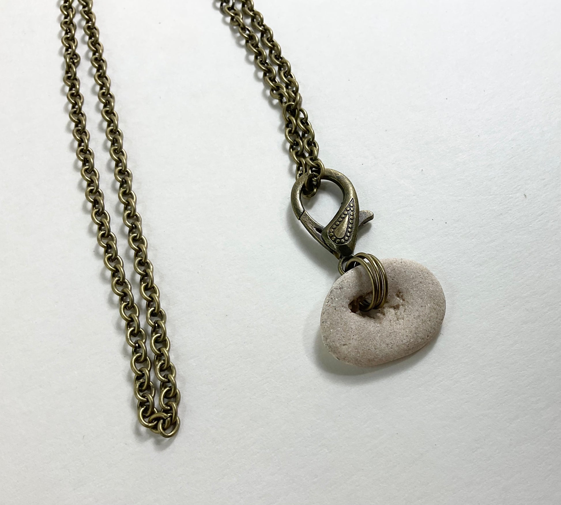 Holey Stone Necklace…also called Hag Stones, Fairy Stones, Odin Stones and by other names as well. Each Stone is approximately 1” in diameter (some variation) and is connected to the chain with a gorgeous decorative bronze tone lobster claw. Holey Stones are created by Water naturally eroding a hole in the stone over vast amounts of time and are found on beaches and by river beds the world over. (These come from the Mediterranean.)