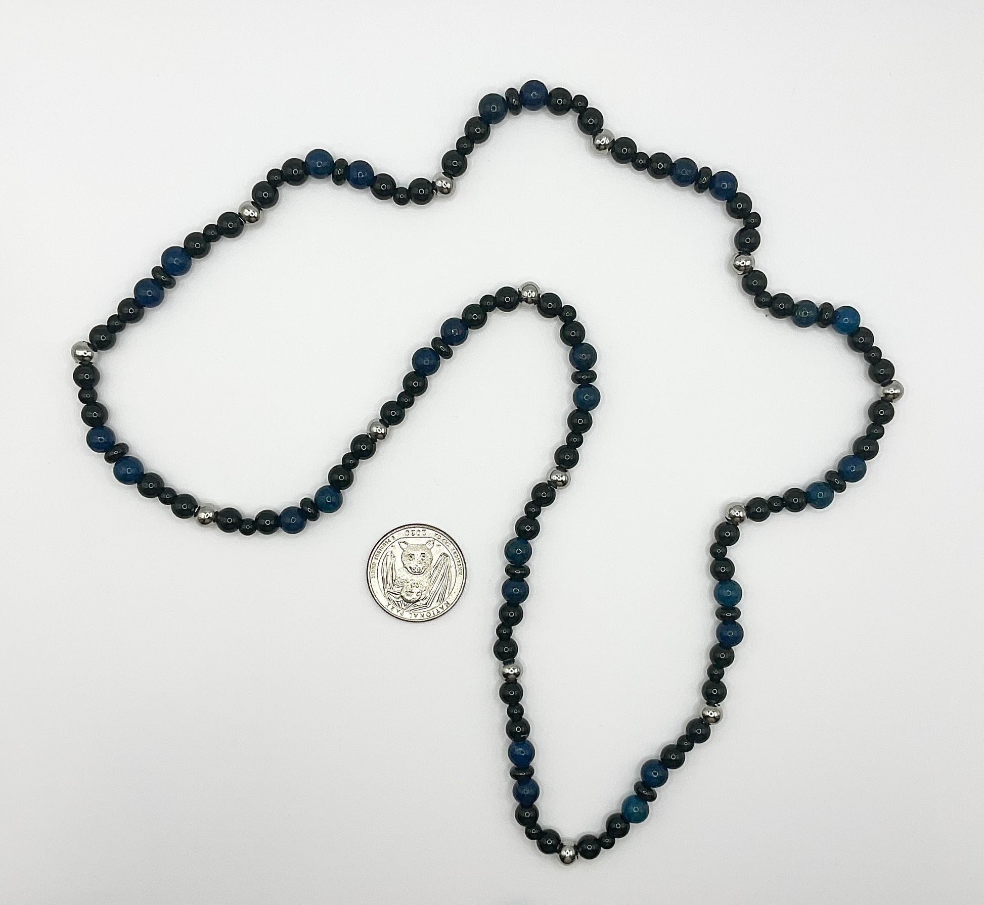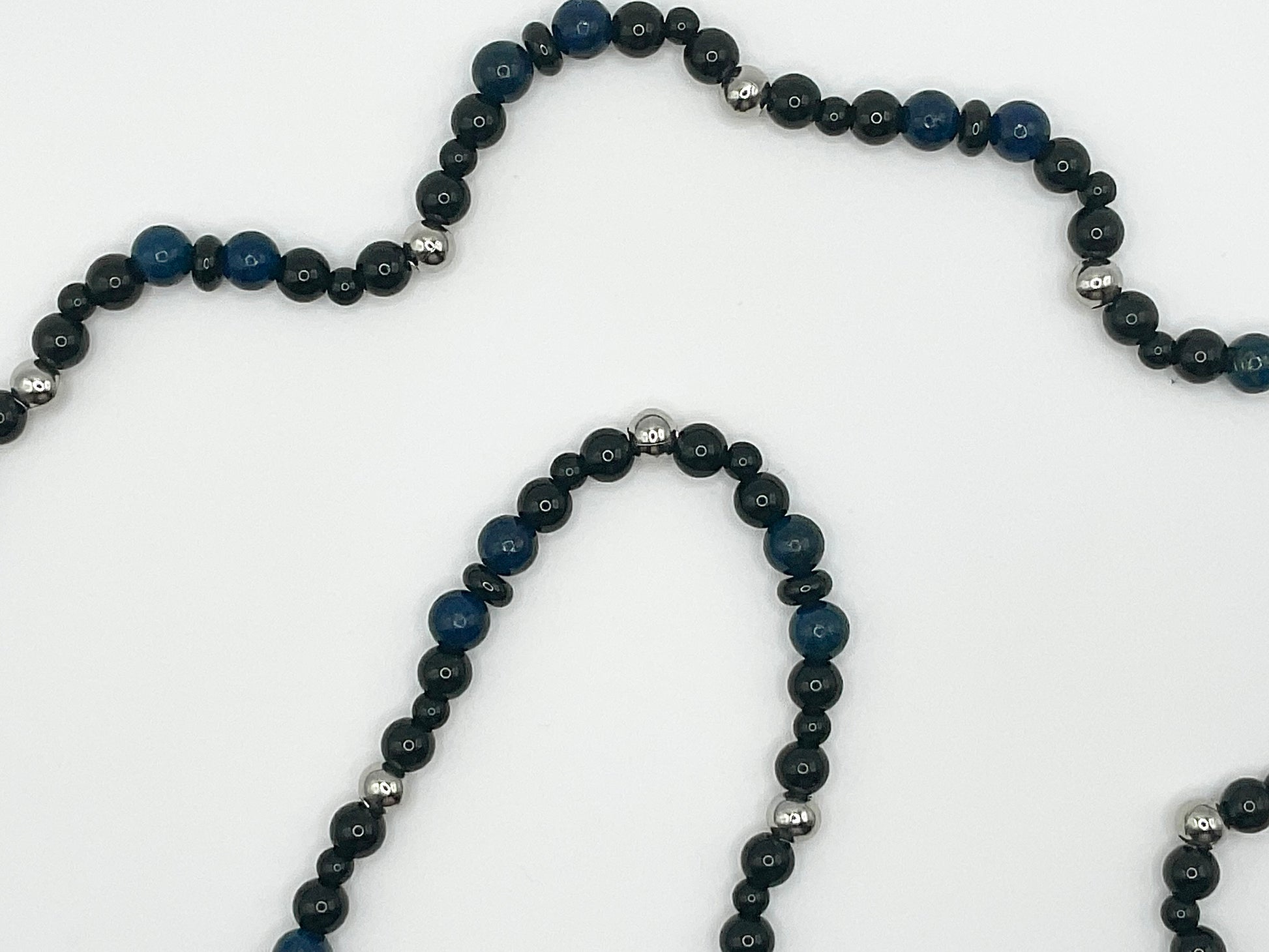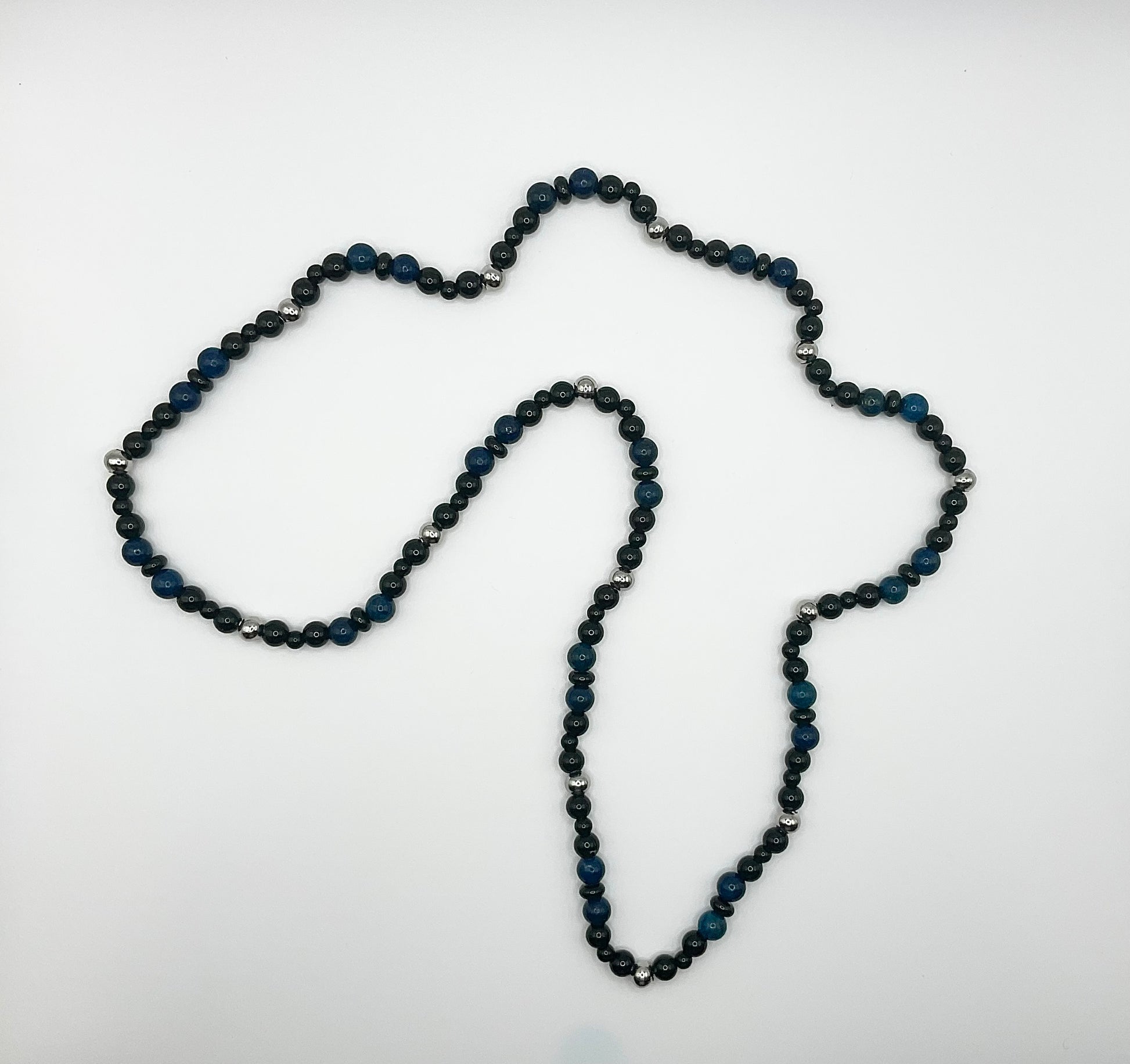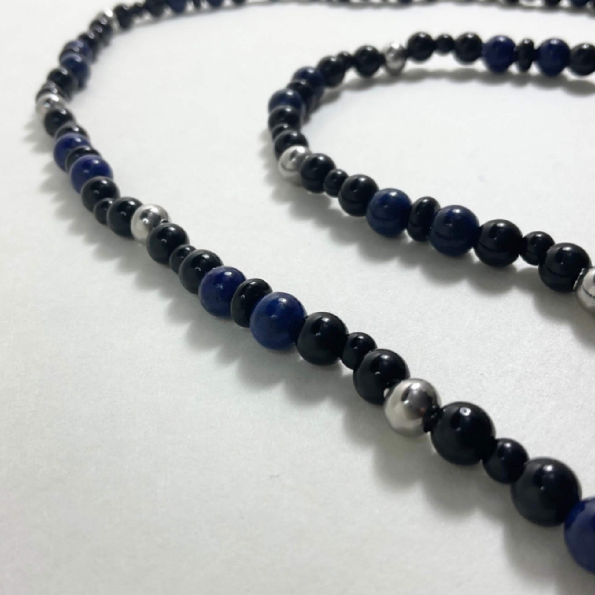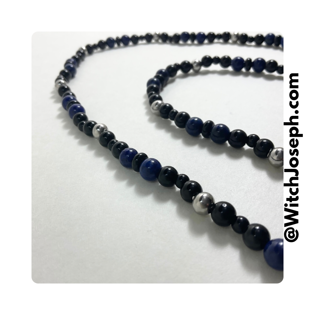 This beaded necklace, lovingly created by Witch Joseph is made from 6mm Steel beads, 6mm and 4mm black glass beads interspersed with 6mm Lapis Lazuli gemstone beads.