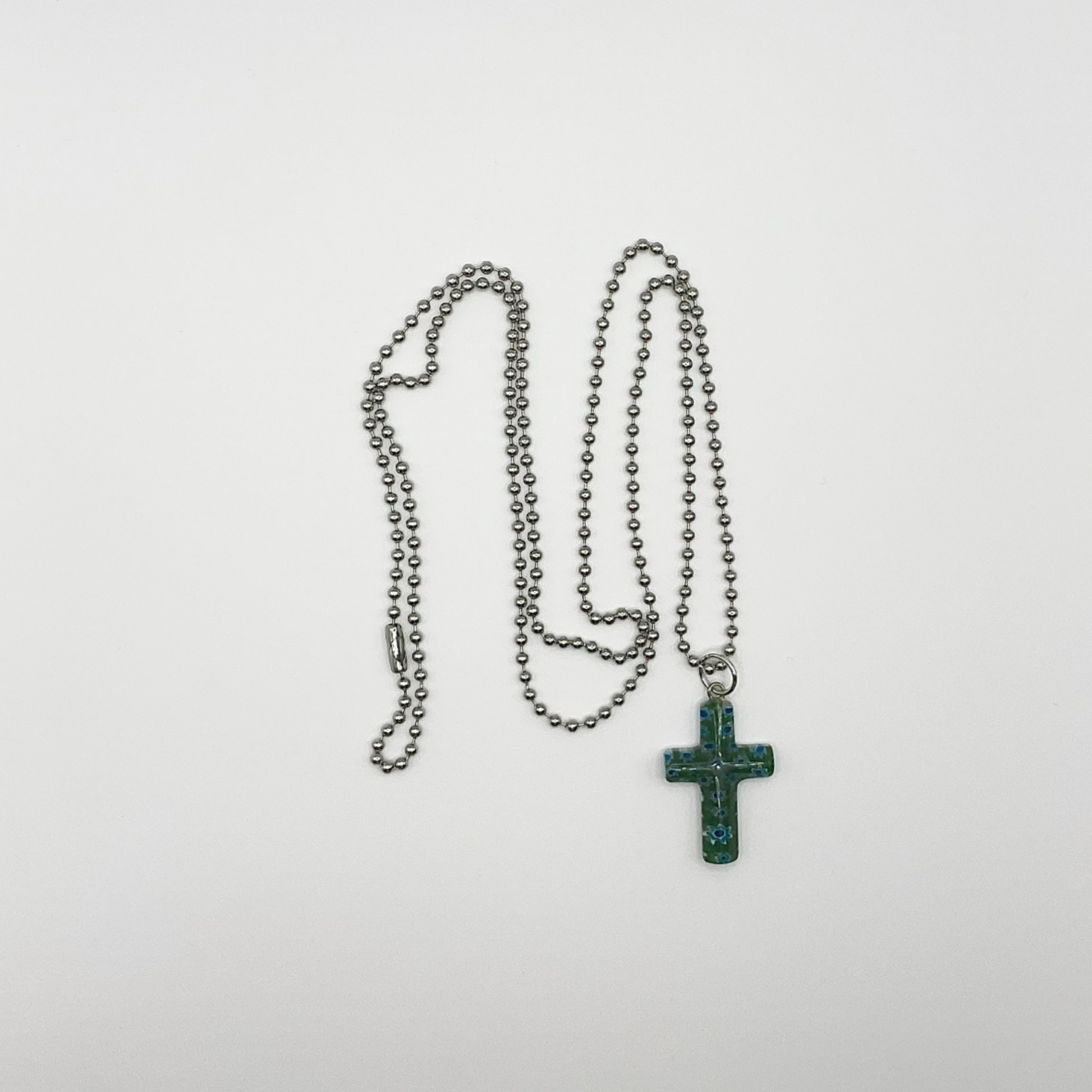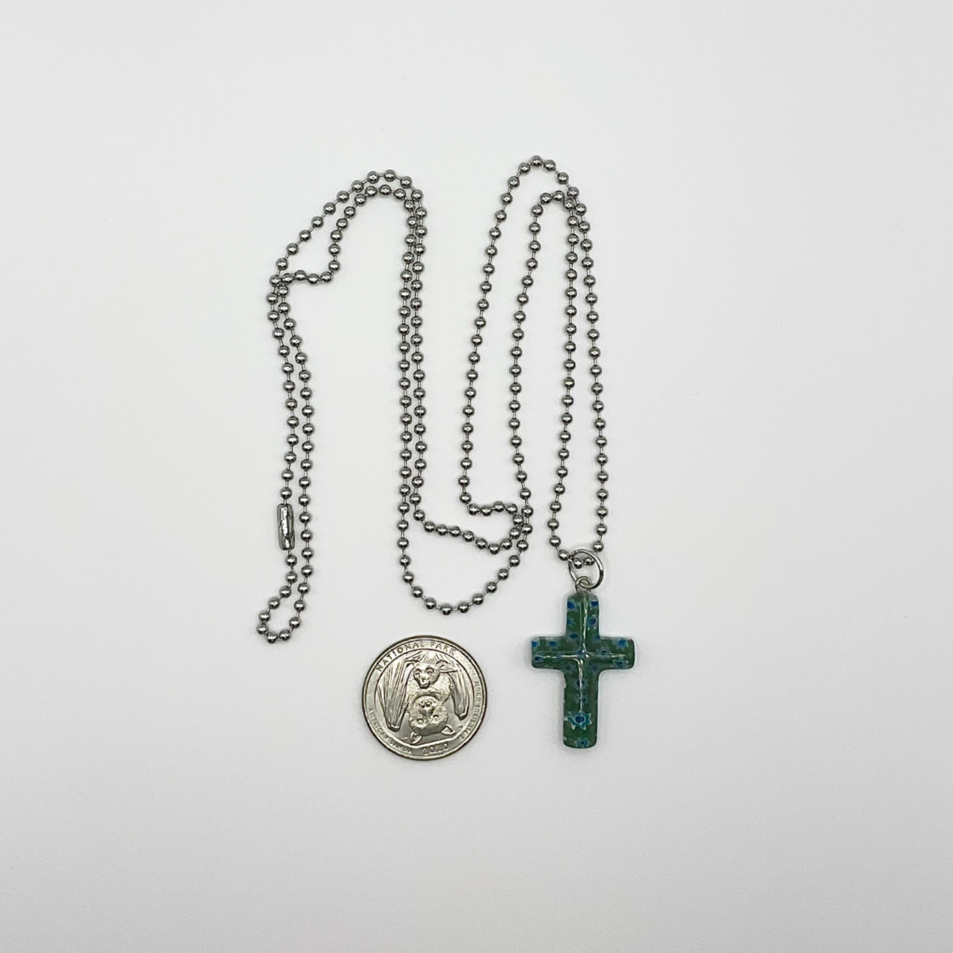 Made of resin, this cross approximately 1” x .5” and comes on a 30” 2.4MM silver tone steel ball chain.