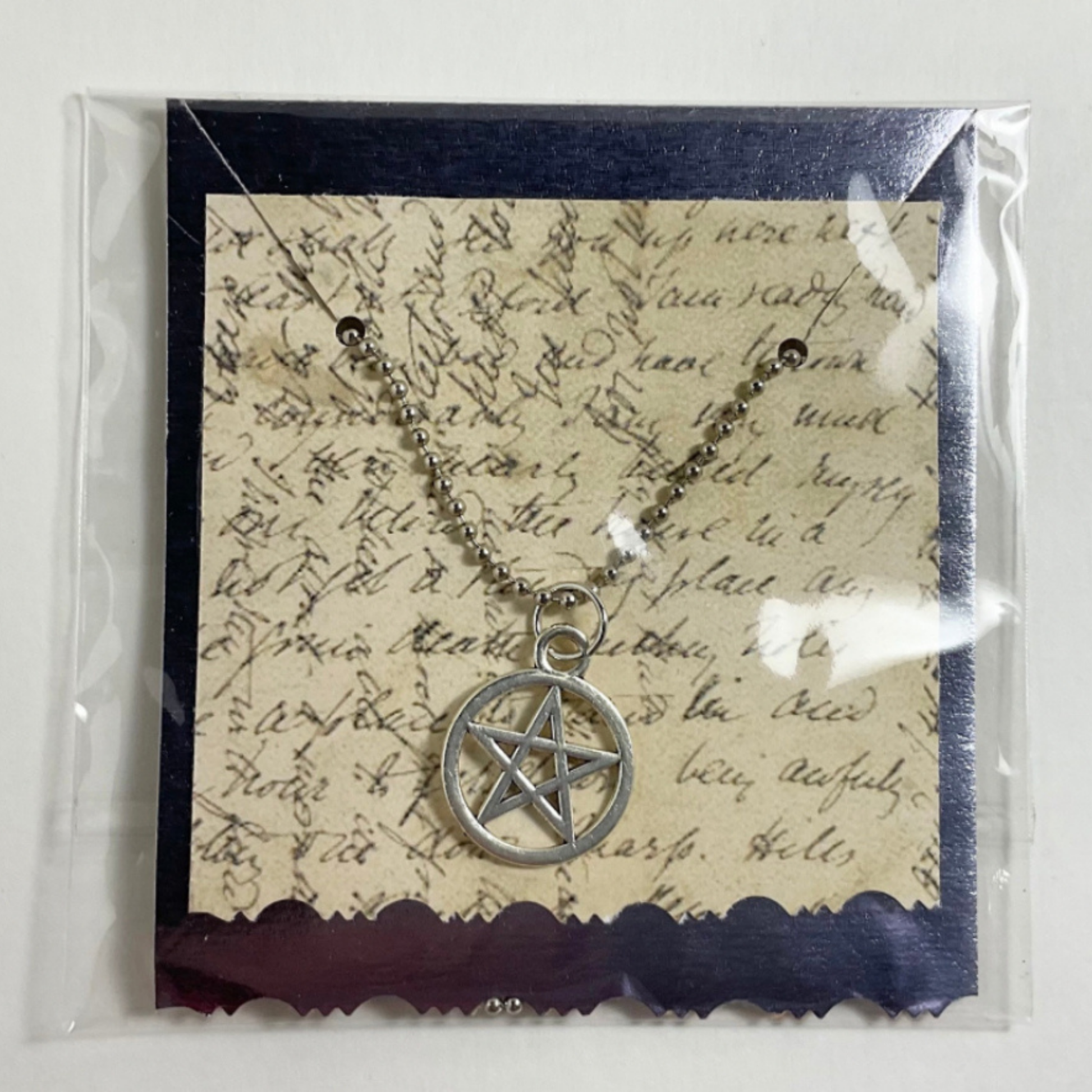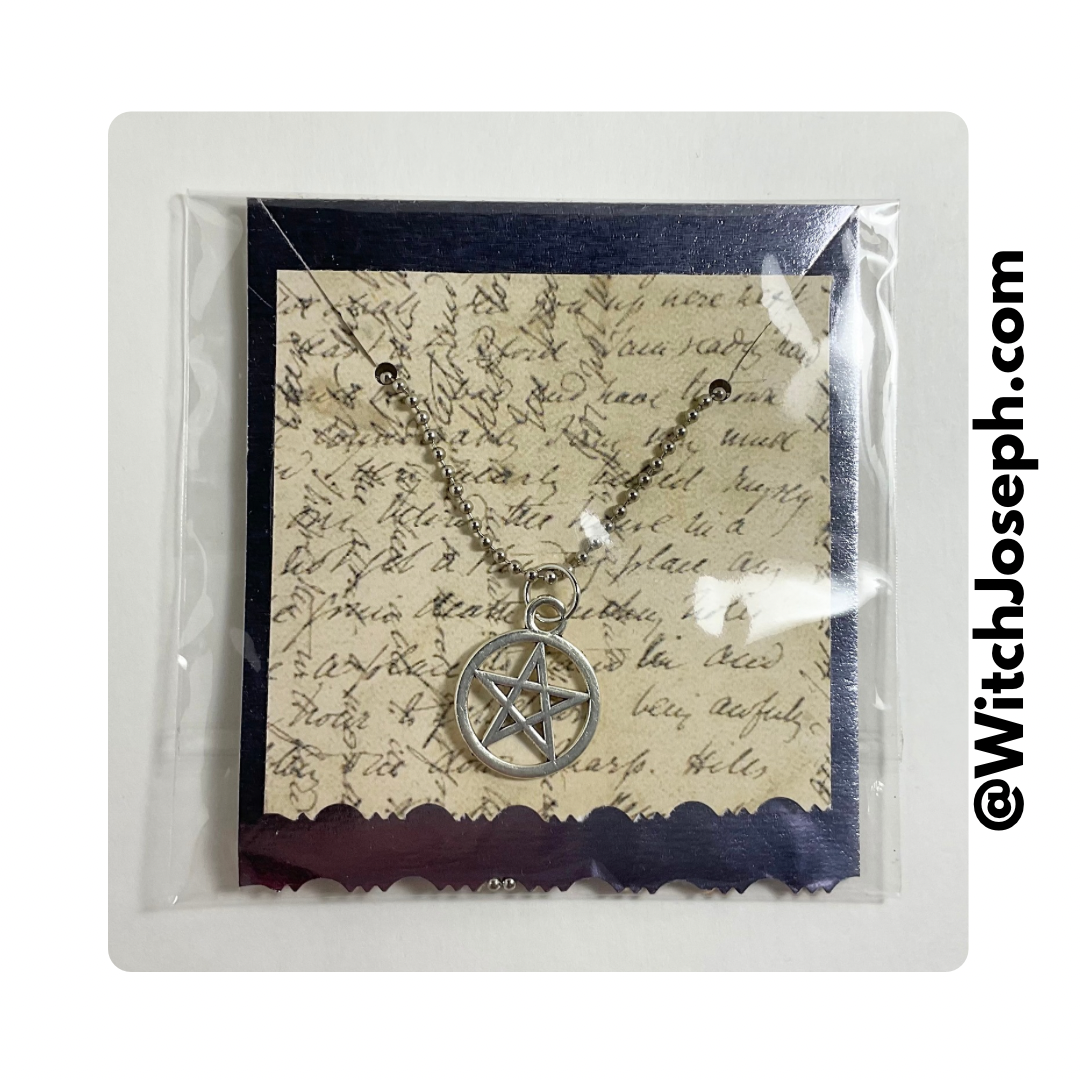 Pentagram Pendant in Silver Tone…the Pentagram is a powerful protection symbol, sometimes symbolizing Witchcraft and the Magickal path itself. It is often seen as an elemental symbol with the four elements Earth, Air, Fire and Water in balance and crowned by the element of Spirit or Akasha symbolized by the upper top point….with the circle of protection and wholeness surrounding these…some practitioners see the human form represented by the five pointed star.