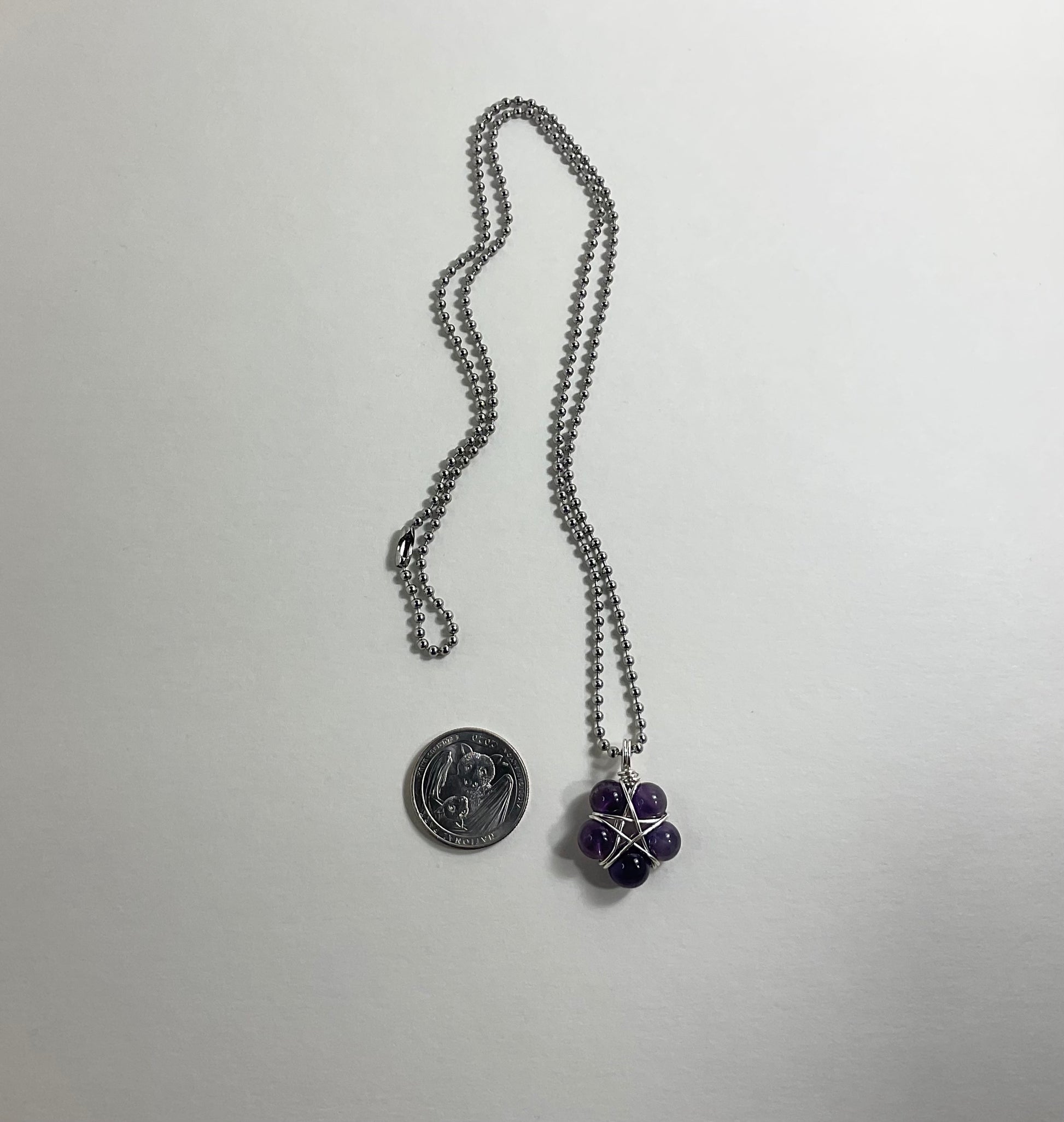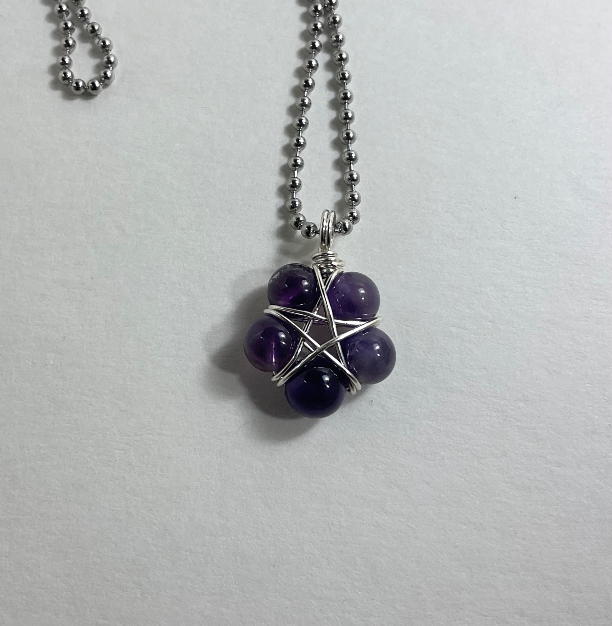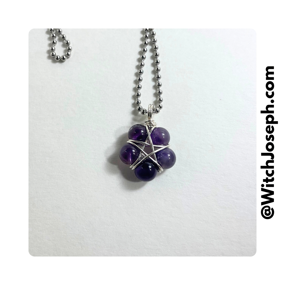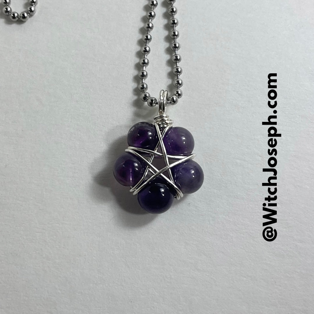 This Pentagram (approximately .750 inch diameter) is lovingly made by Brother Christopher here at Witch House…an amethyst bead (8mm) wire wrap Pentagram using five Amethyst beads and silver tone wire. Charm Necklace comes on a 2.4mm Stainless Steel ball chain (24”).