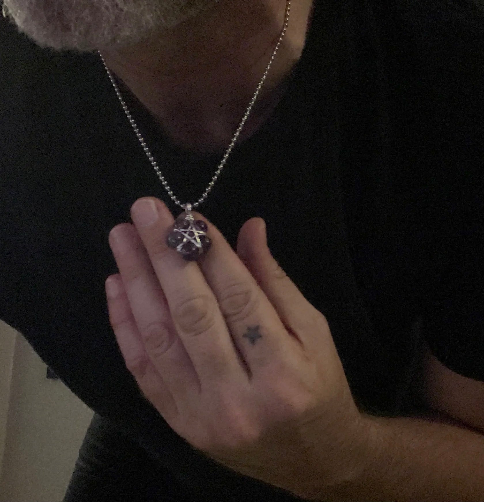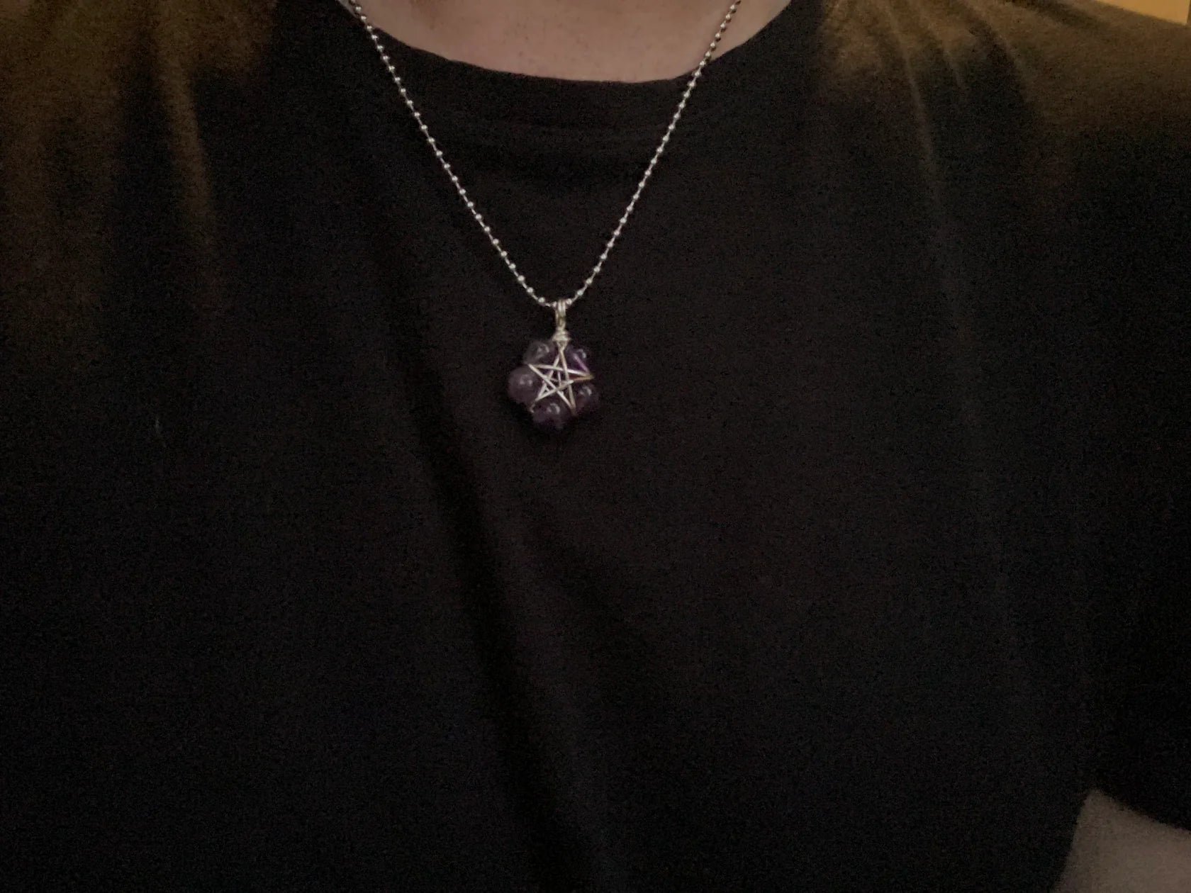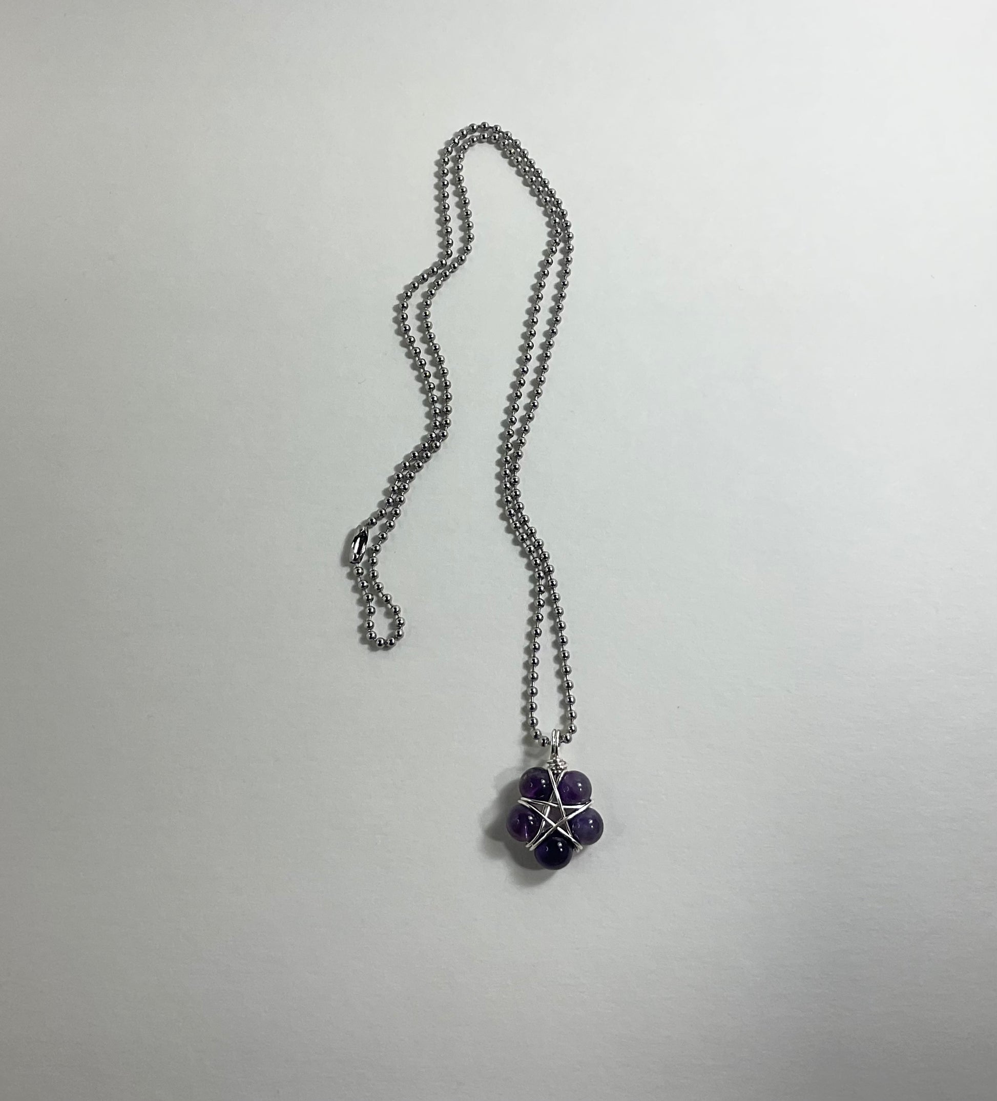 This Pentagram (approximately .750 inch diameter) is lovingly made by Brother Christopher here at Witch House…an amethyst bead (8mm) wire wrap Pentagram using five Amethyst beads and silver tone wire. Charm Necklace comes on a 2.4mm Stainless Steel ball chain (24”).